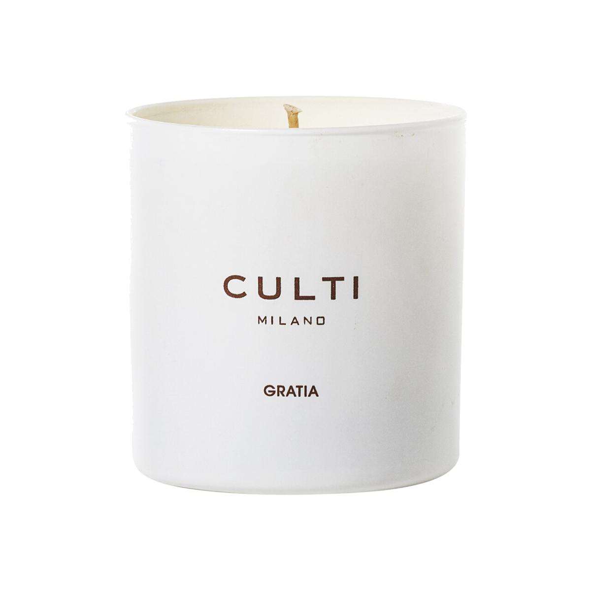 Indulge in an intense moment of inner peace with the Gratia scented candle from Culti. A blend of sweetness, the fragrance mixes notes of rhubarb, rose and patchouli to recreate the feeling of a blissful walk in a blooming rose garden one warm May afternoon. In a crisp white glass vessel, this floral scented candle made from natural wax is a fitting tribute to the beauty of spring. Pair with the matching fragrance diffuser from the Gratia collection. Key features: * Natural wax candle * Material: glass * Dimensions: Ø9xH9.5cm * Burn time: 40 hours (approx.) * Fragrance notes: rhubarb, centifolia rose, patchouli * Fragrance family: floral * White vessel * Perfect for spring or summer