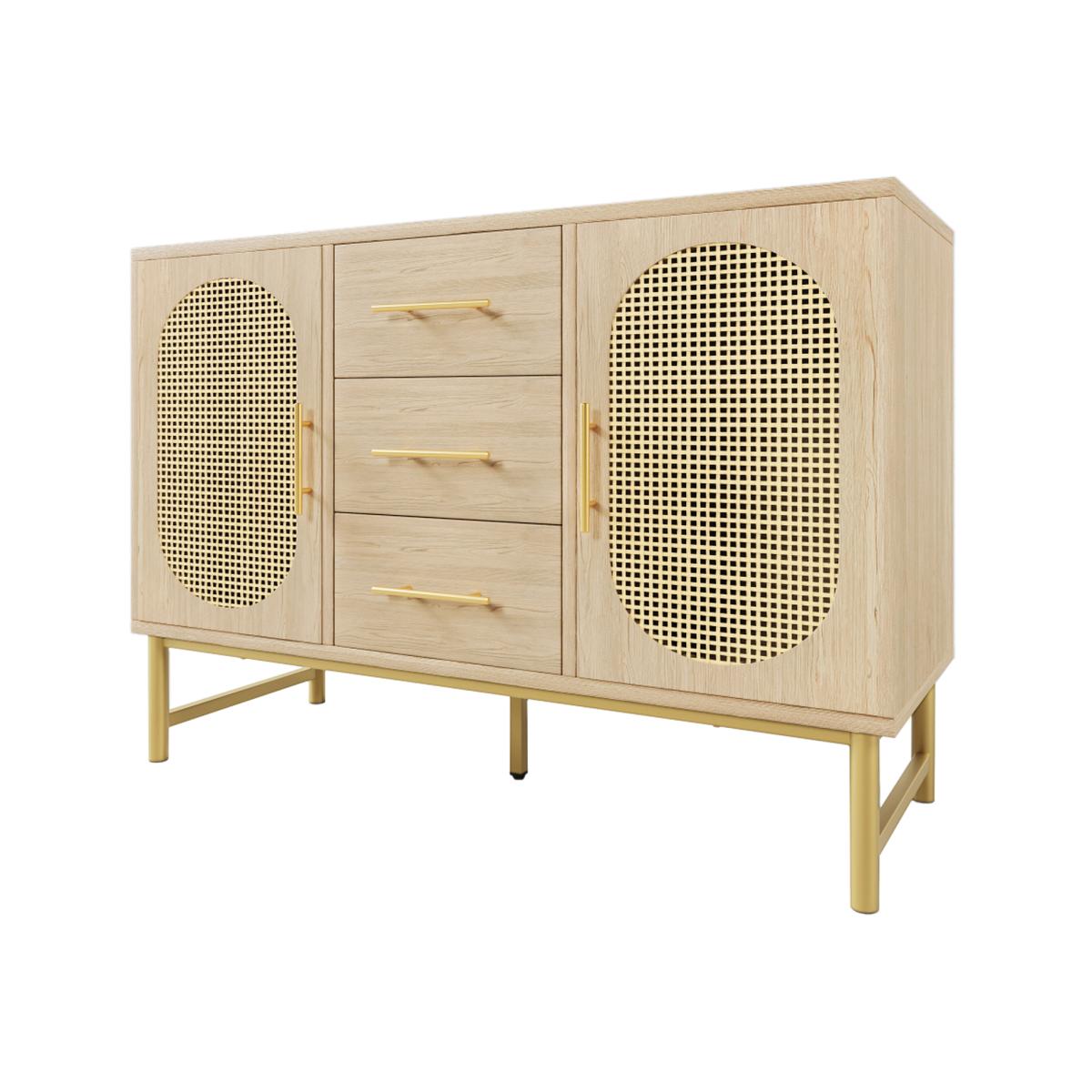 Stylish Woven Rattan Design,his storage cabinet combines faux woven rattan mesh with a wood grain veneer,offering a natural yet modern touch. The rattan cabinet is not only perfect for bedrooms but also serves as a storage solution for living rooms or offices. Ample storage space,The six-drawer chest of drawers has a functional design to meet all your storage needs. Featuring six drawers with internal diameters of H10,B52.5,T29 cm, the chest of drawers provides plenty of storage space for your daily use and keeps things neat and organised. In addition,the smooth tabletop is a great place to display photos and decorative items. deal 17 cm floor clearance and height adjustable metal support feet The chest of drawers has a floor clearance of 17 cm,which makes daily cleaning easier. The centre support leg is height adjustable and equipped with a pad that protects the floor and at the same time ensures the stability of the chest of drawers. This allows it to adapt to different floor conditions. Robust and durable materials,The handles and supporting feet of the chest of drawers are made of metal,which ensures durability and stability. The body is made of environmentally friendly chipboard anf MDF,which is lightweight and robust at the same time. These materials provide excellent load bearing capacity and durability for everyday use. Simple assembly and safe design,The product is supplied in two packages and includes simple assembly tools. Assembly is uncomplicated and quick. The chest of drawers is also equipped with an anti-tilt device to ensure safety - particularly suitable for households with children or pets.