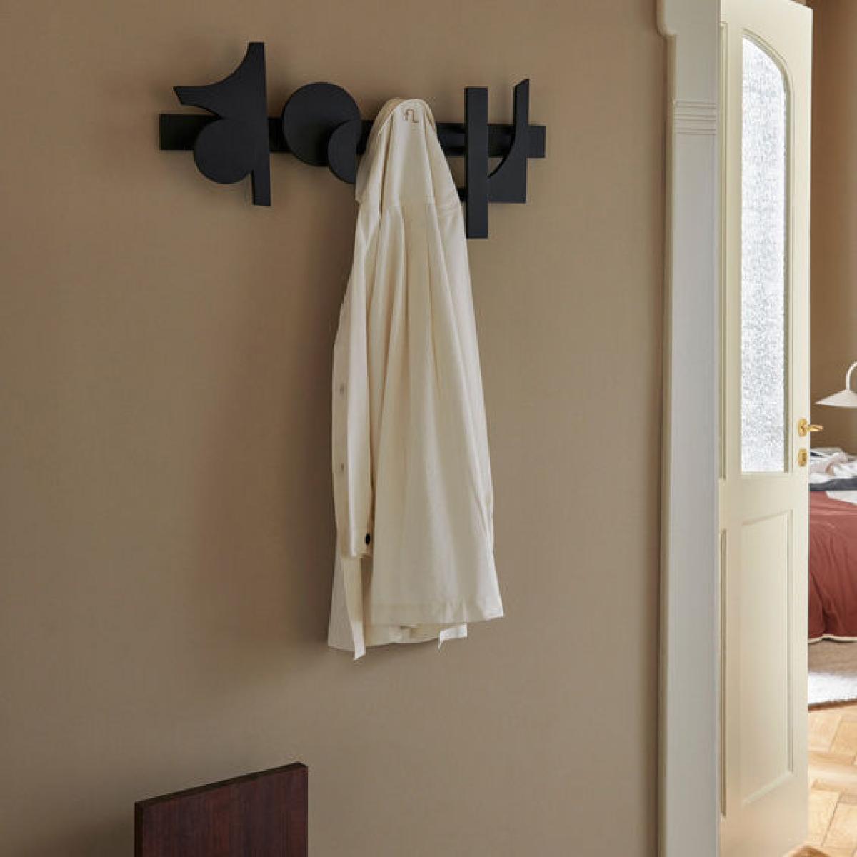 A true wall sculpture, this black lacquered beech coat rack decorate the wall in a graphic way while remaining functional. The simple, geometric shapes slot together on several levels, creating a rhythmic composition. Each of the shapes acts as a hook on which you can stylishly hang bags, coats and hats.