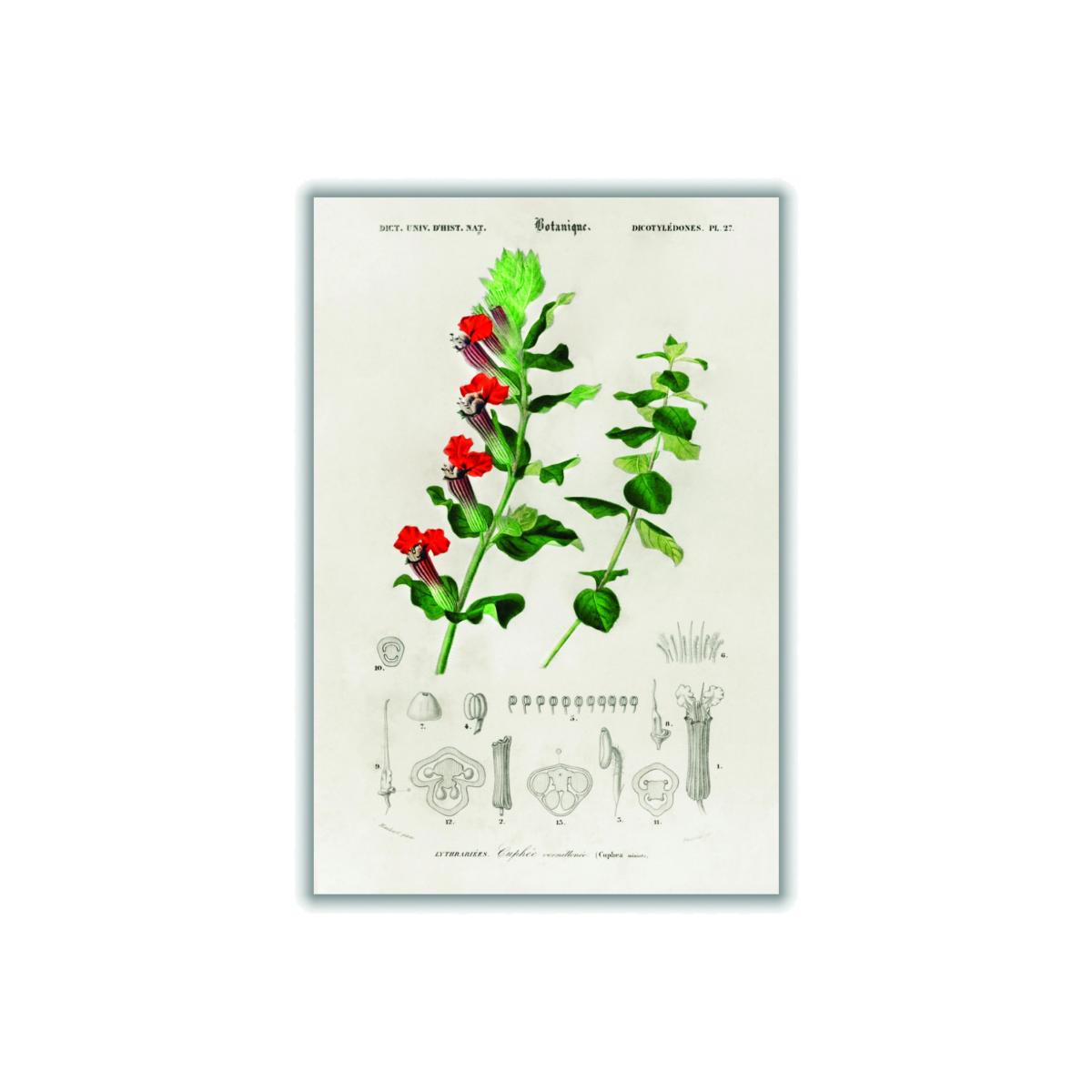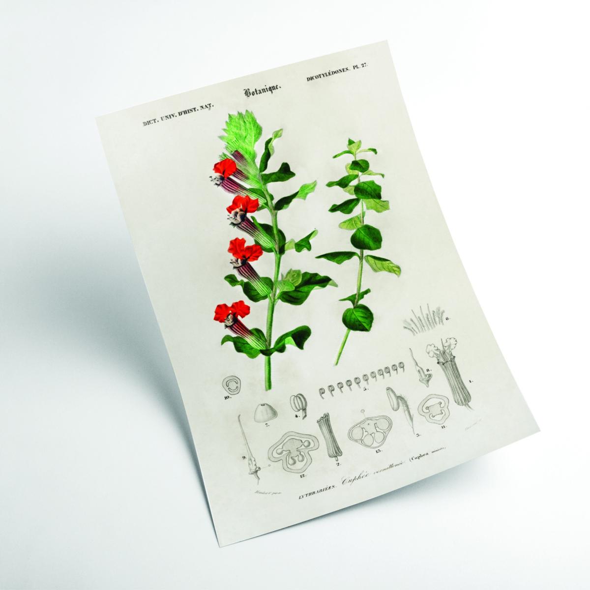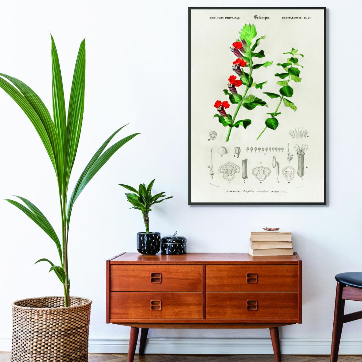 I love the Cuphea Miniata Print because of its botanical charm and scientific aesthetic, which can add a touch of natural intrigue to both modern and traditional interiors. It works particularly well in kitchens, home offices, or even a contemporary living space where its colour accents can be highlighted against neutral backgrounds. For styling, consider framing it in a simple, understated frame to keep the focus on the detail, and group it with other botanical or vintage prints for a curated look. Additionally, it pairs nicely with greenery or raw wood elements, helping to create a cohesive and stylish natural theme.