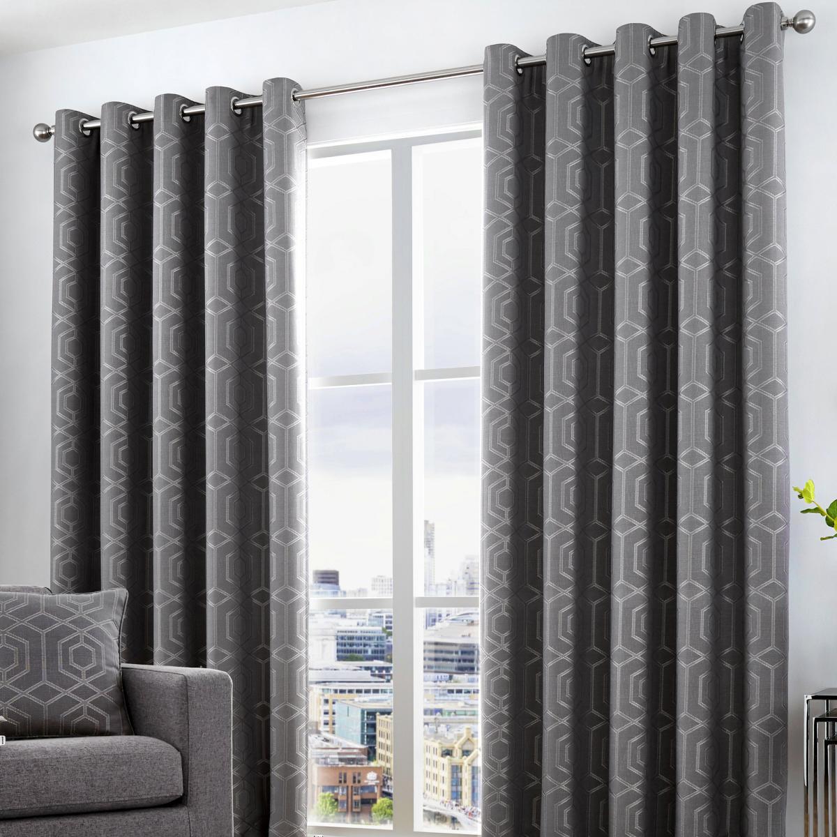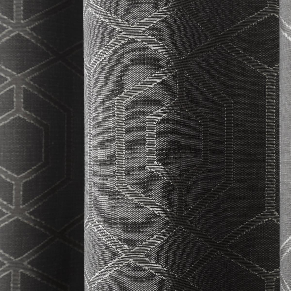 * 1 pair - includes 2x curtain panels* Heavyweight jacquard curtains* Eyelet header Cool, contemporary room layouts are the perfect setting for this quality heavyweight jacquard curtain with its dramatic geometric design. Featuring a deep graphite background and modern detailing, these curtains would complement a variety of colour schemes. This stylish pair of curtains also features an eyelet header for easy installation and is fully lined to help improve insulation and light filtration. A matching cushion is also available to help you create a coordinated look. Please note, pattern matching cannot be guaranteed across multiple pairs of curtains. This Collection is verified by OEKO-TEX and independently tested for harmful substances. It stands for customer confidence and high product safety. The size of the curtains shown is the size of 1 panel, you will receive 2 panels of this size. Choose the width that is closest to your pole length for full look.
