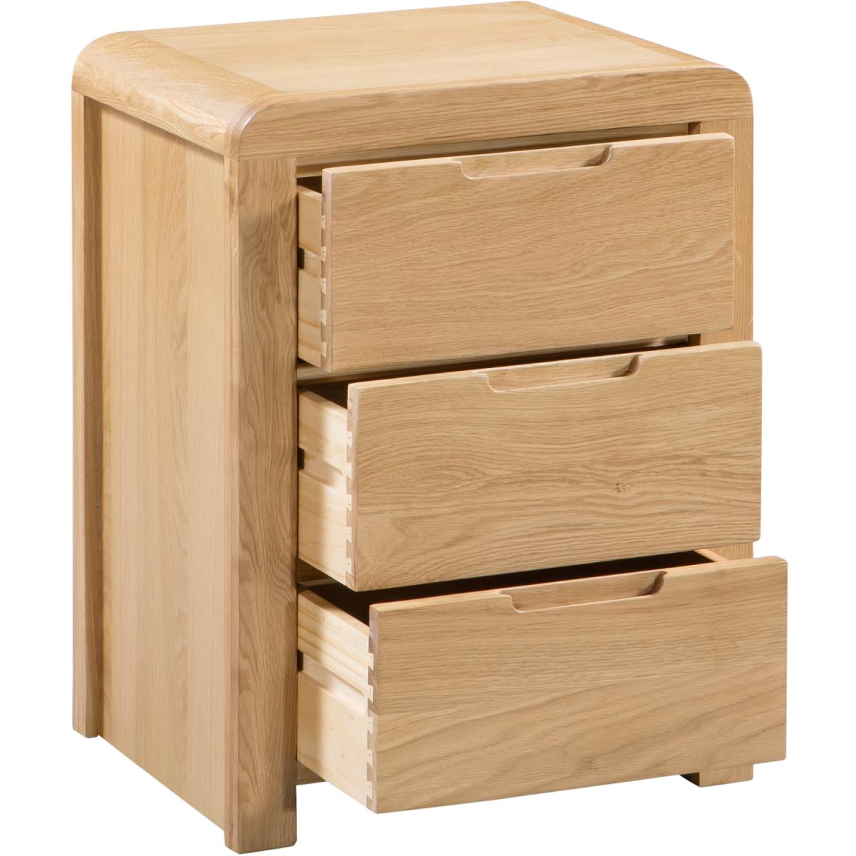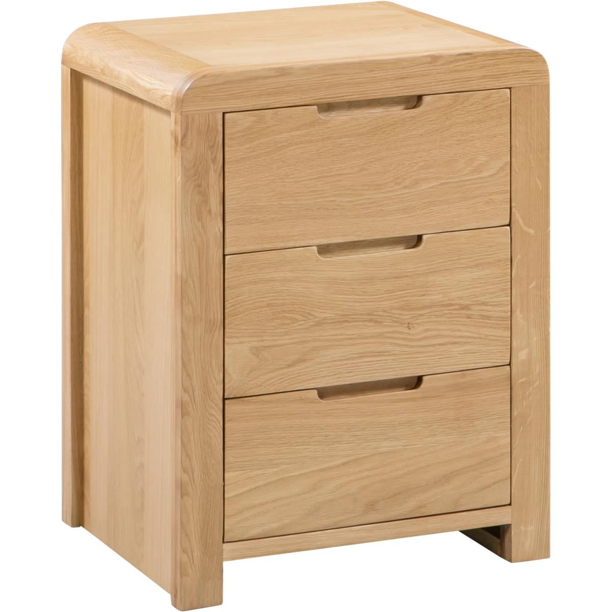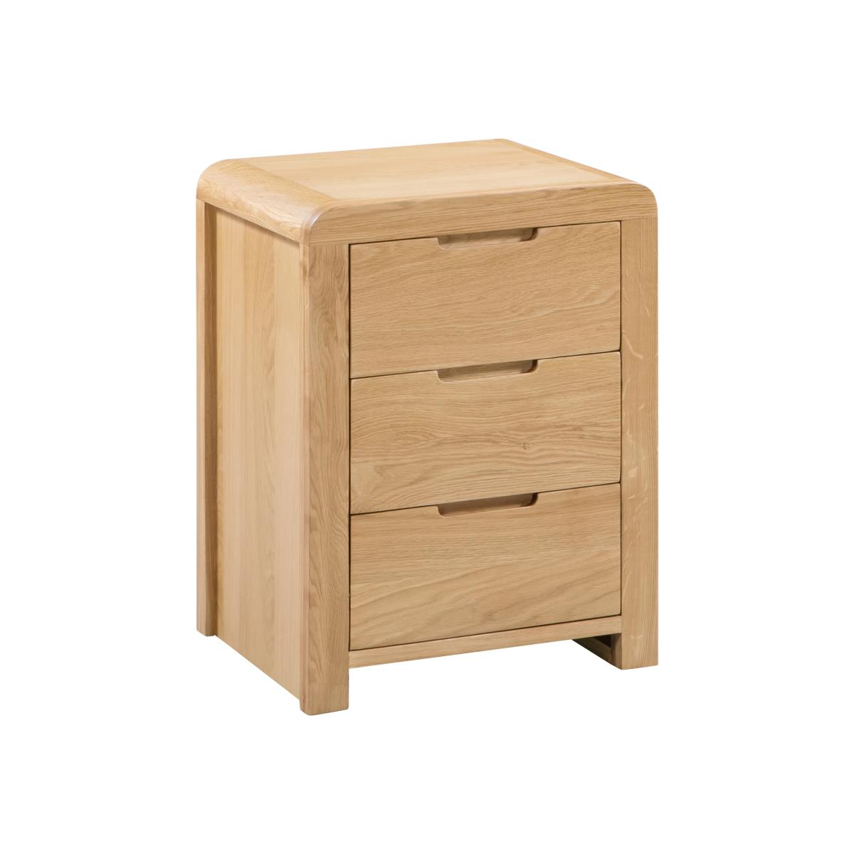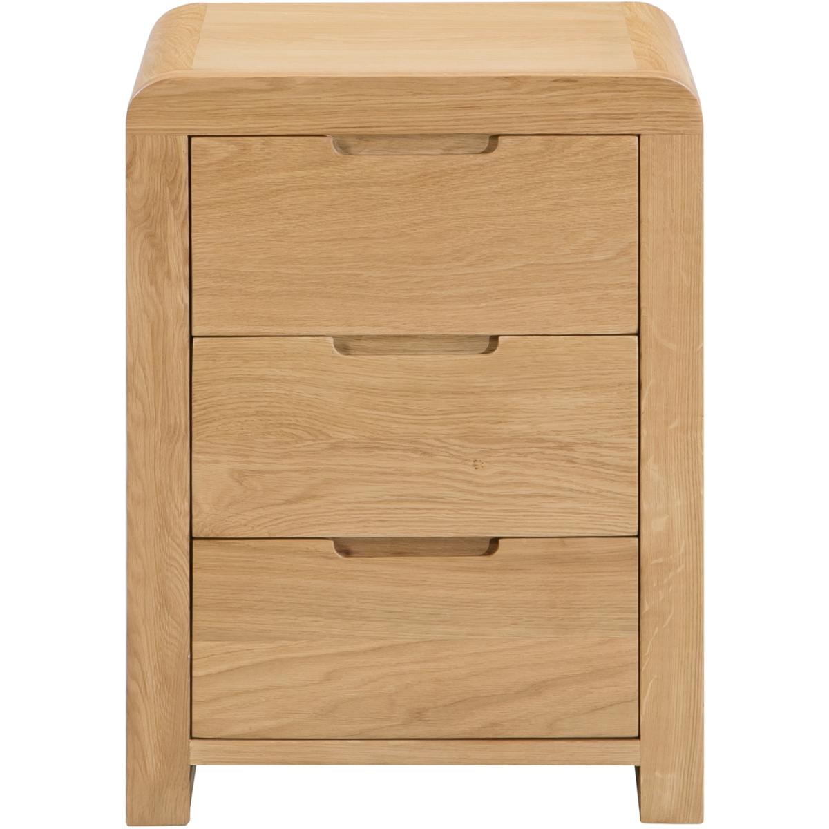 Crafted from solid white oak and oak veneers, the Curve combines clean lines with a gentle curved edging, adding a stunning touch to any bedroom. Recessed handles enable easy opening and a modern feel. This Curve bedside features three drawers, suitable for those items needed at hands reach from your bed. Part of the extensive Curve bedroom collection from Julian Bowen