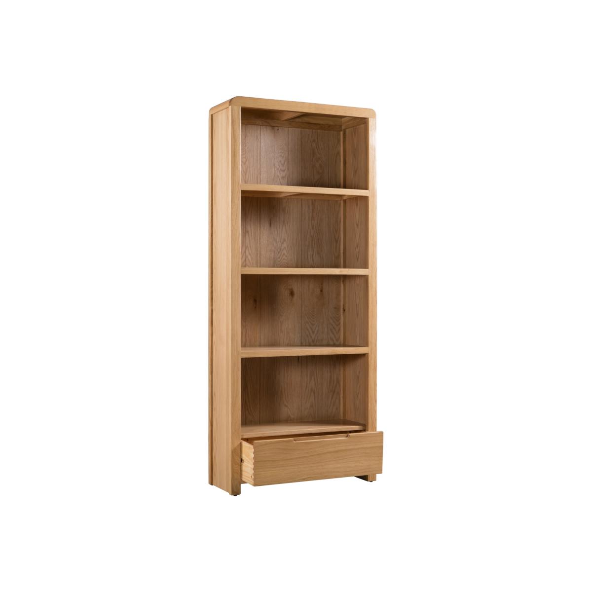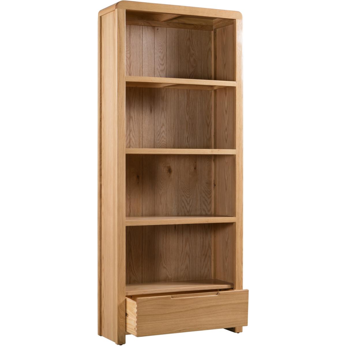 Crafted from solid oak and oak veneers, the Curve combines clean lines with a gentle curved edging, adding a modern, retro feel to any dining area. The Curve Tall Bookcase offers four shelves with ample space, along with a large drawer. Part of the Julian Bowen Curve Dining and Occasional Collection