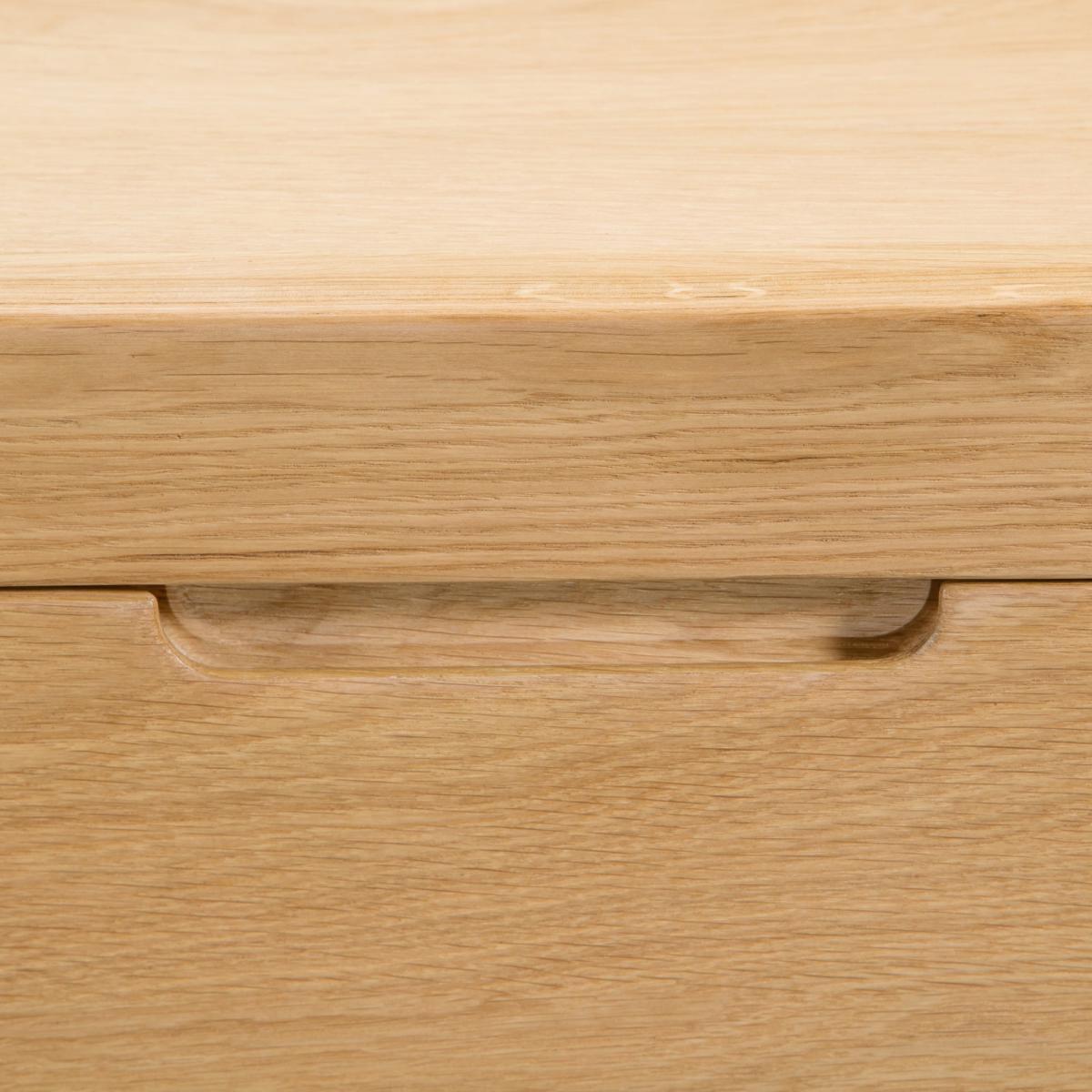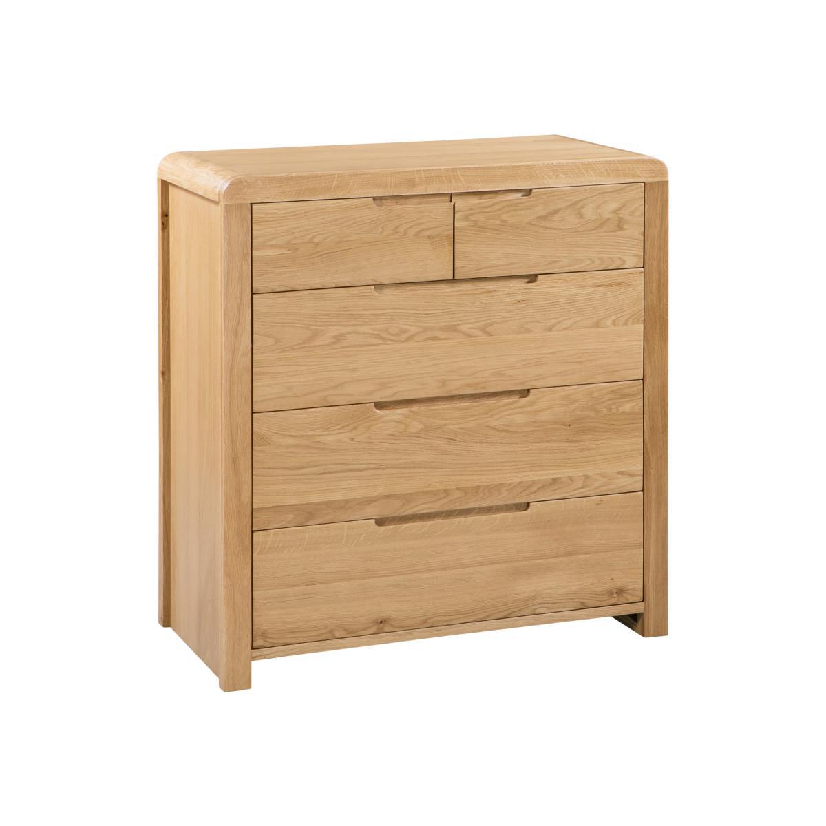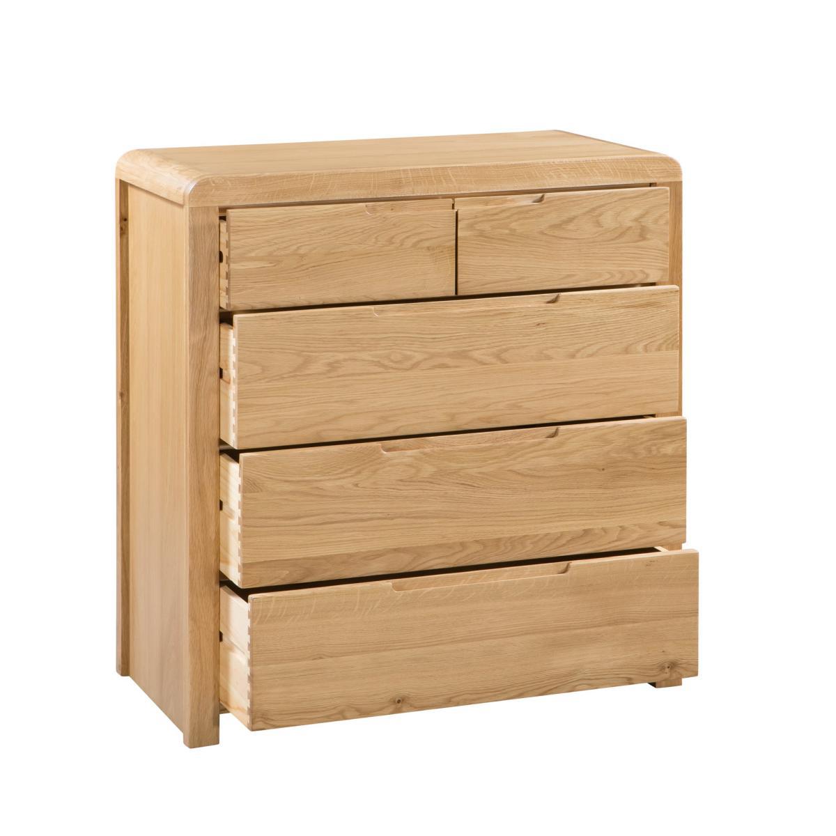 Crafted from solid oak and oak veneers, this chest of drawers is the perfect combination of classic and contemporary. With beautiful recessed handles and curved edging this chest of drawers is stunning. With 5 drawers this chest of drawers is perfect for holding all your clothes. Other matching furniture is also available.