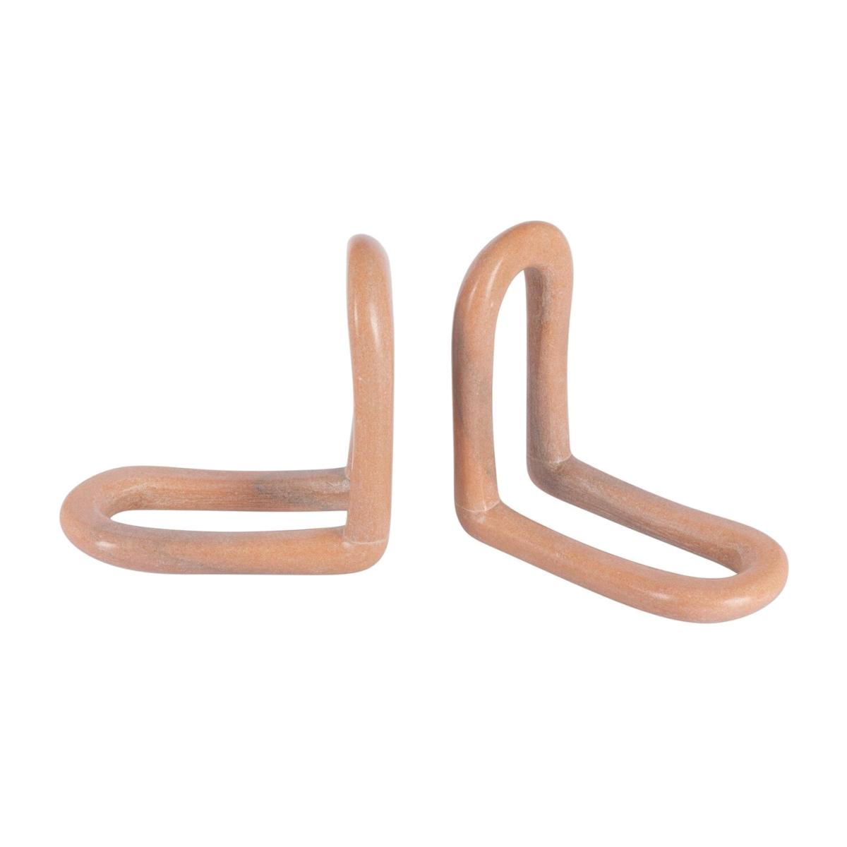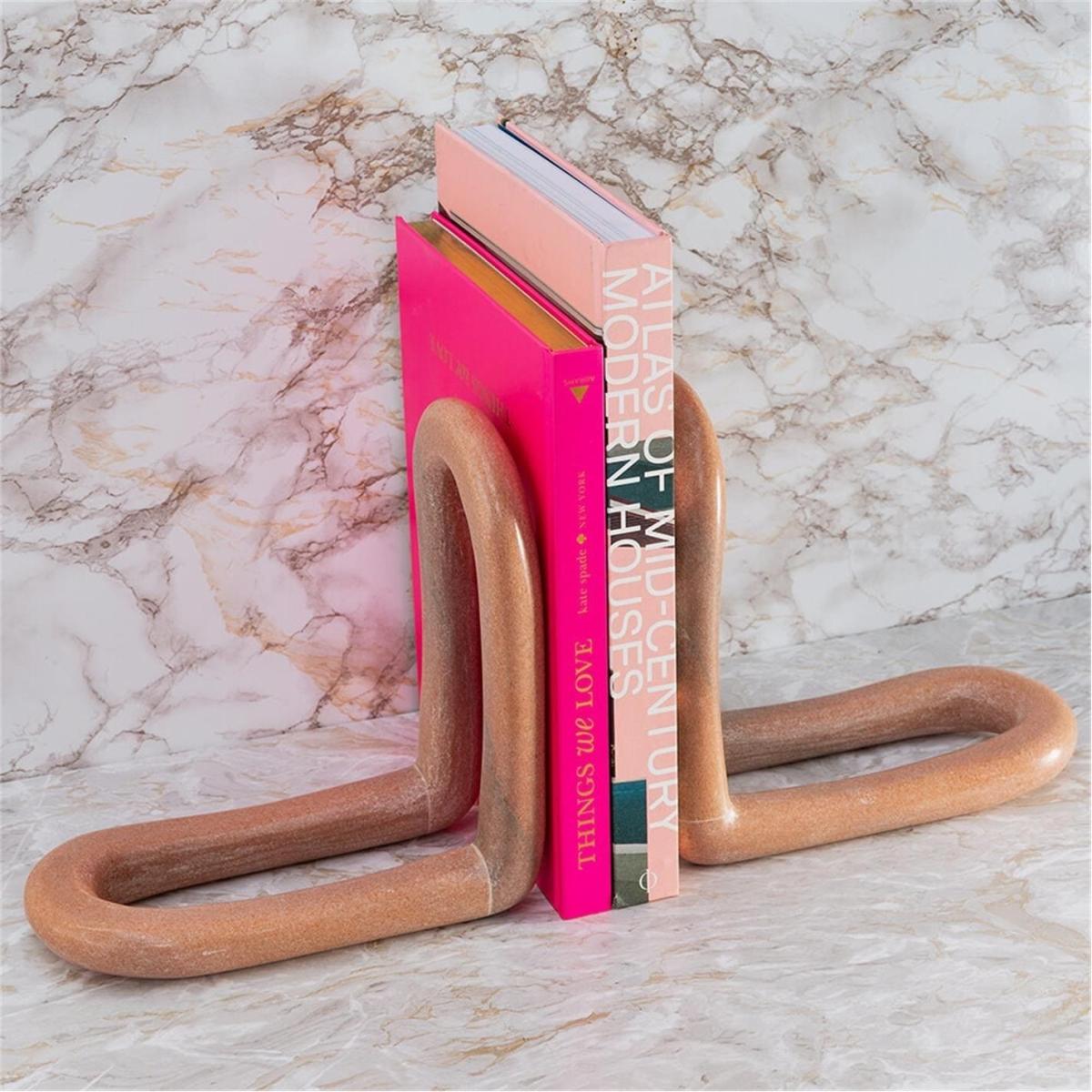 As a stylist I appreciate how these curved hoop bookends bring a sleek, sculptural touch without dominating the shelf. The soft peach-toned marble and gentle veining work particularly well in modern Scandi or pared-back contemporary interiors, but they also introduce a subtle contrast against richer, darker cabinetry. For styling, group them at either end of a stack of oversized art or design books, and balance the look by pairing with small ceramic vases or a slim metal frame. Because they’re solid marble, they’re sturdy enough to support heavier tomes, so you can mix functionality with a refined decorative accent.