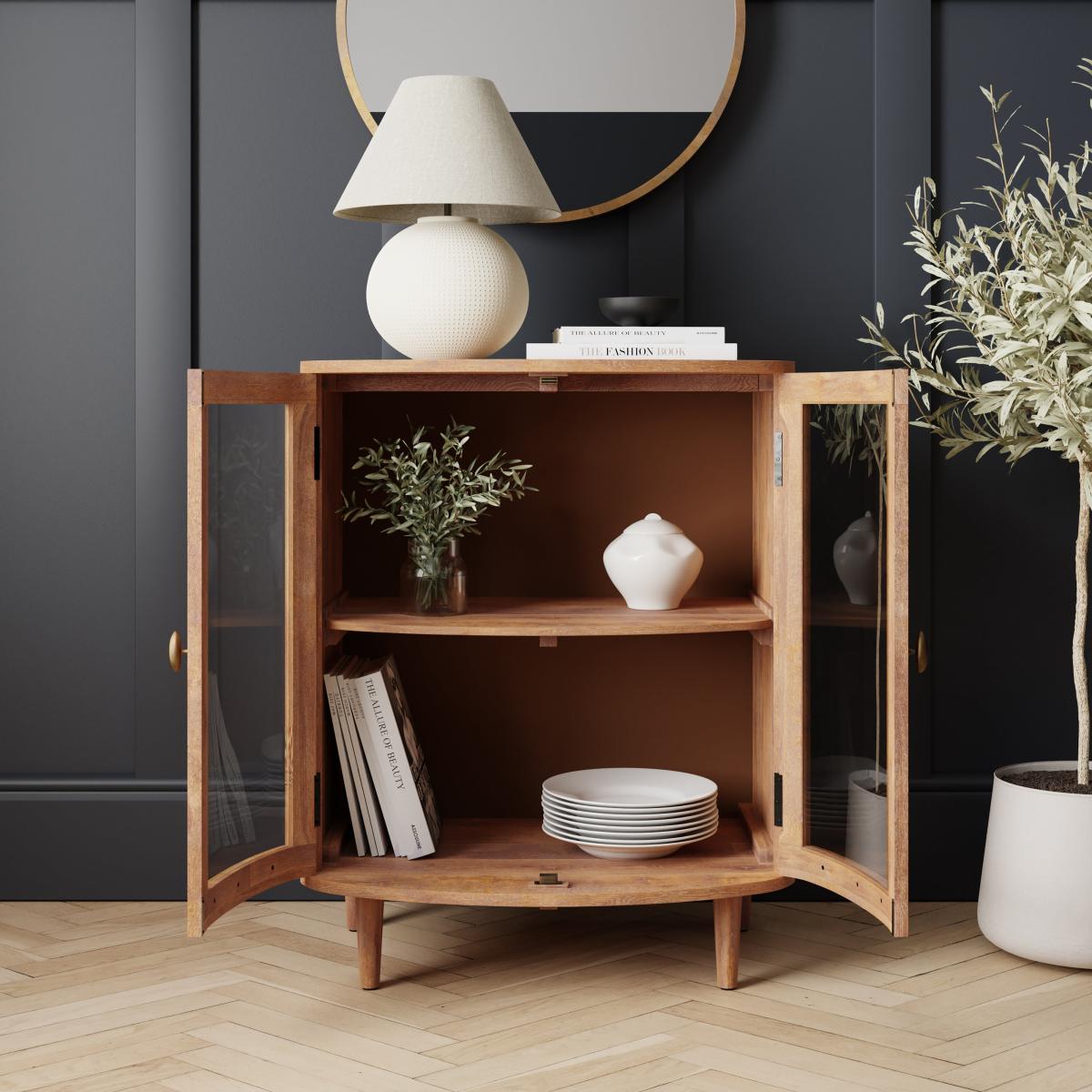 I love this sideboard for its warm, natural mango wood finish, which lends a cosy yet versatile feel to various interiors. It works particularly well in rustic, boho, or Scandinavian spaces, where natural materials and earthy tones are key. Practical styling tips include using the cabinet to display favourite crockery, plants, or decorative pieces on top, while keeping clutter out of sight behind the doors. When styling inside, consider coloured or textured storage baskets to add organisation and visual interest. Its understated design makes it a flexible piece that can adapt as your interior style evolves.