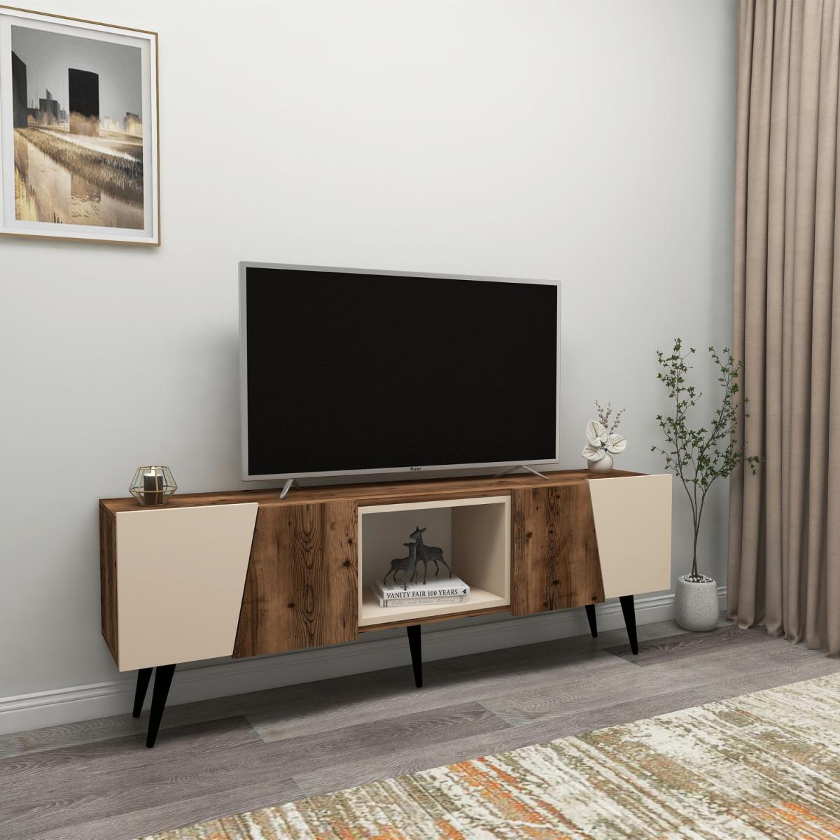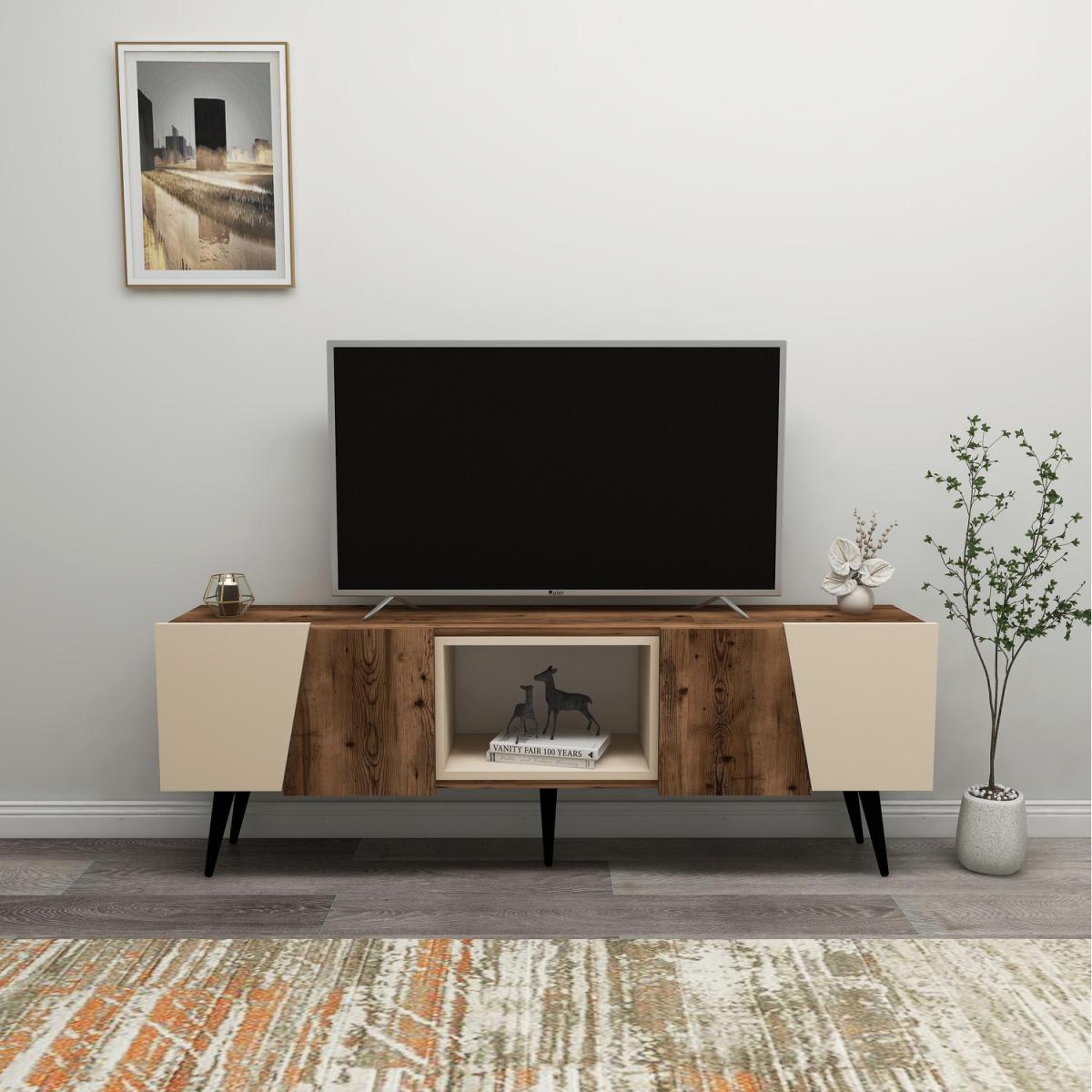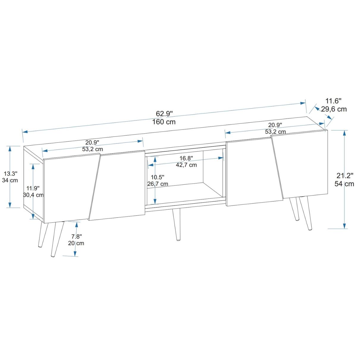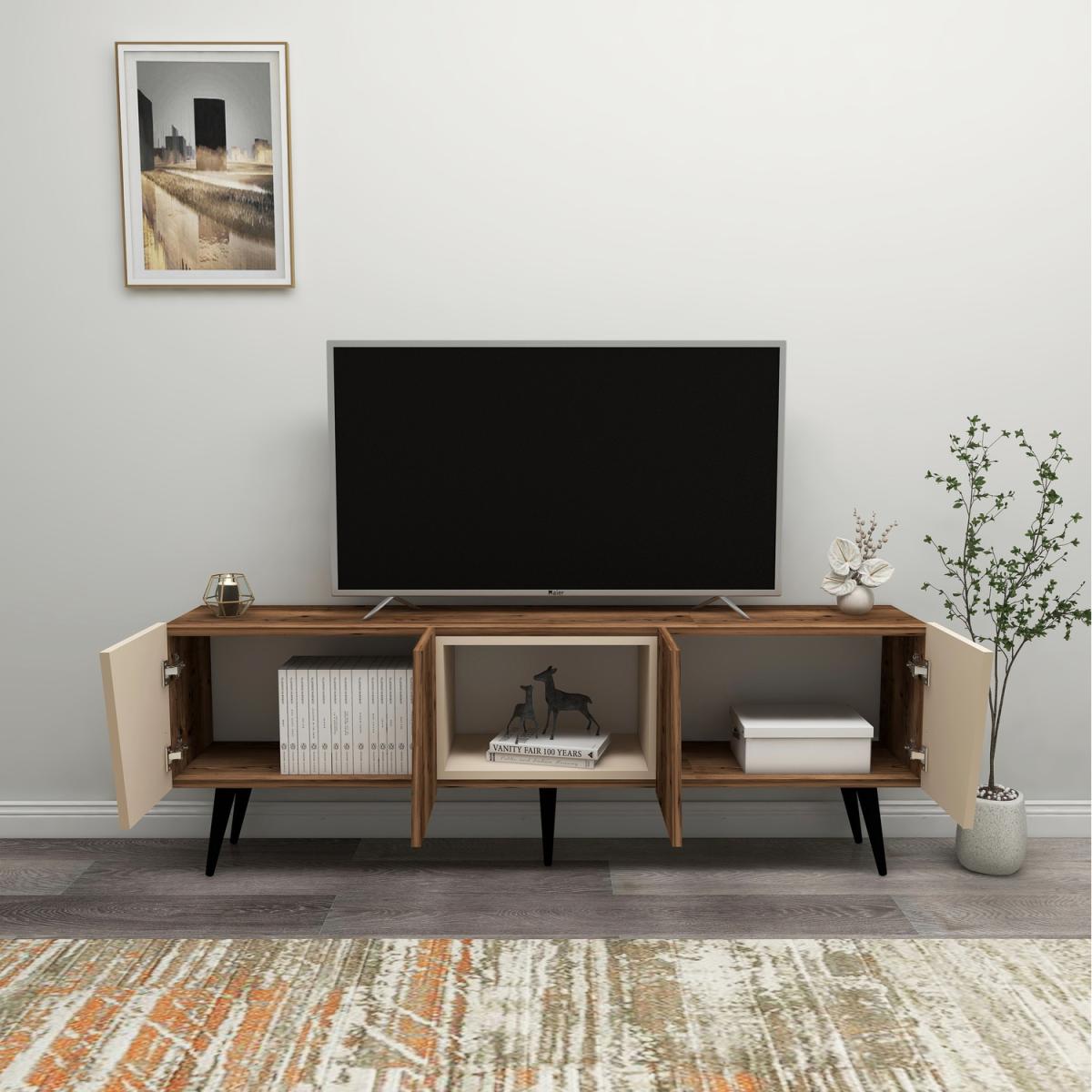 The TV stand has multiple cabinets and shelves providing extra storage for your media gadgets, DVDs, or CDs. MATERIAL The TV stand is made of an 18 mm thick quality melamine-coated particleboard. The manufactured wood surface is water-resistant to some extent and the edges are banded with PVC edge banding tape. Door handles are quality iron metal. First-class assemblyinstallation hardware and accessories are used. Our products are produced from certified quality raw materials that do not contain carcinogenic substances and comply with European Union health norms. CLEANING You can clean your furniture with a dry cloth. Avoid prolonged contact of your product with moisture and water. ASSEMBLY The product will be delivered to the customer in the original package as disassembled. It is designed to be assembled by the customer using a power drill and screwdriver. Assembly instruction and installation hardware are included in the package. For fast and error-free installation, product parts are numbered with stickers in accordance with the assembly guide.