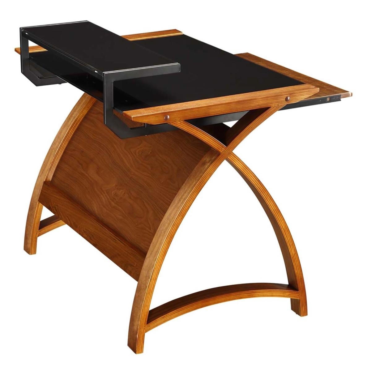 Work, study and play in style with this impressive and contemporary computer desk, with sweeping curved legs, a smart, flat glass table top and an extra shelf. The real wood veneers add a professional-looking finishing touch to a desk, complementing a professional lifestyle. Set up your keyboard on the integrated sliding keyboard drawer, keep your documents on the glass desktop and position your computer screen on the top shelf. The design ensures your screen is easy to see and that writing, typing and working in general is a clutter-free, easy task. The work surface is a toughened safety glass which offers you the delicate elegance of glass furniture without the worry of damaging or shattering the surface as it is strengthened and tempered by design. Who wants to work at a messy desk? An accompanying modesty panel is easily installed in order to hide away the ugliness of cables, wires and plugs in order to keep your work area neat, tidy and visually impressive.