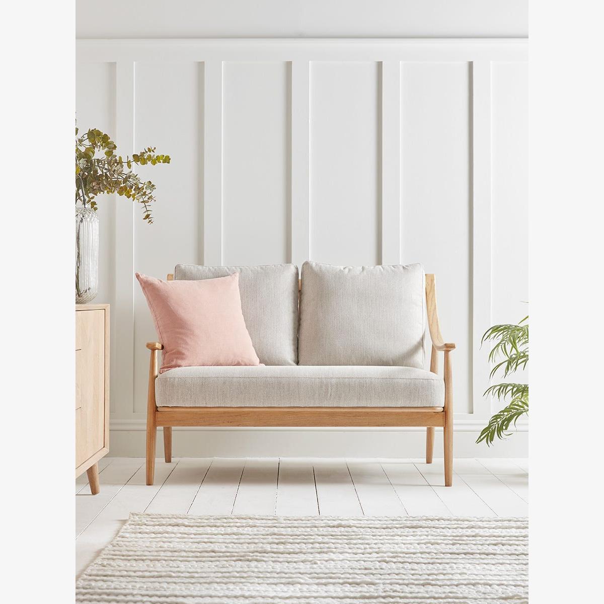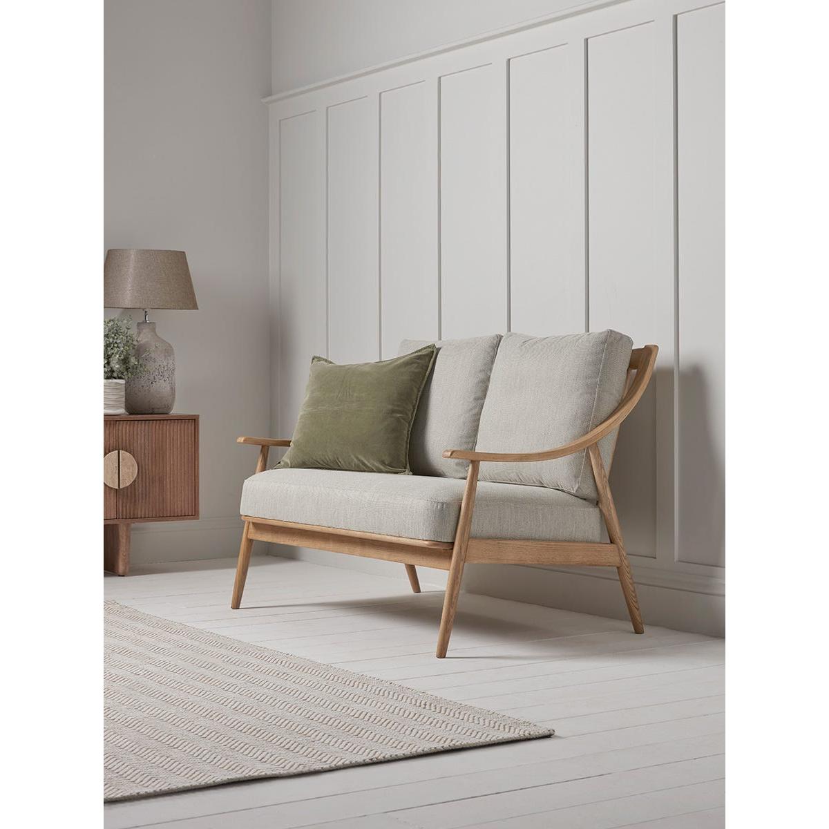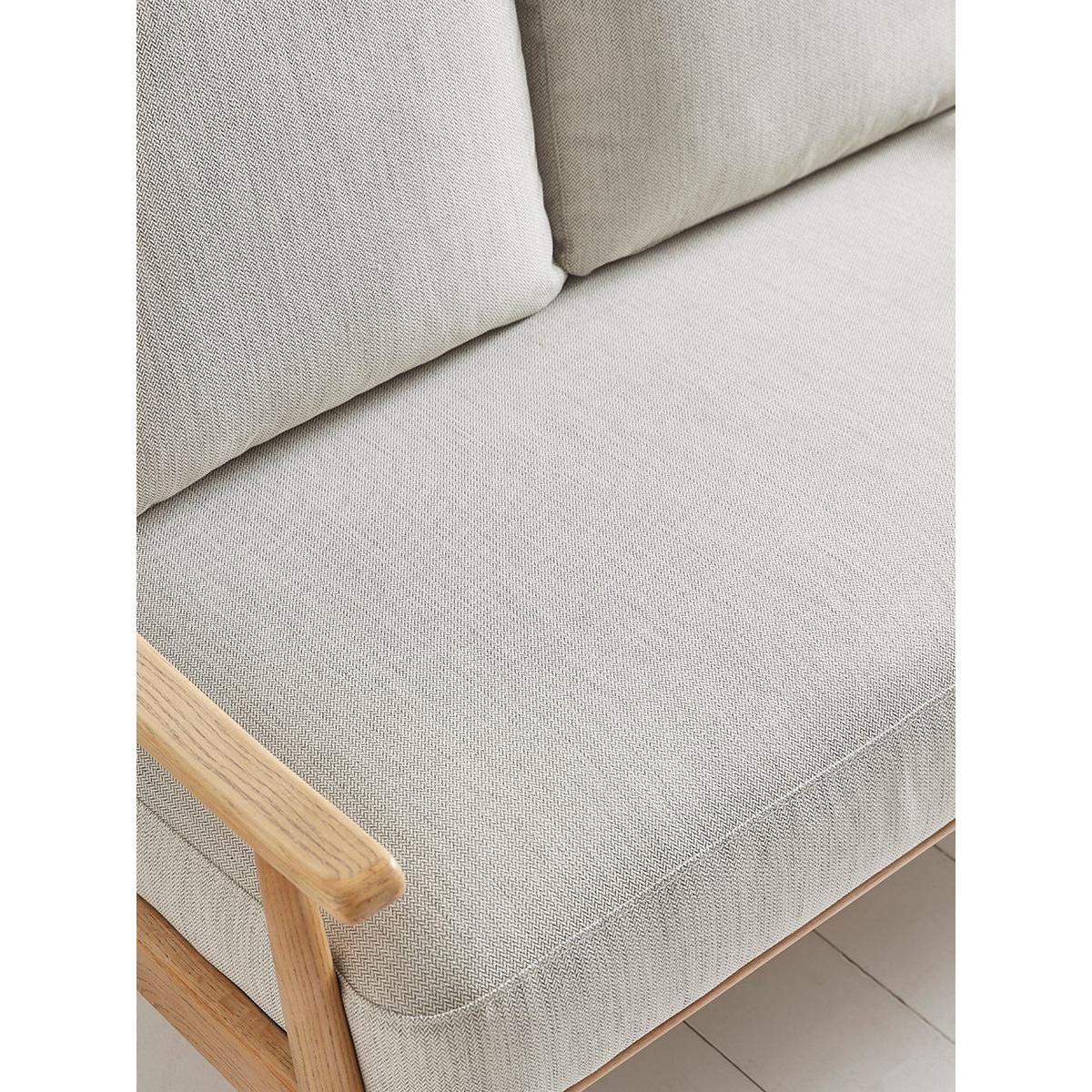 With a lighter silhouette than traditional fully upholstered sofas, this mid-century style has a scandi feel that is perfect for contemporary homes. With a solid wood frame in a pale toned ash, the two seater sofa features a pleasing swooping curve to the arms and a spindle back. Comfortable seat and back cushions in neutral tones with a subtle herringbone pattern complete the picture.