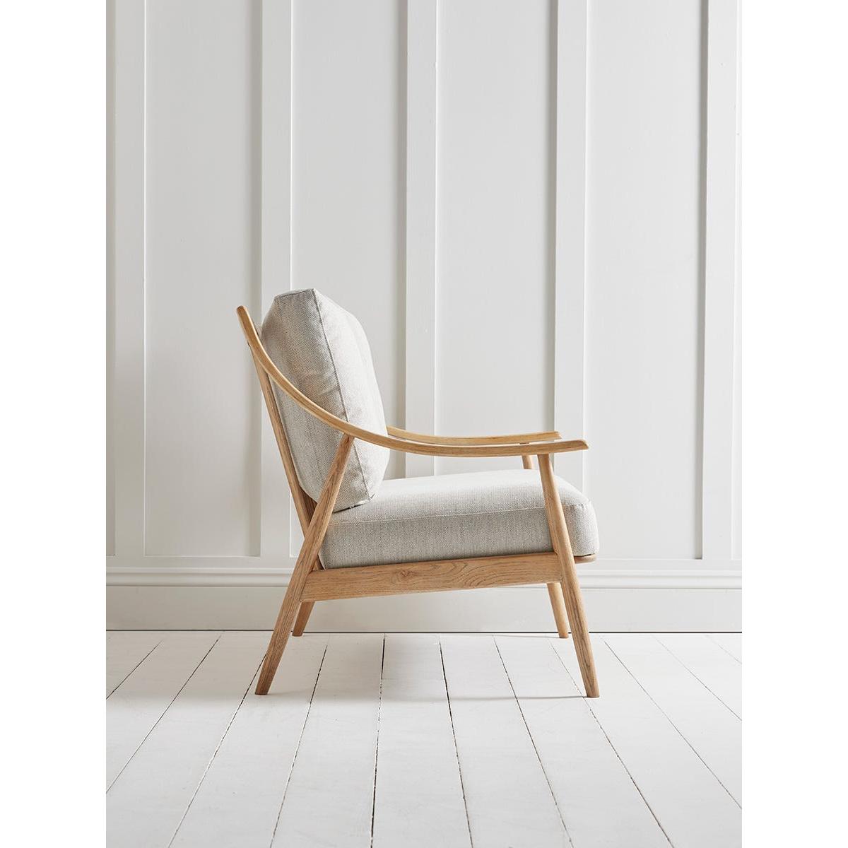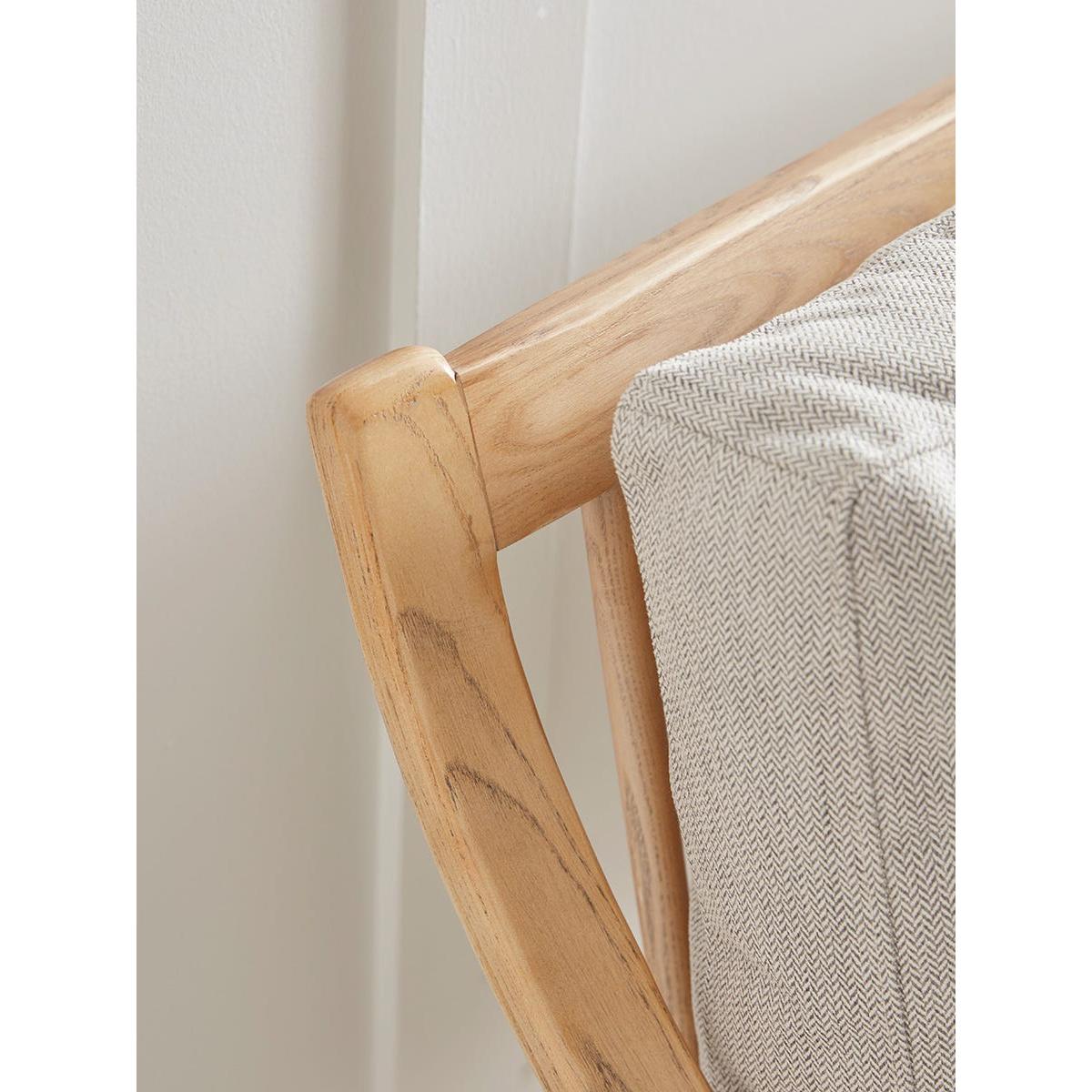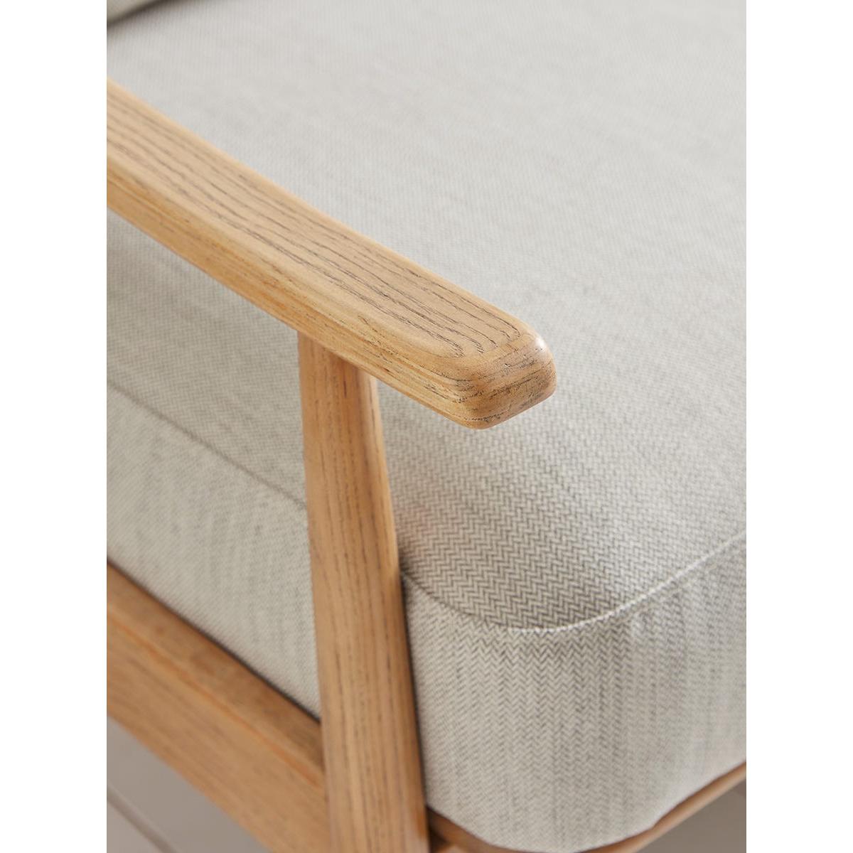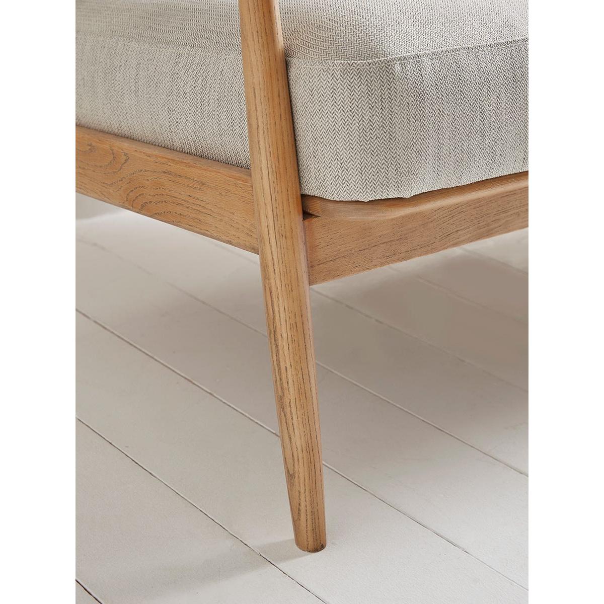 With a lighter silhouette than traditional fully upholstered sofas, this mid-century style has a scandi feel that is perfect for contemporary homes. With a solid wood frame in a pale toned ash, the two seater sofa features a pleasing swooping curve to the arms and a spindle back. Comfortable seat and back cushions in neutral tones with a subtle herringbone pattern complete the picture.