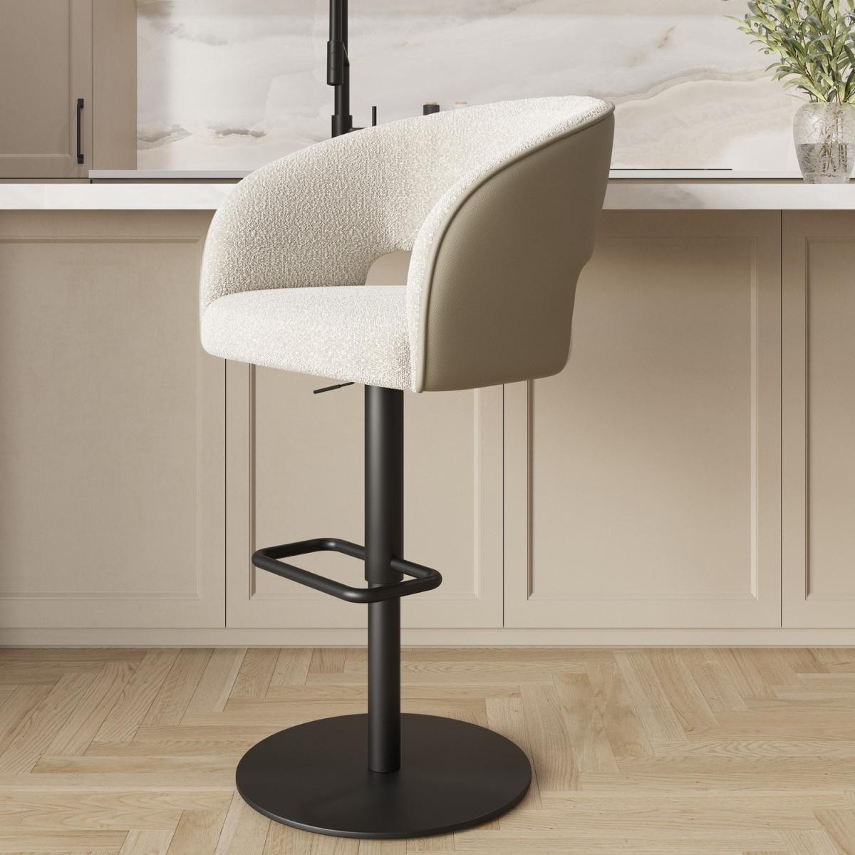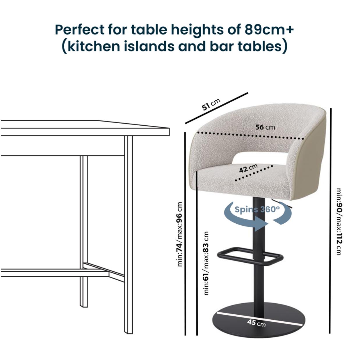 The Beige Adjustable Bar Stool is the perfect fusion of style, comfort, and practicality, making it an ideal addition to any modern kitchen or bar area. Upholstered in a stunning combination of beige faux leather and boucle fabric, this bar stool offers a textured, high-end look with a soft, inviting feel. Featuring a gas lift mechanism, you can effortlessly adjust the height to suit standard bar tables or kitchen counters, while the 360-degree swivel allows for easy movement. The foam-filled seat and supportive backrest provide enhanced comfort, making this stool perfect for long meals, drinks, or casual work sessions. The contrasting black metal base and footrest bring a bold, modern aesthetic, while also providing added stability and support. The Beige Adjustable Bar Stool is the perfect combination of comfort, function, and style, offering a chic and versatile seating solution for any home. Whether used at a breakfast bar, kitchen island, or home bar setup, this stool elevates the space with its elegant design and premium materials. Number of Stools: 1 Seat height: 61-83 cm Adjustable Height: W56 x D51 x H112 cm Dimensions:W56 x D51 x H90 cm Weight: 14.35 kg Max supported weight: 150kg Colour: Beige and black Finish: Upholstered Material: Beige faux leather, beige boucle and metal leg Assembly required: Yes Packaging dimensions: W57 x D51 x H42 cm For domestic use only. Domestically UKFR certified