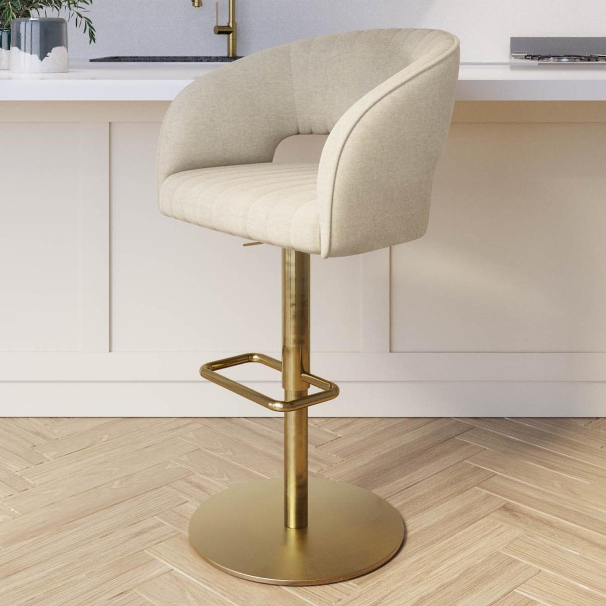 All about me This beige chenille bar stool features a stunning brushed brass footrest and base for a modern finish. The footrest and armrests provide added comfort, plus the seat is foam-filled and designed to be comfier for longer, perfect for sitting while you eat, drink or work. Suitable for bar tables and kitchen islands with heights of 89-109 cm, please measure before purchasing. Need to know Dimensions:W56 x D51 x H90-112 cm Seat height: 61-83 cm Weight: 14.35 kg Max supported weight: 160 kg Colour: Beige and gold (legs) Material: Chenille and solid iron (legs) Assembly required: Yes Packaging dimensions: W57 x D51 x H42 cm Packaging weight: 16.4 kg