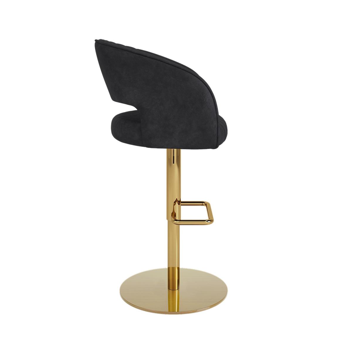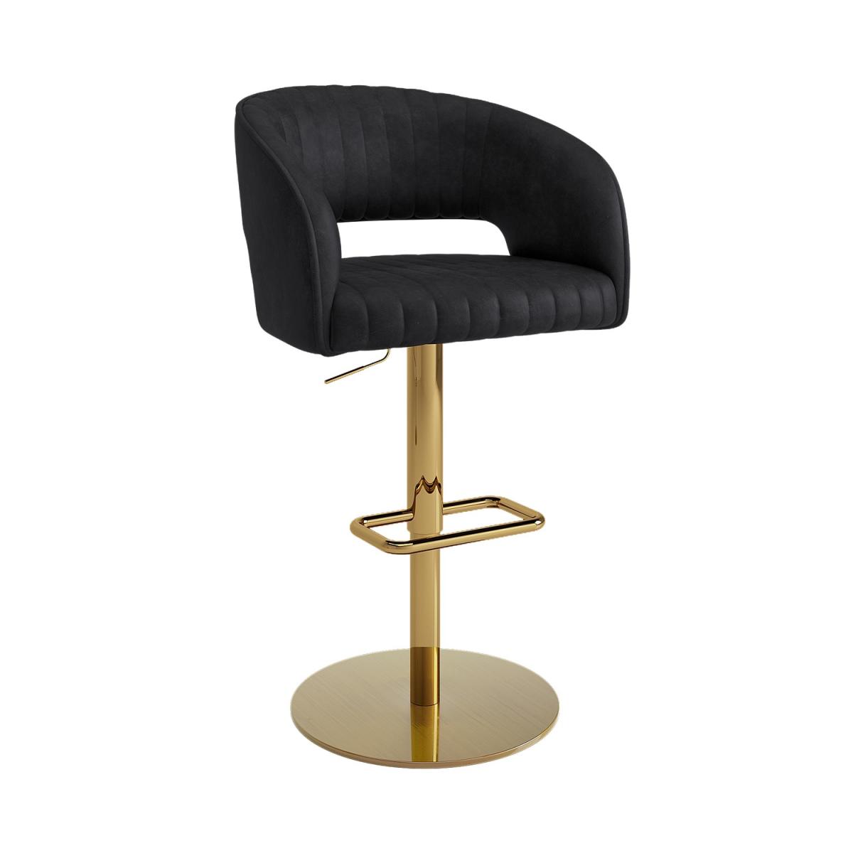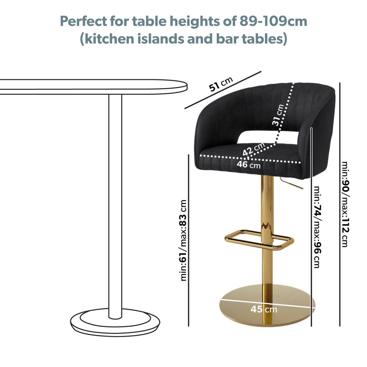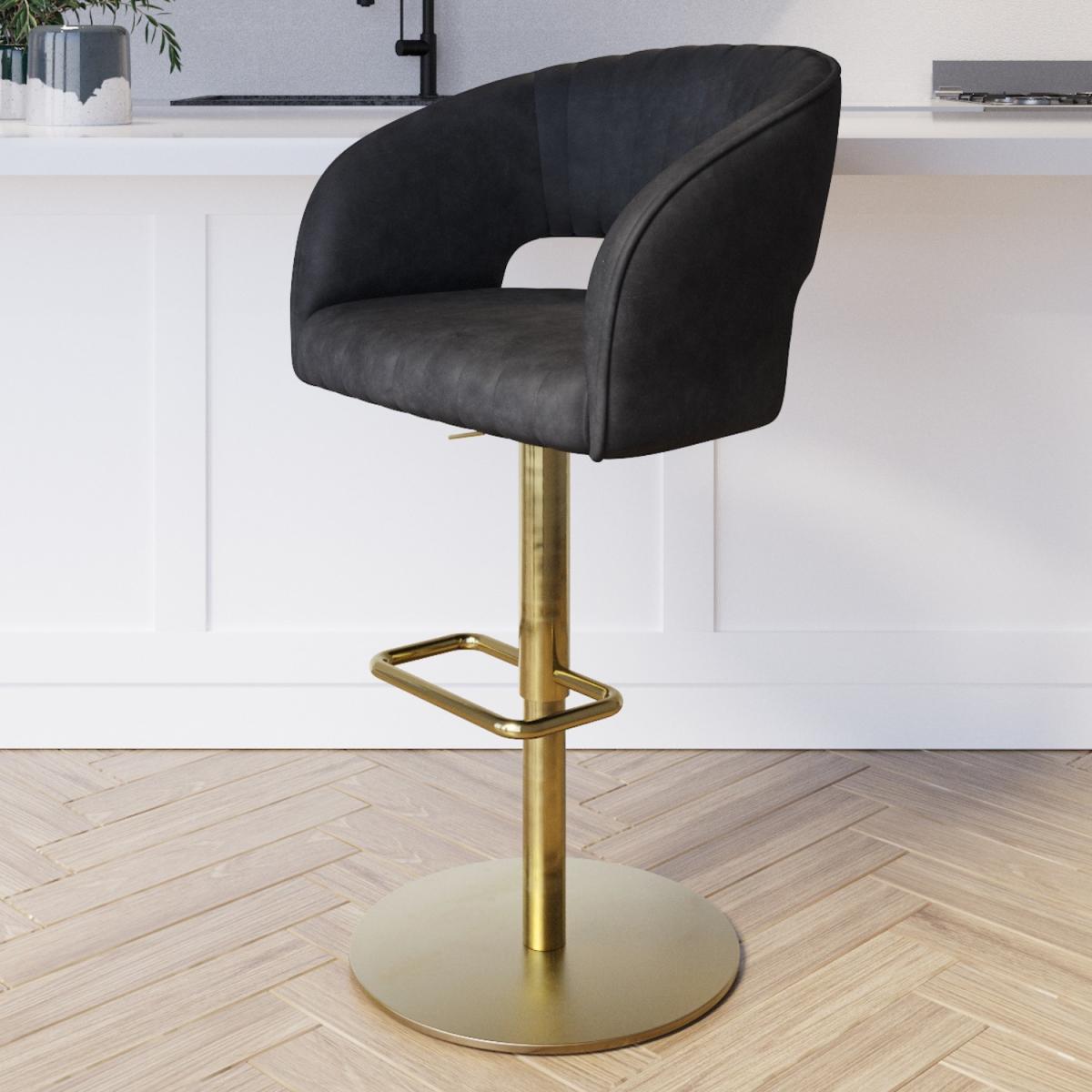 All about me. Add a modern touch to your socialising space with this Runa bar stool. It's striking thanks to the faux leather upholstery vertical stitch detailing curved backrest and stunning brushed brass footrest and base. It’ll coordinate well with any bar table plus it’s available in sets of two or three to maximise the look you desire. The seat has plush foam padding for extended comfort perfect for sitting while you eat drink or work. It's also easy to keep clean due to its wipeable surfaces. This bar stool is suitable for table heights of 104-109 cm for better sitting comfort please measure before purchasing. Need to know. Packaging dimensions. W57 x D51 x H44 cm Packaging weight. 16.4kg Dimensions. W56 x D51 x H90-112 cm Seat height. 61-83cm Product weight. 14.35kg Max weight limit. 160kg Colour. Black and gold (legs) Finish. Upholstered and brushed brass (legs) Material. Solid iron with steel cover foam and faux leather PU fabric For use. Indoors (and wooden floors) Assembly required. Yes.