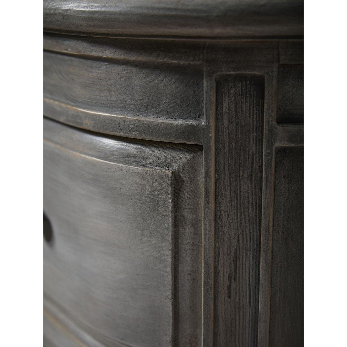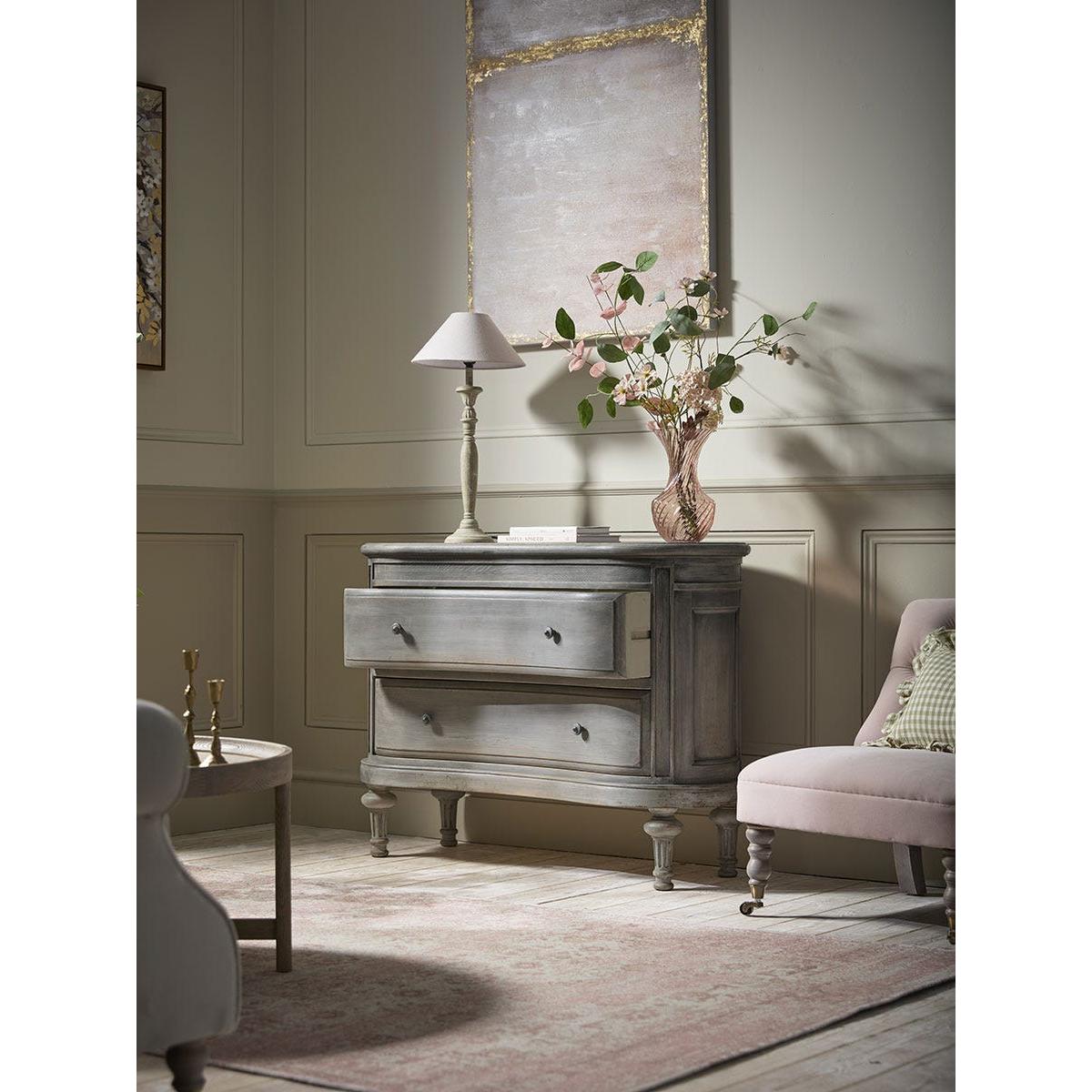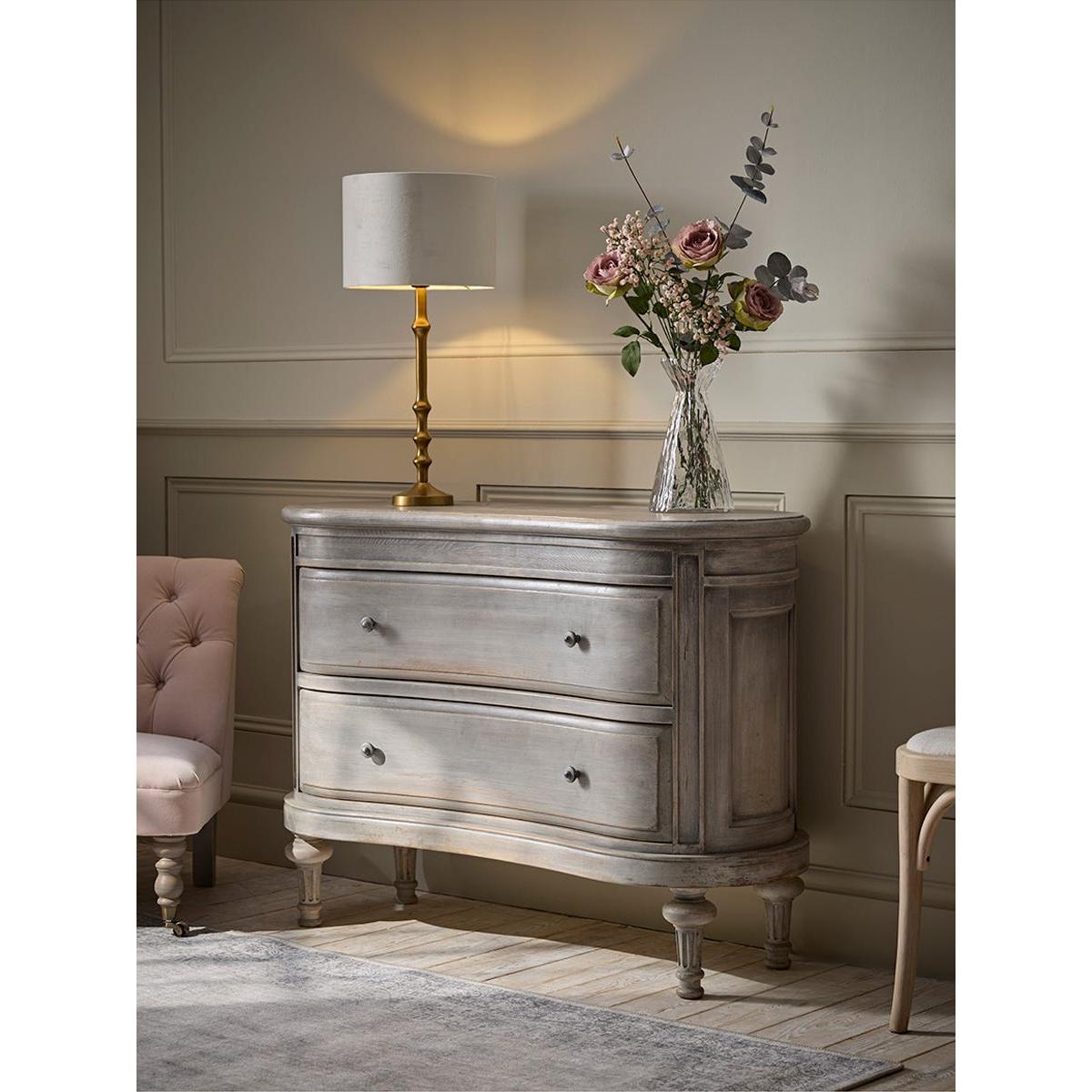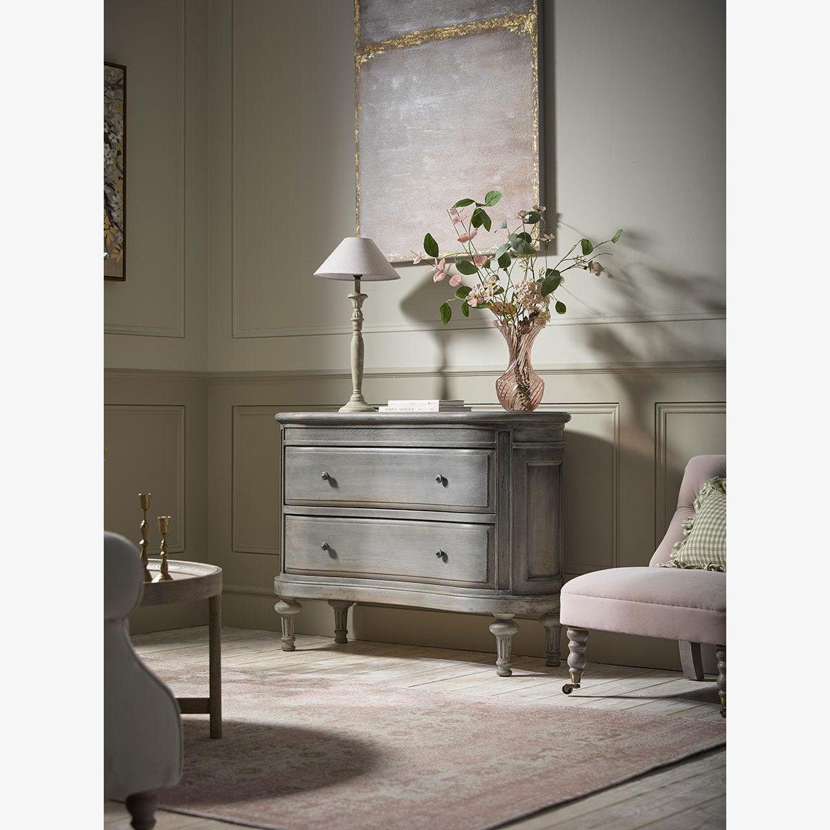 With plenty of vintage charm to elevate any setting, this curved chest of drawers is made from recycled pine with a slightly aged finish. Timeless elegance is created with curved lines and delicately carved legs that add beautiful intricacy to the piece. Two drawers are finished with dainty metal handles. Perfect for a home that celebrates a vintage style, this chest of drawers fits in our Faded Elegance trend.