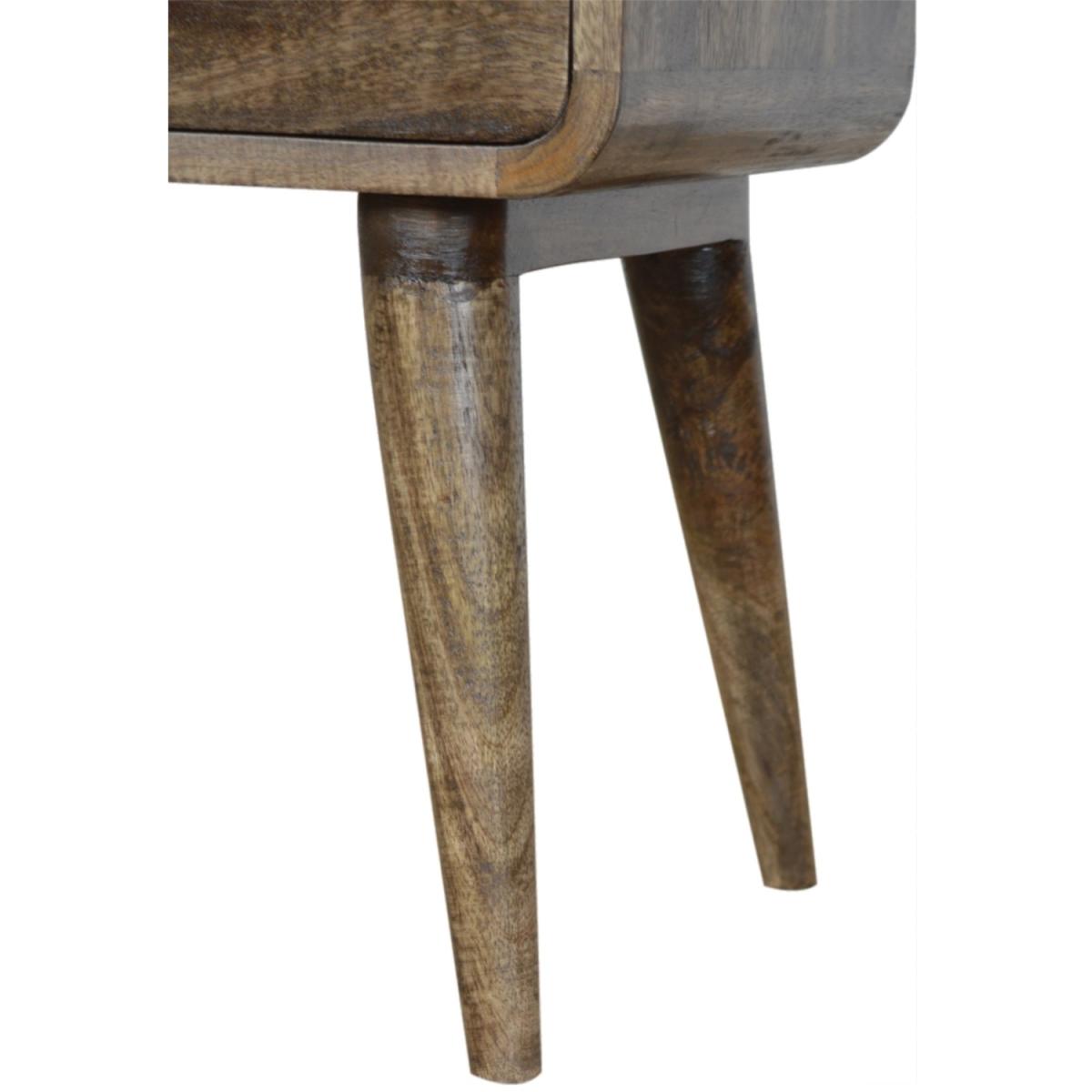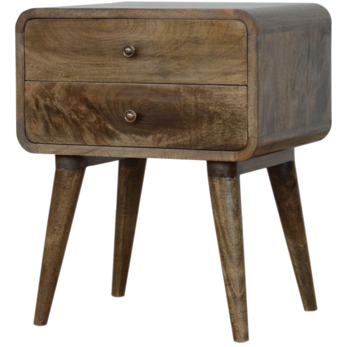 Endlessly versatile, this curved bedside table makes a perfect stand for books, photo frames or a lamp. It will prove handy all over your home and is made from 100. Solid mango wood and has a grey-washed finish. It has curved edges which will fit into any homeliving space. It also comes with 2 drawers that come with shiny knobs and 4 Scandinavian-style legs.
