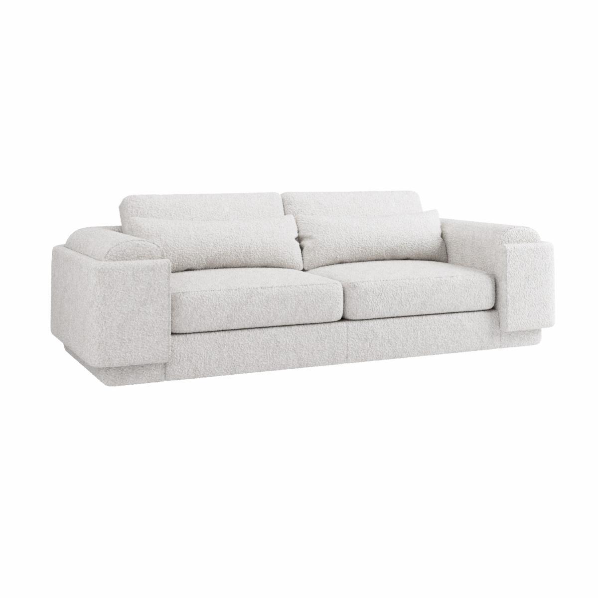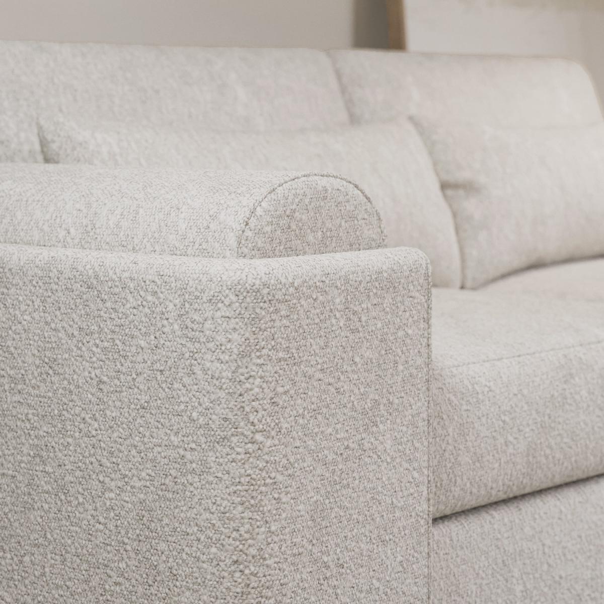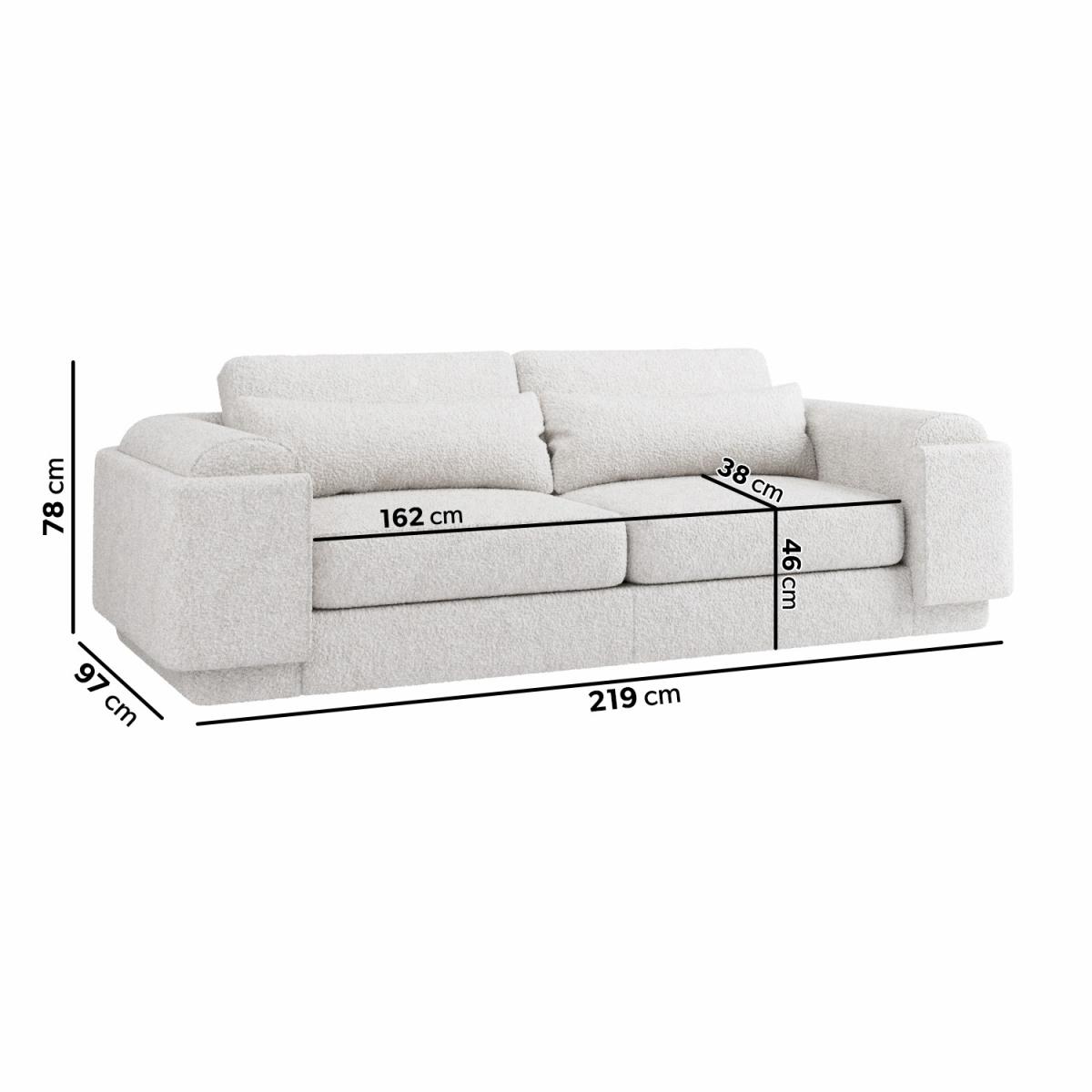 All about me The Elvi cream boucle sofa is luxurious and beautifully upholstered in soft cream boucle fabric that's guaranteed to create a statement in any living room. Two long scatter cushions allow you to tailor your seating position, and the seat and back cushions are filled with foam for optimum comfort. The frame is crafted from strong plywood and eucalyptus wood, so the Elvi sofa is built to withstand the test of time. Need to know Dimensions:W219 x D97 x H78 cm Packaging dimensions:W221 x D100 x H60 cm Weight: 67 kg Max supported weight: 110 kg per seat Colour: Cream Finish: Boucle fabric upholstery Material:Strong eucalyptus and plywood frame Filling: Foam Assembly required: Yes - just attach the legs
