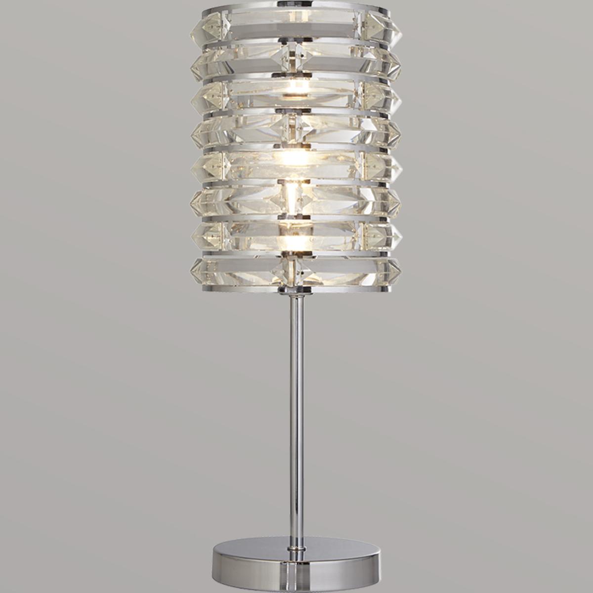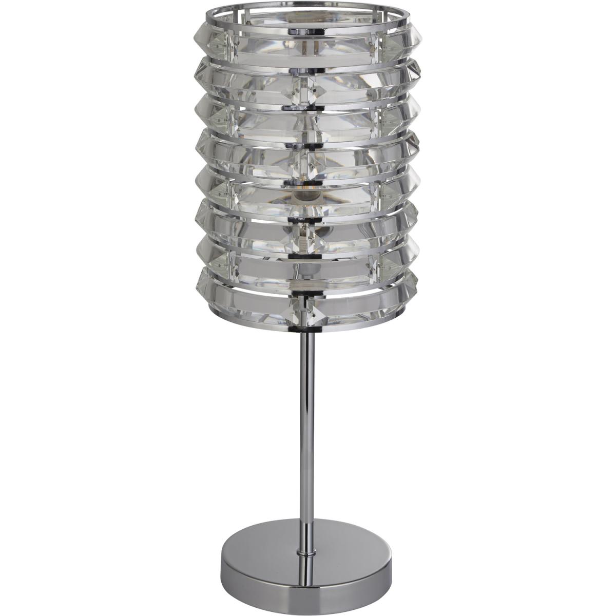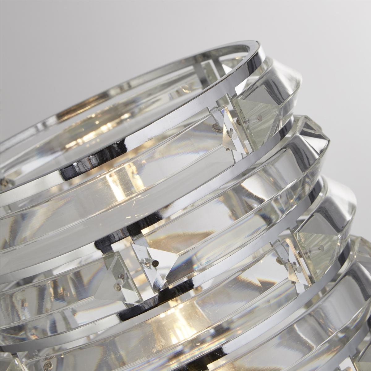 Simple yet stylish, the lamp will elevate any room. Finished in chrome and with curved glass pieces to reflect light, this lamp is ideal for a living area or bedroom.