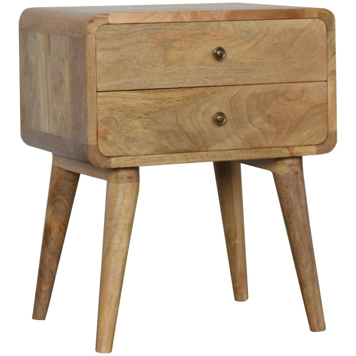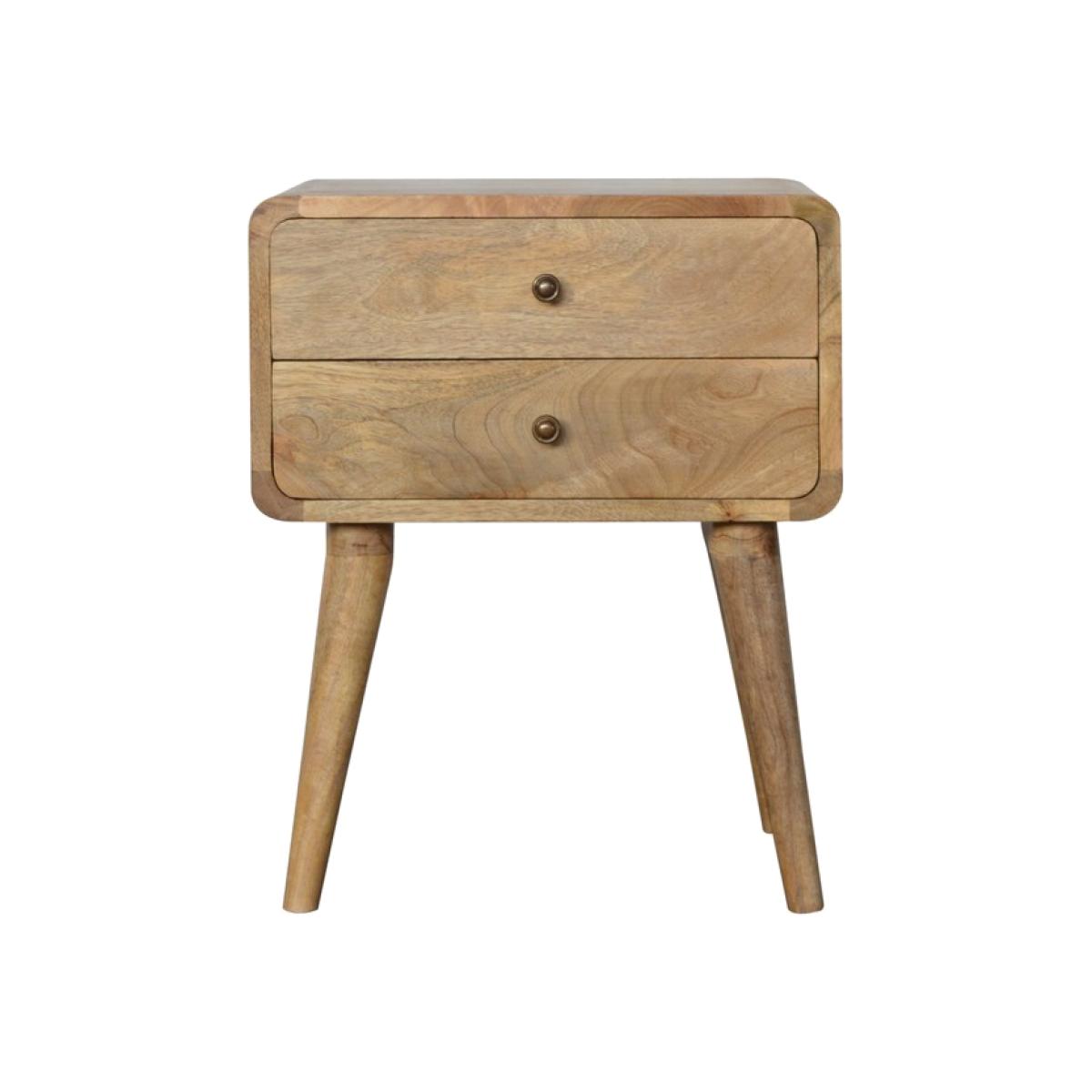 Endlessly versatile, this curved bedside table makes a perfect stand for nibbles, drinks or a lamp. It will prove handy all over your home and is made from 100. Solid mango wood and has a fine oak-ish finish. It has curved edges which will fit into any homeliving space. It also comes with 2 drawers that come with shiny brass knobs and 4 Scandinavian styled legs.