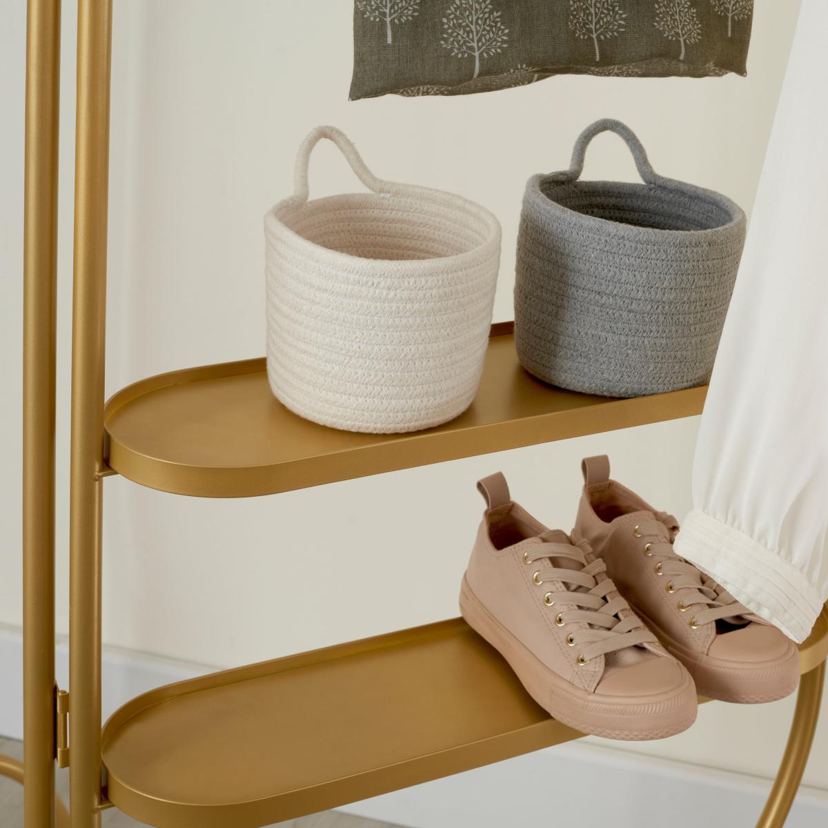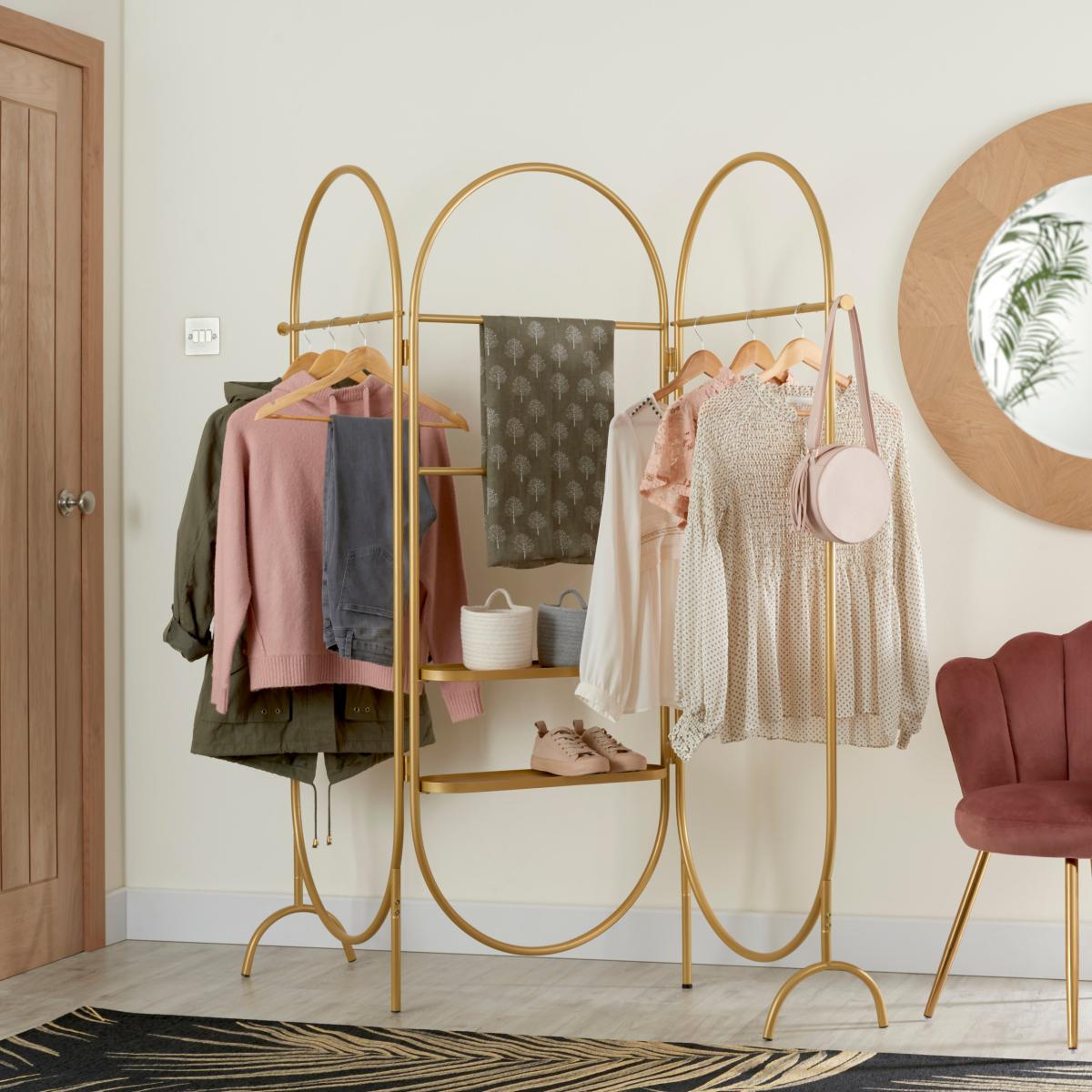 I love this gold rail for its sleek, modern look that adds a touch of glamour to any space. It works particularly well in contemporary and eclectic interiors, bringing function without sacrificing style. Practical tips include using it in bedrooms or dressing areas for easy access to daily outfits, or as a stylish display in a walk-in wardrobe. To style it effectively, try grouping clothing by colour or type, and incorporate some decorative baskets or trays on the shelves below for organisation. Its compact footprint makes it ideal for smaller rooms, and the gold finish adds a luxe vibe that elevates the overall look.