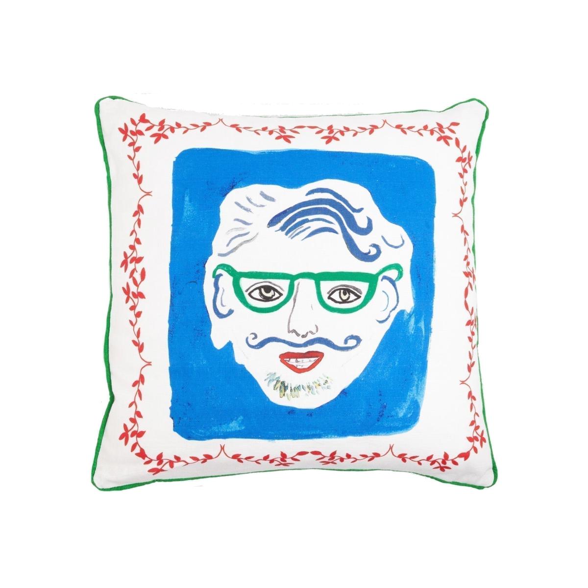 A beautiful piped linen cushion cover featuring the hand painted artwork of the "Man's Head". Hand-painted "Green diamond" reverse. Switch sides dependent on your vibe. Bring colour and happiness into your abode. 100% linen Dry Clean (or machine wash on cold) Do not tumble dry