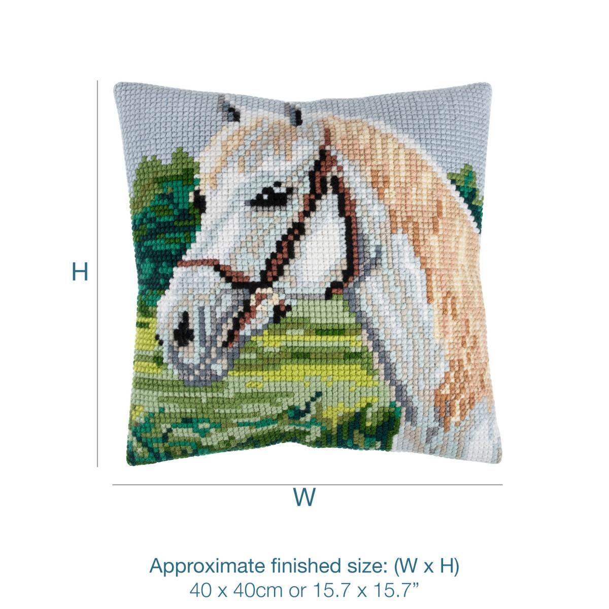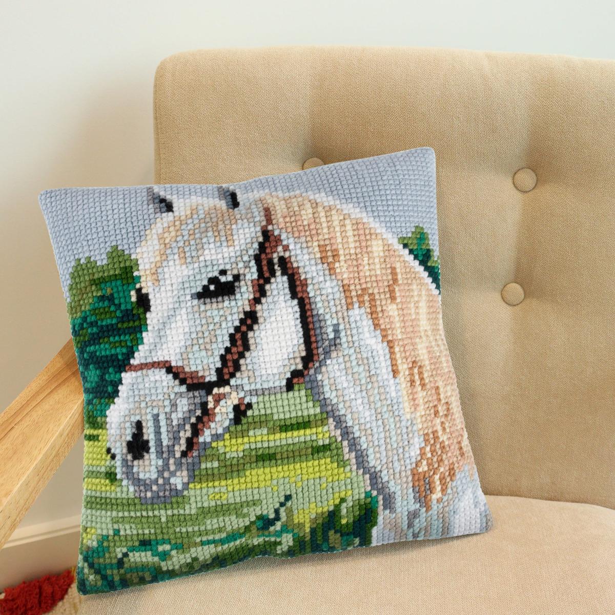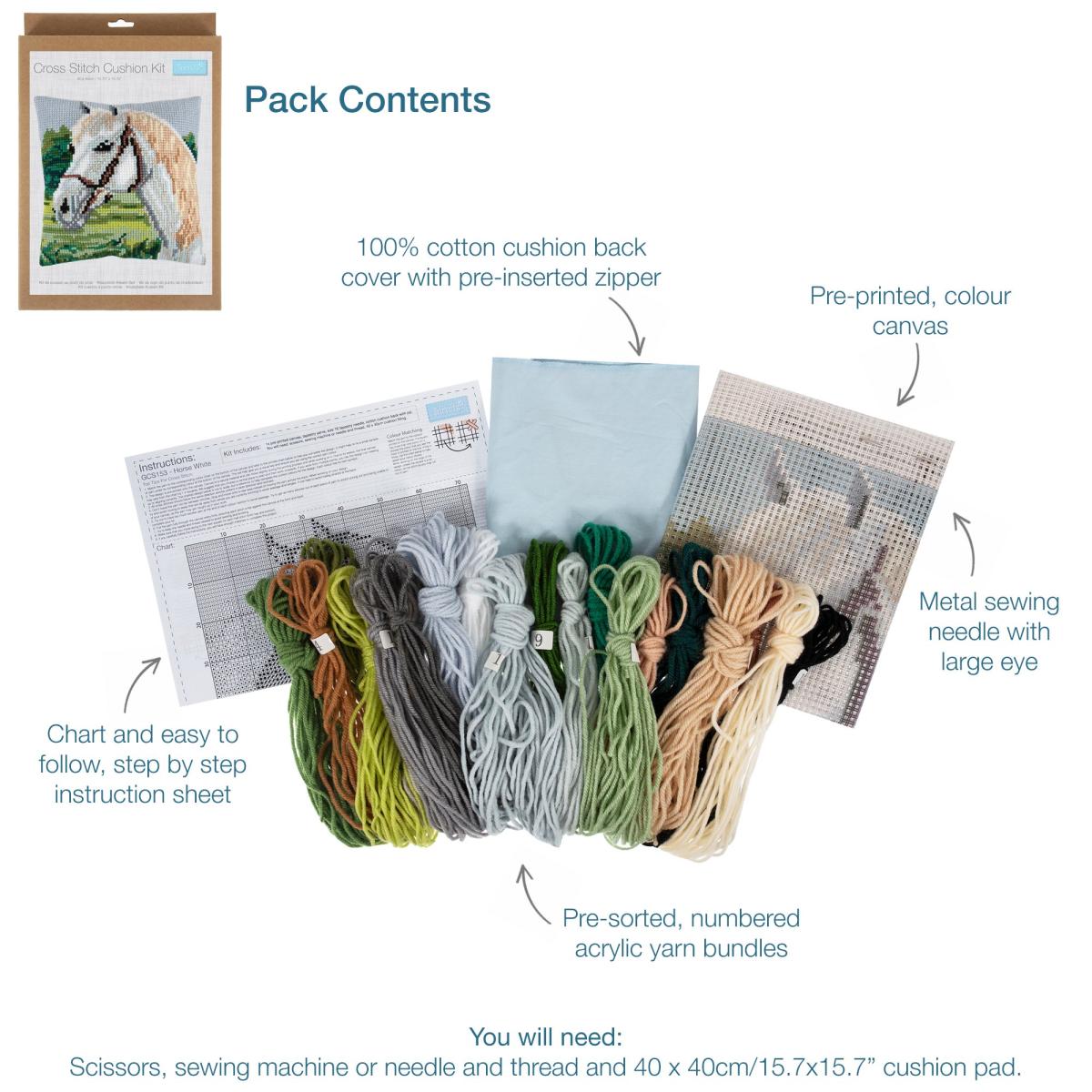 * Perfect for horse lovers * Lovely gift idea * Develop your cross stitch skills Bring a touch of equestrian elegance into your home with this charming horse cushion kit The kit includes everything you need to create a stunning cushion, from pre-printed, large hole polycotton canvas to vibrant polyester yarns and a needle. Simply spot clean the cushion gently to keep it looking fresh—please note, the cushion pad is not included.