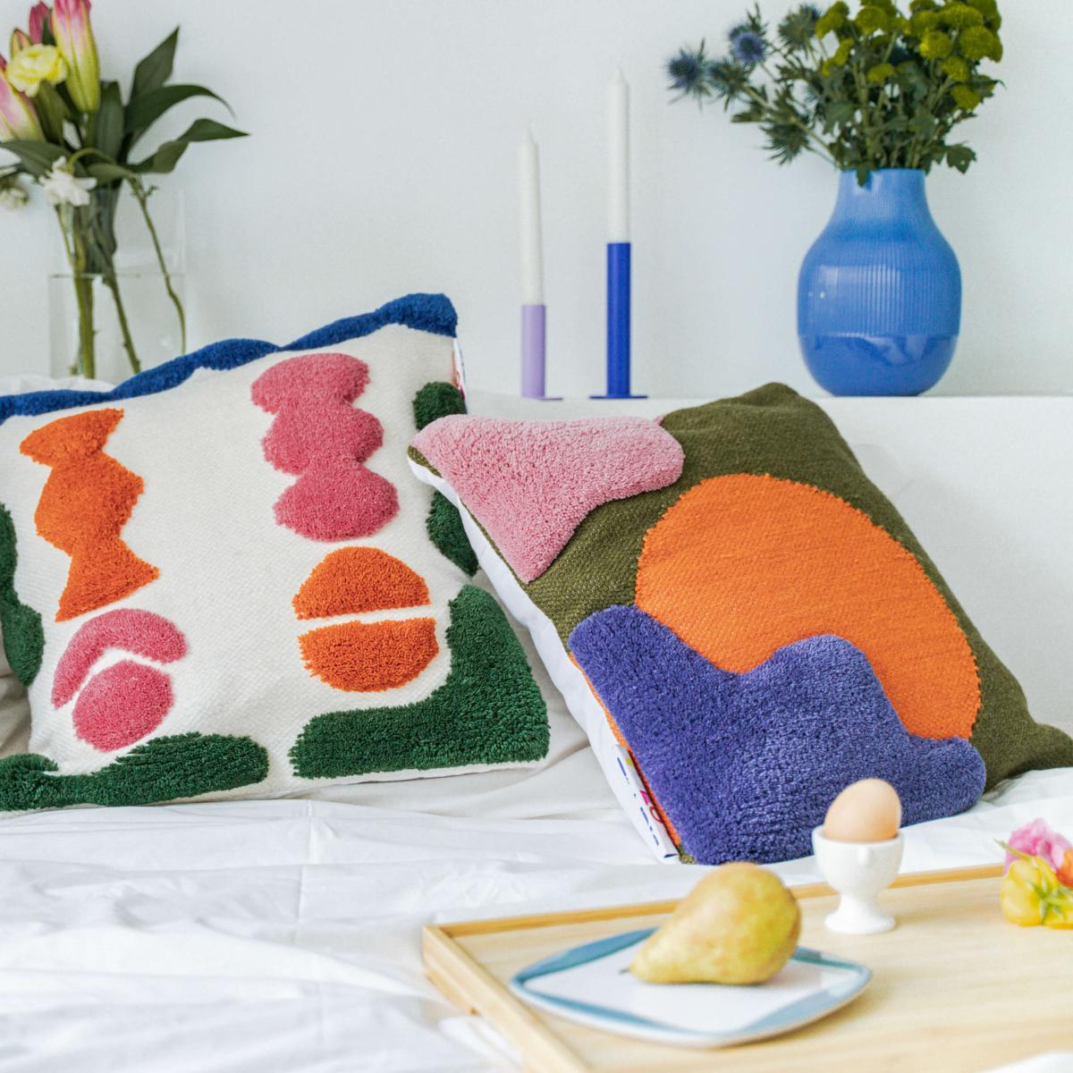 French design studio Color Therapis celebrates joy and creativity, drawing on the skills of quality craftsmanship. These brightly colored Cushions feature asymmetrical, three-dimensional patterns. Orange, red, pink and green are the colorimetric notes juxtaposed in Color. Therapis' work.