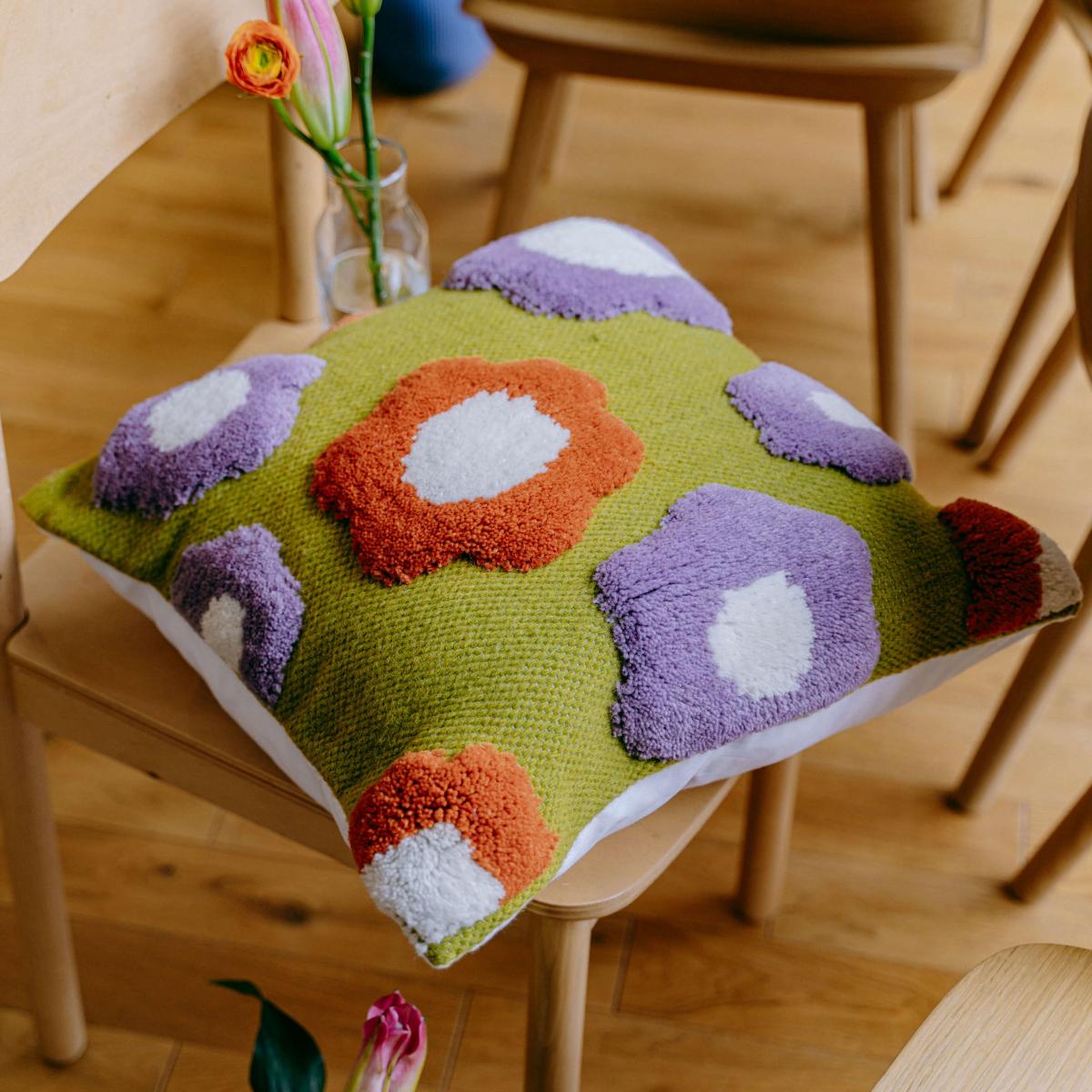 I love this purple flower cushion for adding a vibrant yet cosy touch to a variety of interiors. Its hand-woven recycled wool makes it both eco-friendly and tactile, perfect for bringing warmth to neutral sofas or armchairs. This cushion works well in contemporary, boho, or eclectic settings, where its bold floral pattern can serve as a focal point. For styling tips, try pairing it with neutral-toned textiles to make the colours pop, or mix with other textured cushions for an inviting layered look. Its versatile size makes it suitable for sofas, beds, or window seats, adding a splash of colour and personality wherever it’s placed.