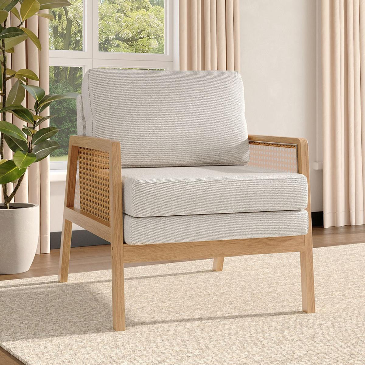 Introducing a stylish and inviting armchair from Livingandhome Direct, ideal for adding extra comfort and charm to living rooms, bedrooms, or any area of your home. The wooden frame is enhanced with detailed rattan work on both sides, offering a warm and rustic appeal that complements a variety of interior styles. Thoughtfully designed for comfort, this armchair feature deep cushioning and soft upholstery that provide a cozy seating experience. The sturdy wooden armrests add both support and a natural touch, making this chair a perfect blend of style and practicality for everyday use.