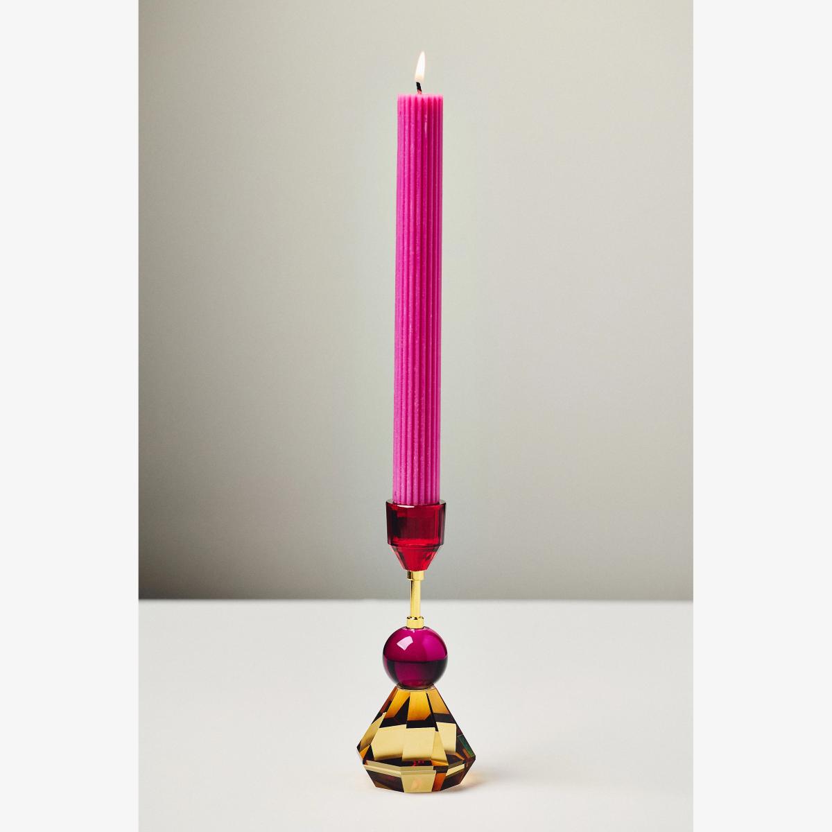 I love the cut glass candleholder’s bold, colourful design-it's perfect for adding a pop of colour to both contemporary and eclectic interiors. It works particularly well styled on a mantelpiece, side table, or as a centrepiece on a dining table, instantly elevating the space with its statement presence. For a more modern look, try pairing it with simple, neutral accessories to let the candleholder stand out. Practical tips include using a tall, slender candle like this to create height and visual interest, and placing it on non-flammable surfaces or with a candle snuffer nearby for safety. Its playful take on traditional candlesticks makes it a versatile piece that can complement colourful maximalist schemes or jazz up minimalist settings with a touch of vibrancy.
