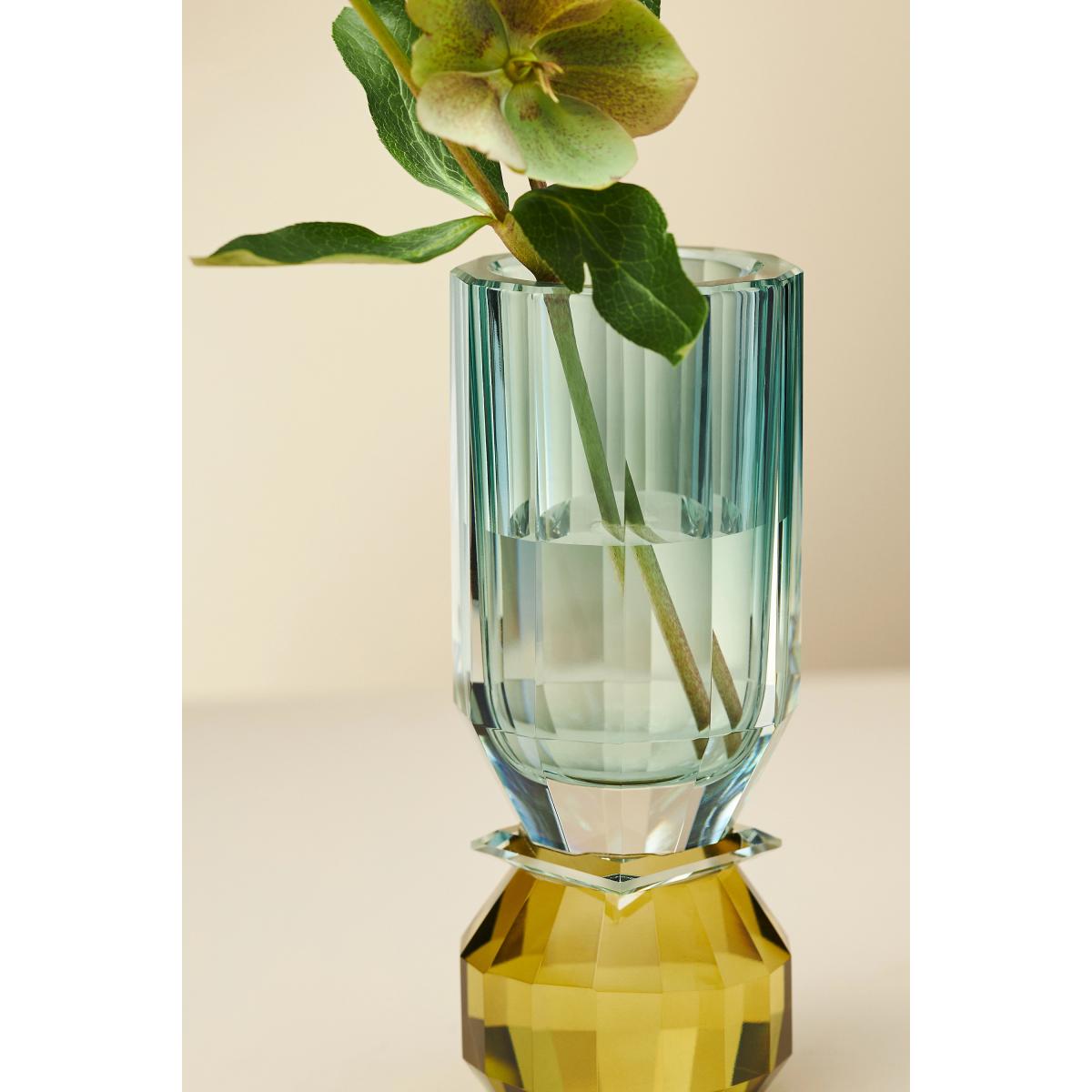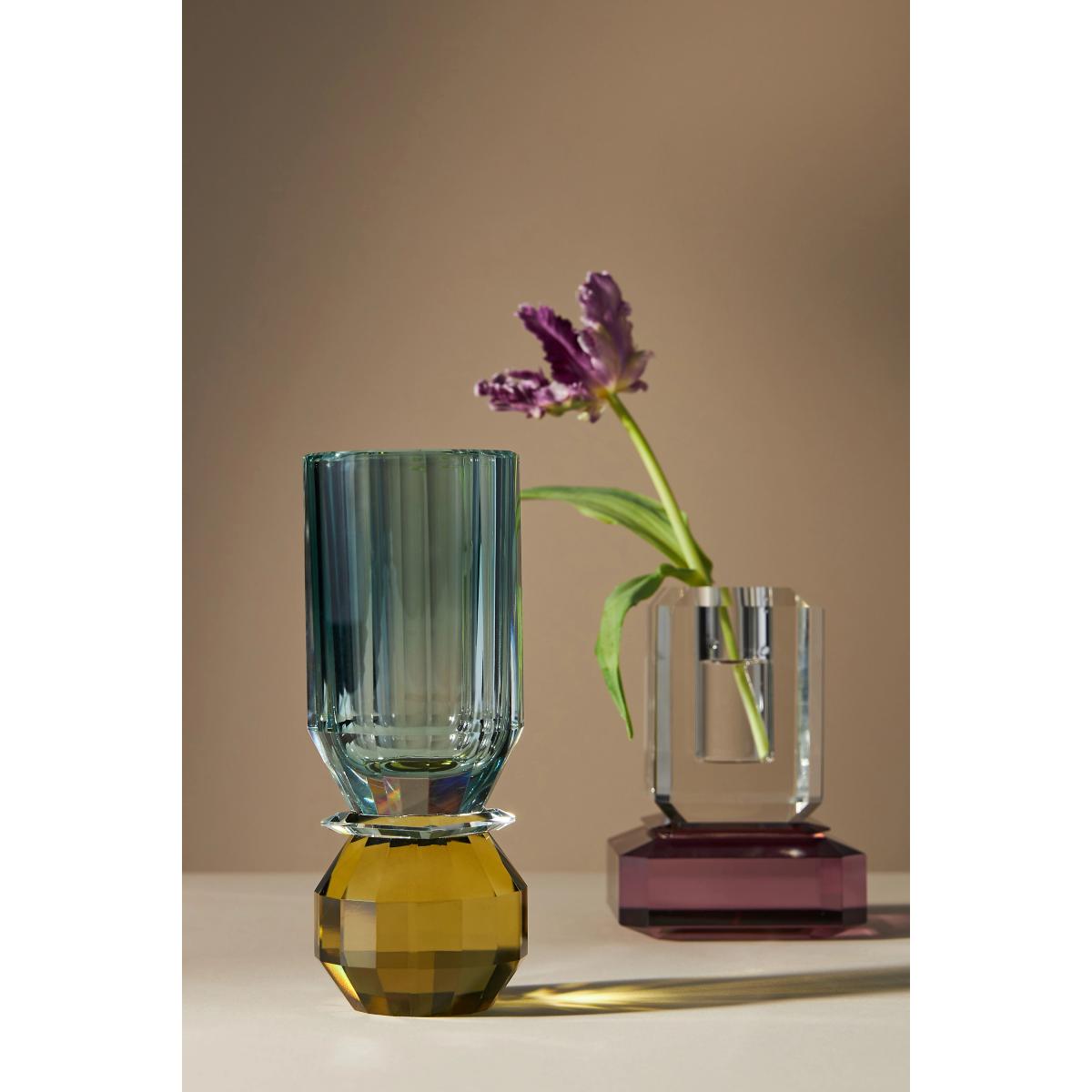 I love this piece because of its clean, geometric lines and subtle colour. It’s versatile enough to work in both modern and traditional interiors, adding a touch of elegance without overpowering the space. The cut glass vase is ideal for showcasing a simple, single stem or a small bouquet, which really highlights its craftsmanship. For styling tips, try pairing it with botanicals in soft, muted tones for a minimalist look, or cluster several in varying heights for visual interest on a mantel or side table. Its understated yet striking design makes it a great choice for adding a considered touch of colour and texture to your decor.