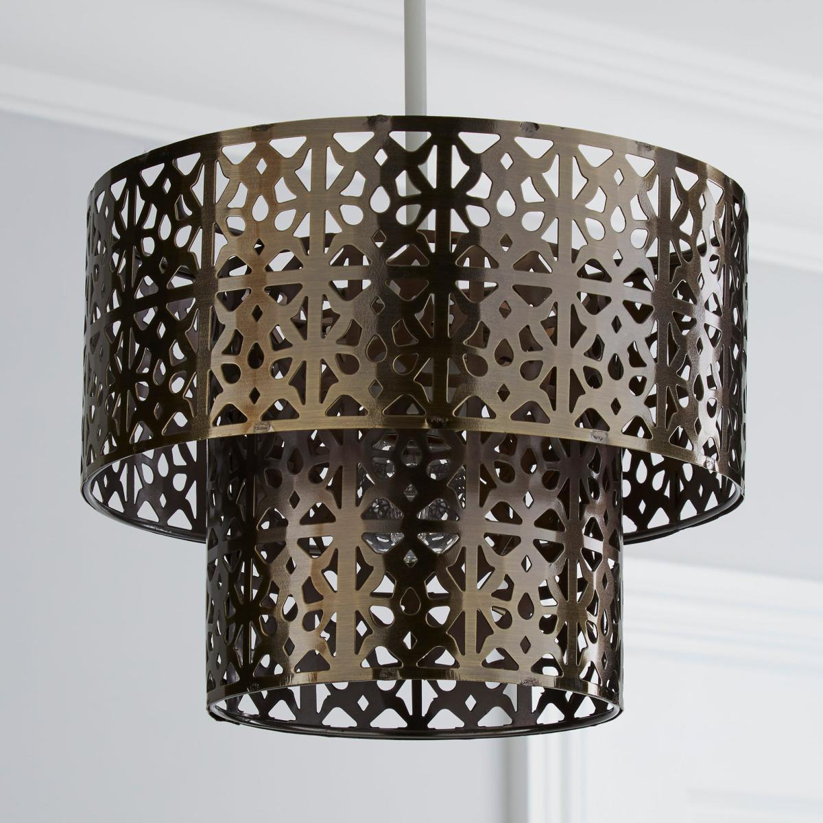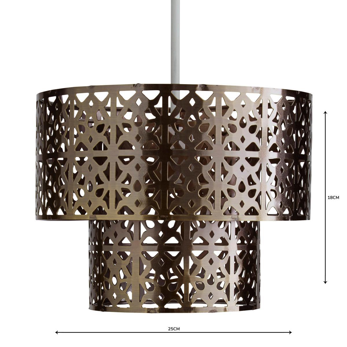 Designed with two tiers that each feature cut out detail, this antique brass ceiling light is inspired by a Moroccan theme. The intricate cut out detail will create a decorative and modern feel in any living space. Please note that this product requires one bulb. 60 Watt BC bulbs are recommended. Bulbs are not included with this product.
