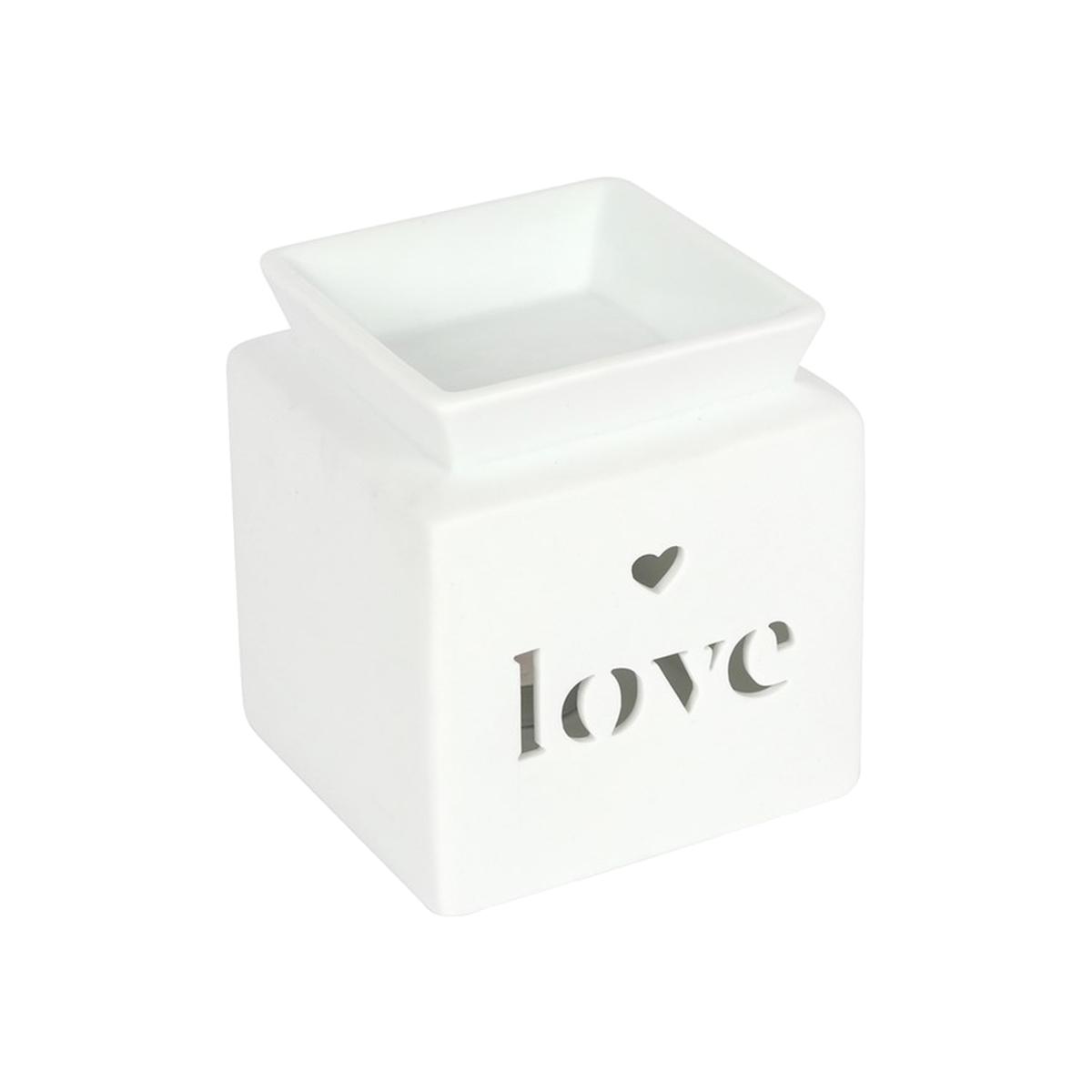 This white ceramic oil burner features a cutout heart and 'love' text in a cute, contemporary design. Place fragrance oil or wax melts into the built-in dish with a standard tealight inside to fill the home with calming fragrance.