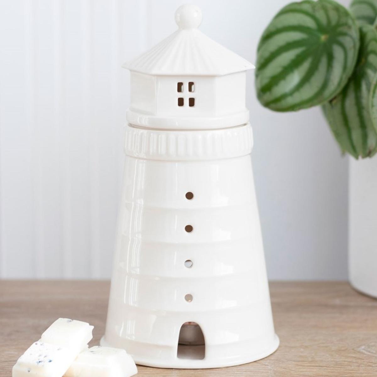 Decorate and scent your home with this unique white lighthouse oil and wax melt burner. Place a lit tealight inside to see a charming glow from the windows and remove the lighthouse lid to add your favourite home fragrance.