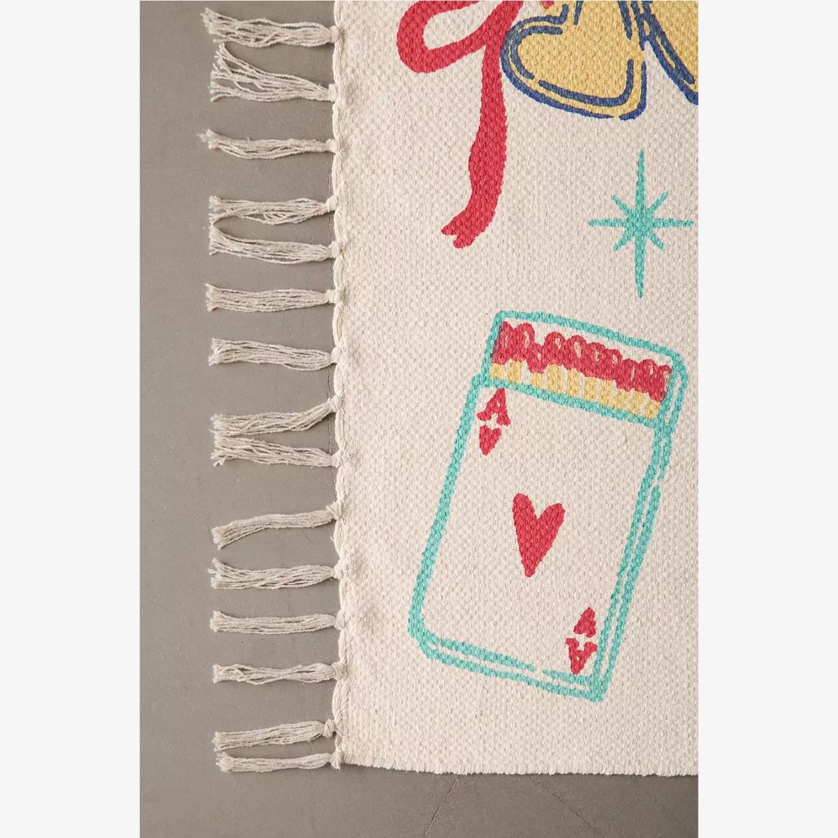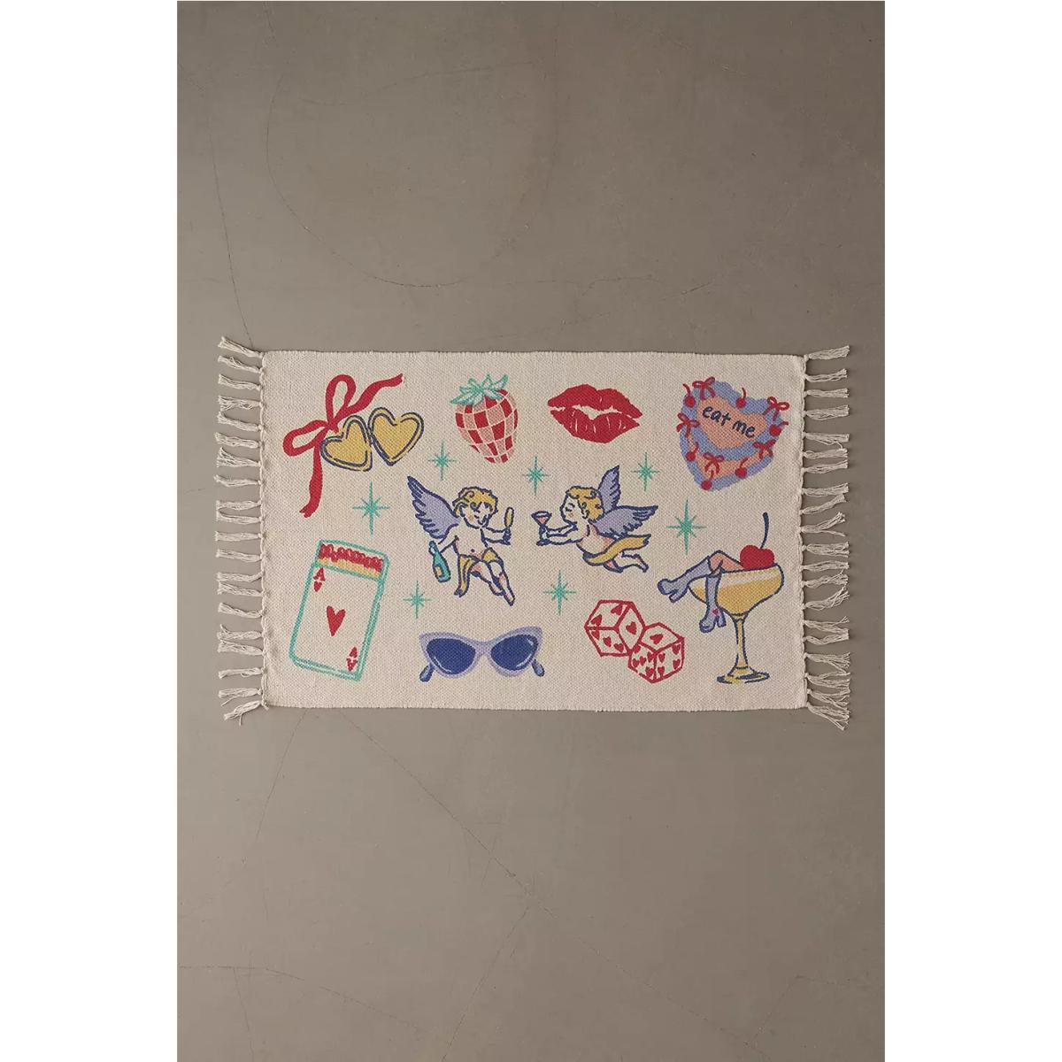 Playful rug topped with whimsical motifs including cherubs, dice and cake. Crafted from woven cotton complete with tasselled edges. **Content + Care** \- 100% Cotton \- Machine wash **Size** \- 61cm x 91.5cm (2ft x 3ft)