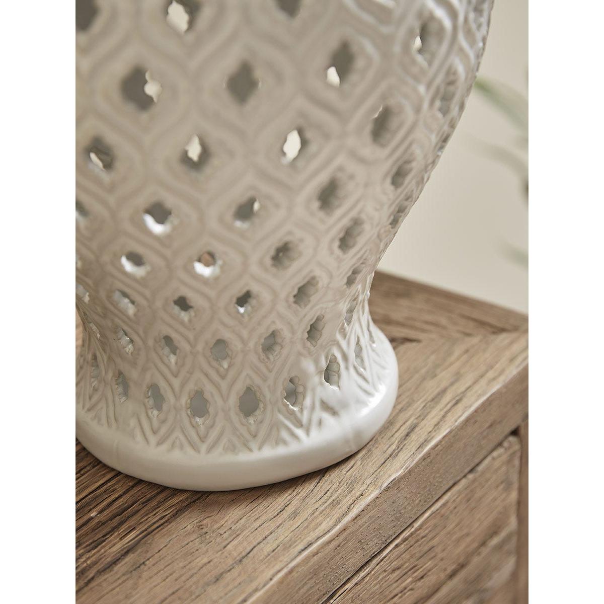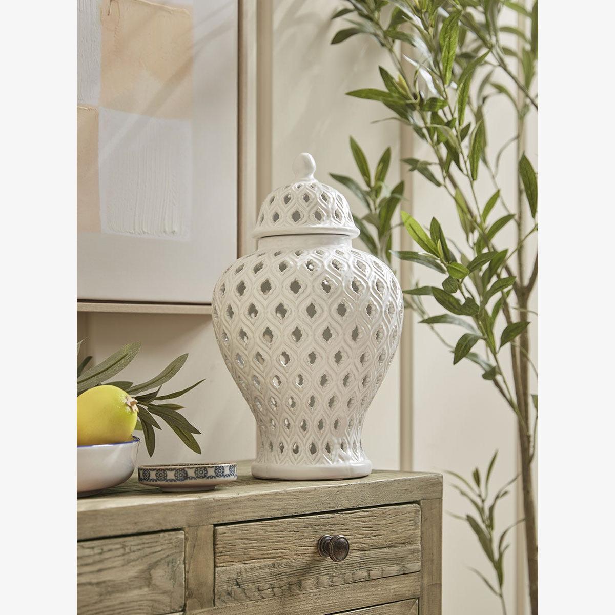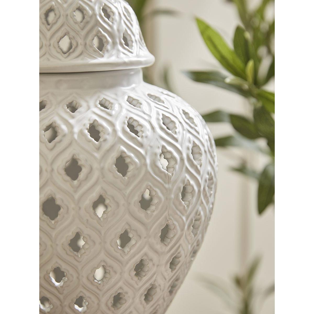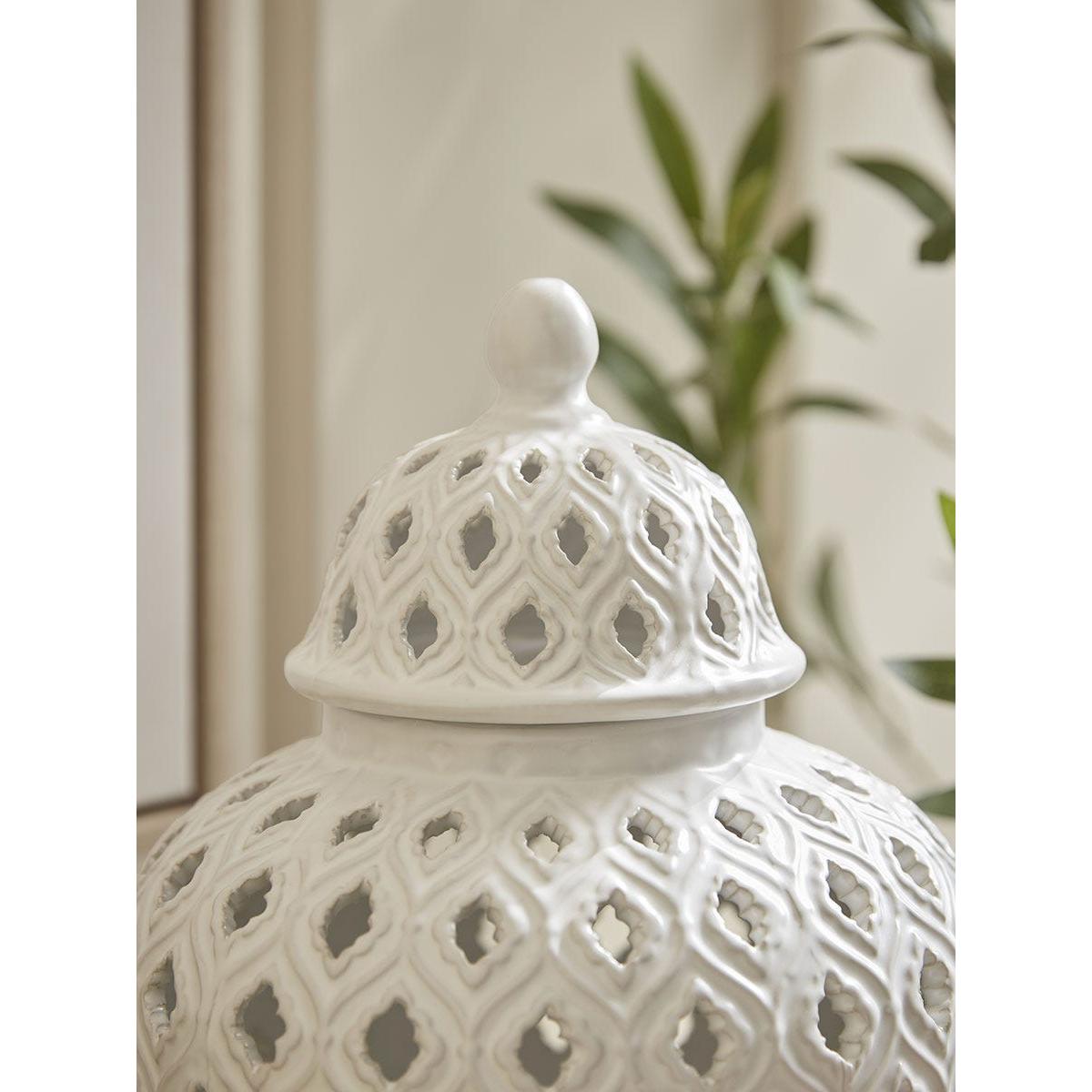For a delicate finishing touch on a shelving unit or on a sideboard, this ceramic ginger jar has a traditional urn shape. In a bright white that is sure to add a splash of neutral colour to your home, the filigree design offers a pretty finish to this simple ginger jar.