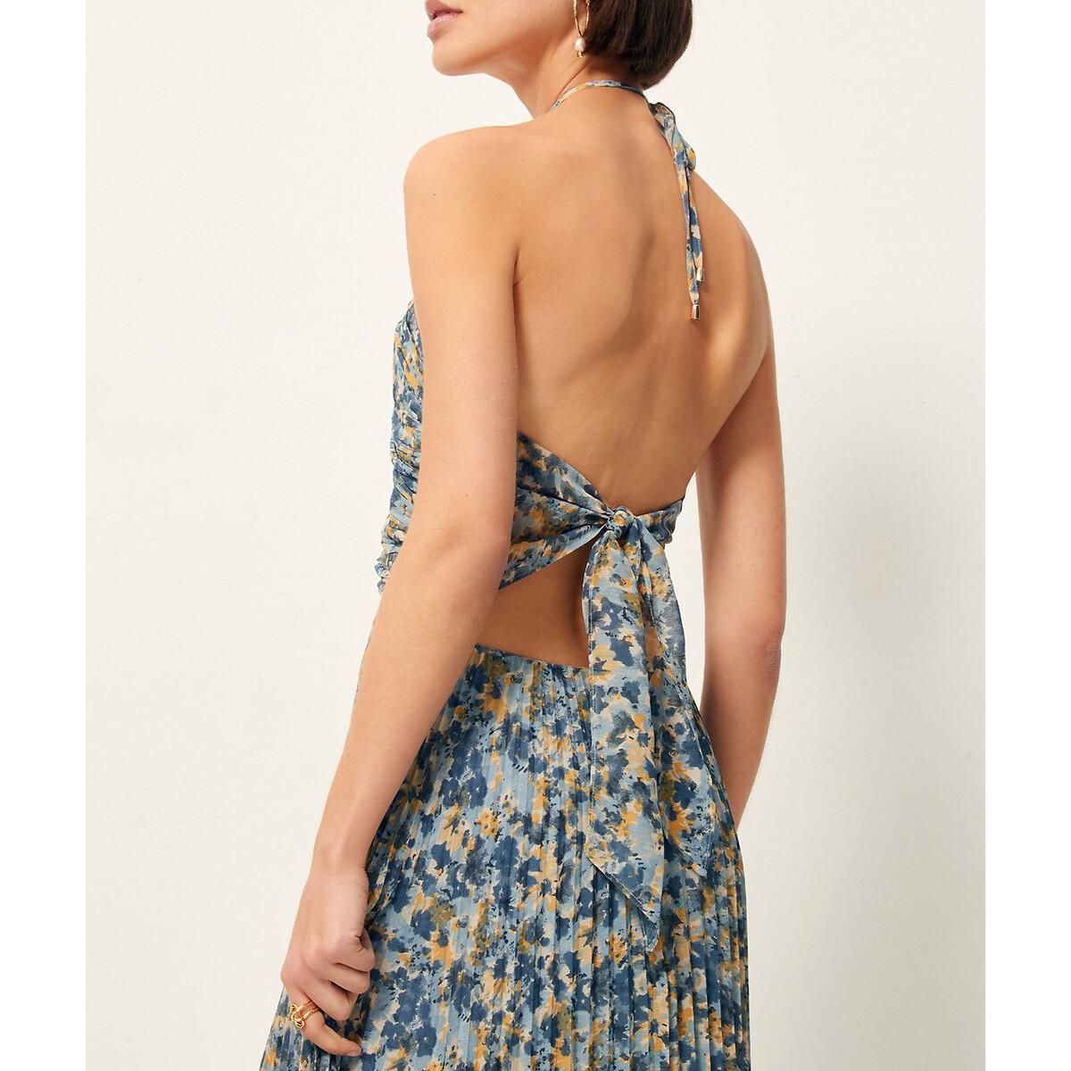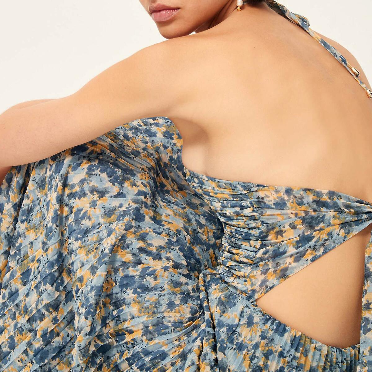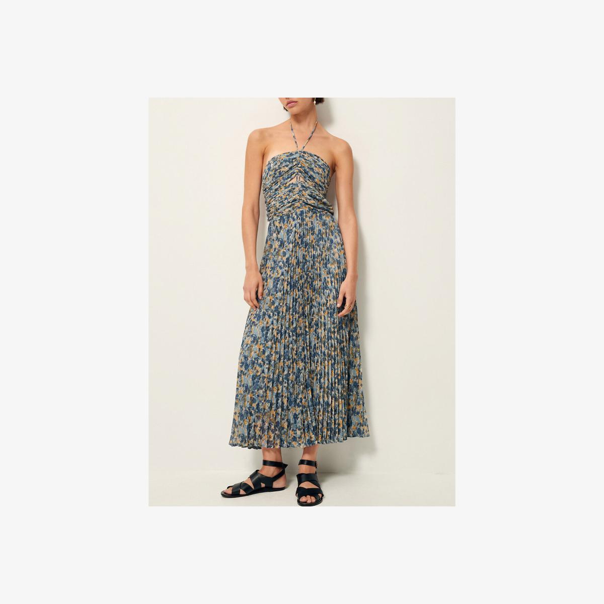 Cybella printed backless dress. This bustier style is pleated across the bodice, with a cased tie to adjust the ruched effect. This floral print summer dress is styled with a stunning halterneck look, accentuated by tie panels at the back. The full shape, pleated from the waist, brings added boho charm. Product details • Style: pleated • Maxi • Sleeveless • Collarless • Graphic print Fabric content and care advice • 100% recycled polyester • Please refer to the care instructions on the product label • Recycled polyester. Using recycled polyester is all about conserving resources and reducing waste.