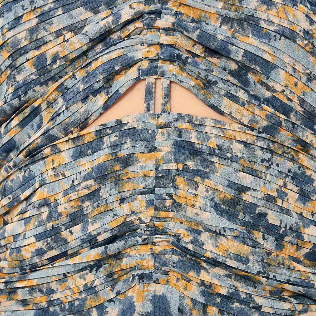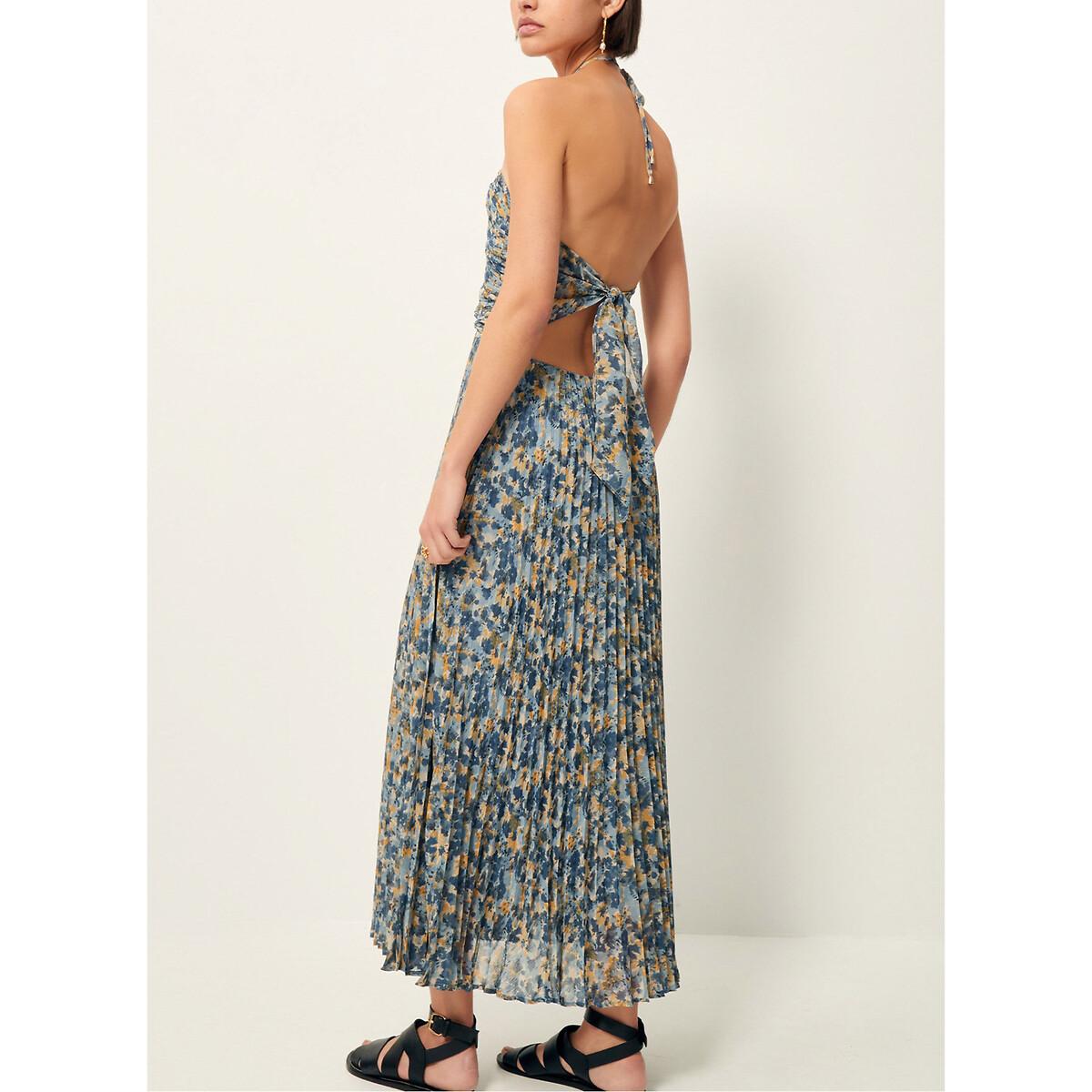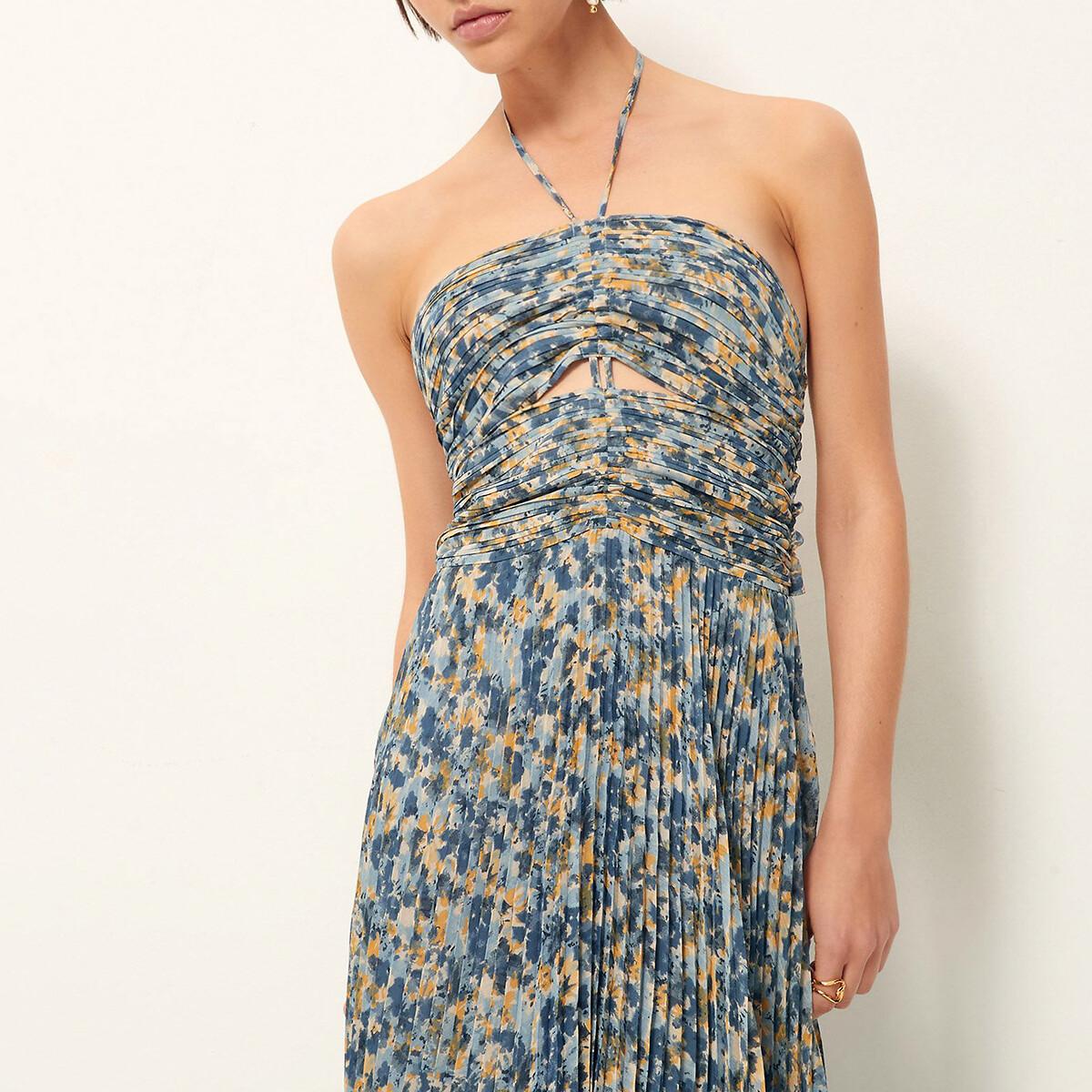Cybella printed backless dress. This bustier style is pleated across the bodice, with a cased tie to adjust the ruched effect. This floral print summer dress is styled with a stunning halterneck look, accentuated by tie panels at the back. The full shape, pleated from the waist, brings added boho charm. Product details • Style: pleated • Maxi • Sleeveless • Collarless • Graphic print Fabric content and care advice • 100% recycled polyester • Please refer to the care instructions on the product label • Recycled polyester. Using recycled polyester is all about conserving resources and reducing waste.