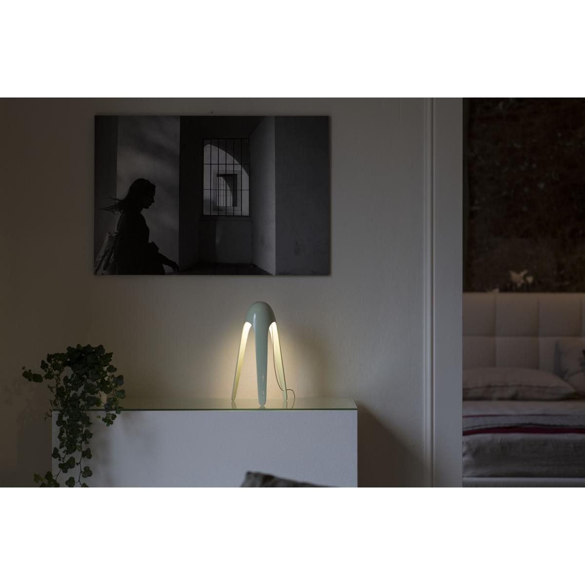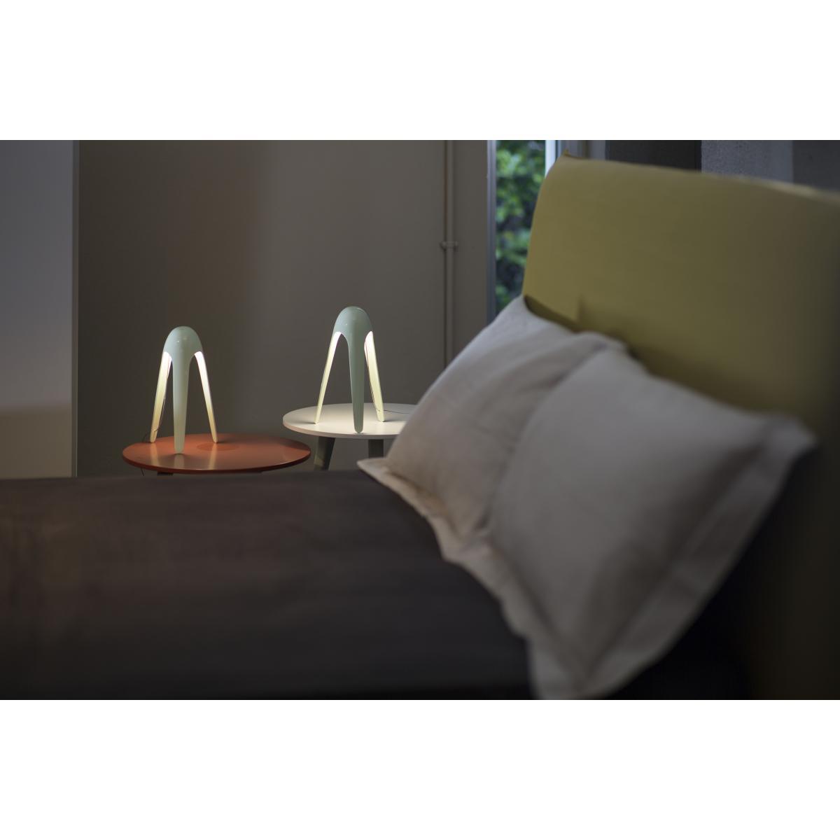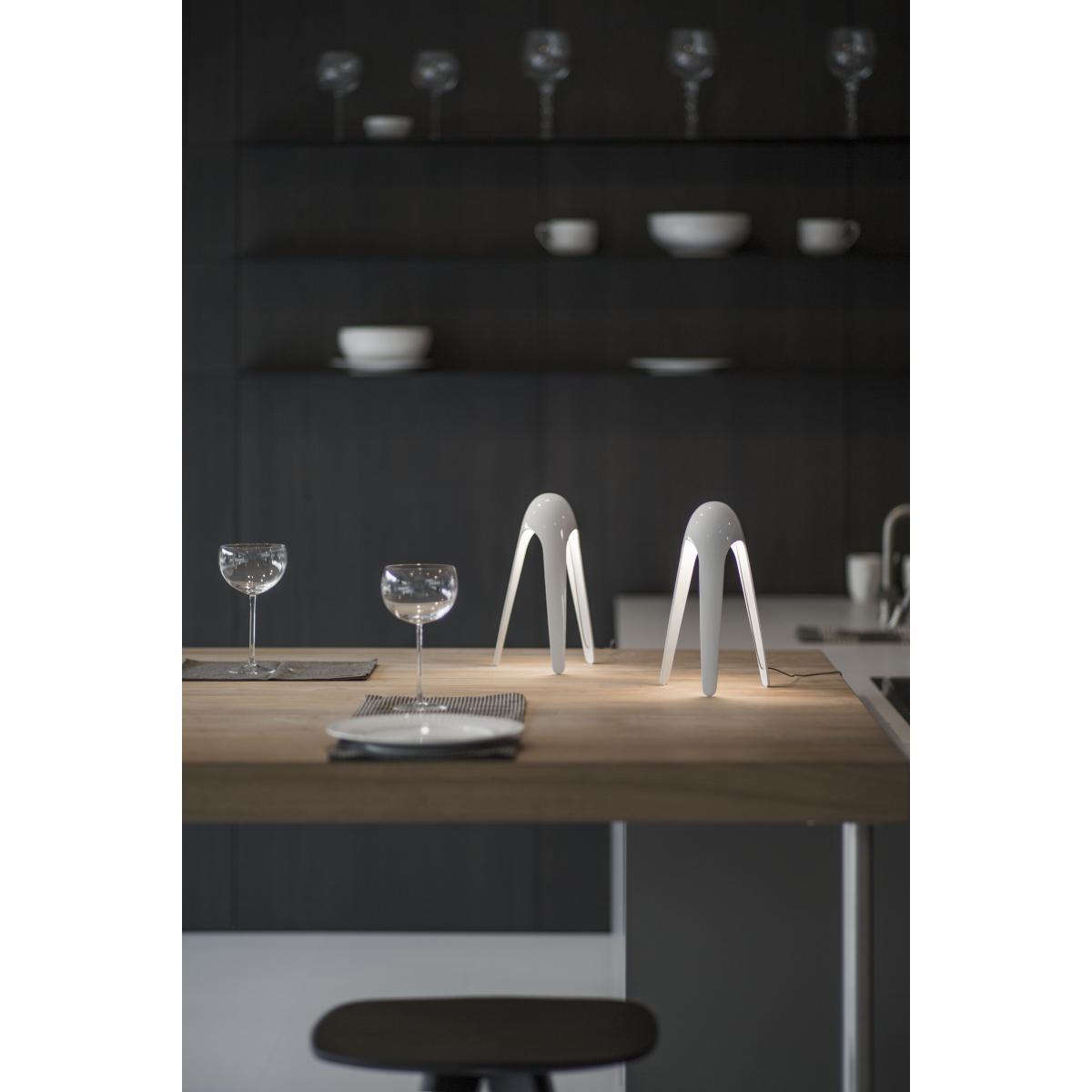 A futuristic and unusual style lamp with surprising biomorphic lines. Cyborg is a wonderful example of Karim Rashid's extravagant style. The sensual, soft lines break with our very strict and linear everyday environments. The resolutely modern design of this lamp uses the language of curves, close to the high-tech spirit, the aeronautical world as well as plant, animal and human shapes. Cyborg is made from a single moulded aluminium piece. Inside the dome, the opaline polycarbonate diffuser filters light for optimal and non glaring lighting. This lamp has a tactile switch: just touch the lamp body to turn the lamp on and off. For Karim Rashid, it is important that objects appeal to our sensual side, that it retains a certain truth and is not necessarily "over-embellished, the object needs to be human. That's what the designer means by "essensualism".
