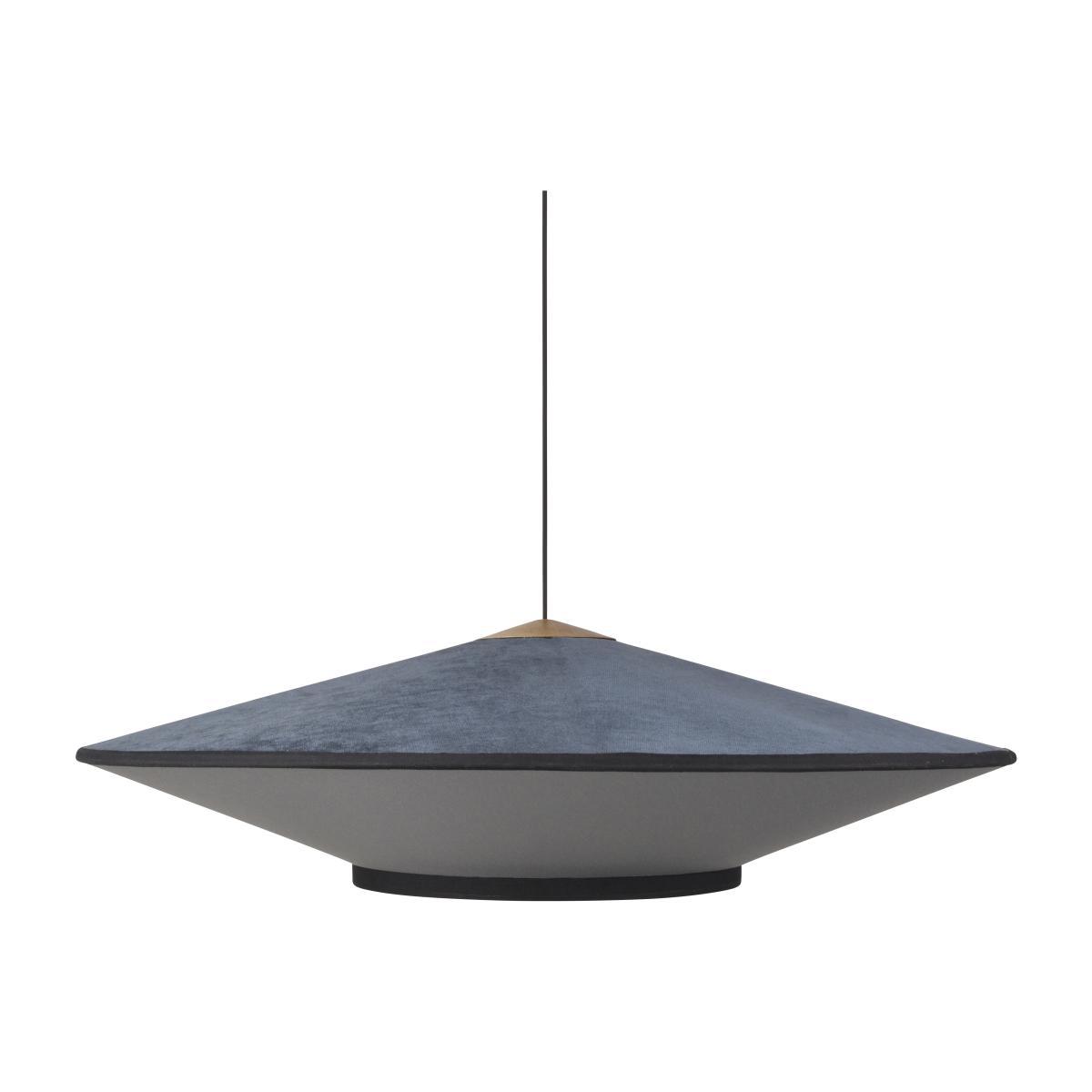 A refined, glamorous feel for this twin-material pendant, available in vibrant colour combinations. Looking like cymbals, its sleek, Japanese design possesses great expressive force. The upper part of the lampshade is covered with a luxurious velvet with a silky, warm touch. The bottom of the lampshade is made of fabric. It is Cymbal’s details that give it so much charm: the outline of the lampshade is highlighted by its elegant black fabric braid, giving it a couture feel. These black stripes emphasise the shade’s geometric shapes and reveal its volume. Above the lampshade, a piece of natural wood brings real sophistication to the whole thing. A superb pallet of intense colours gives this pendant real character and personality. Cymbal brings a chic, cosy touch to your home.