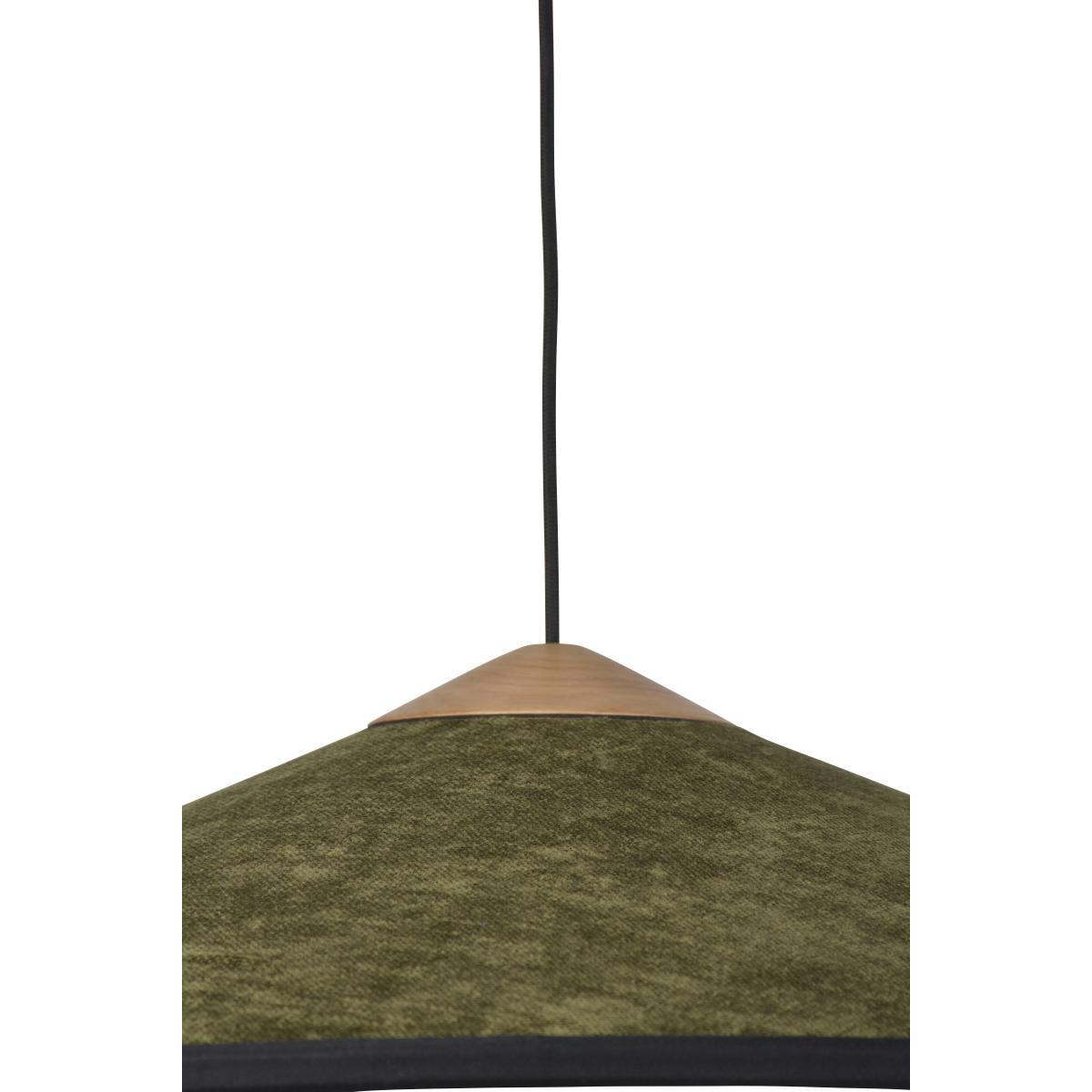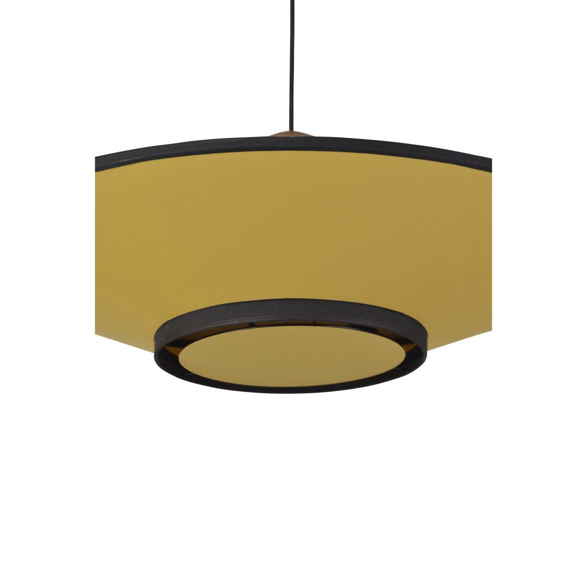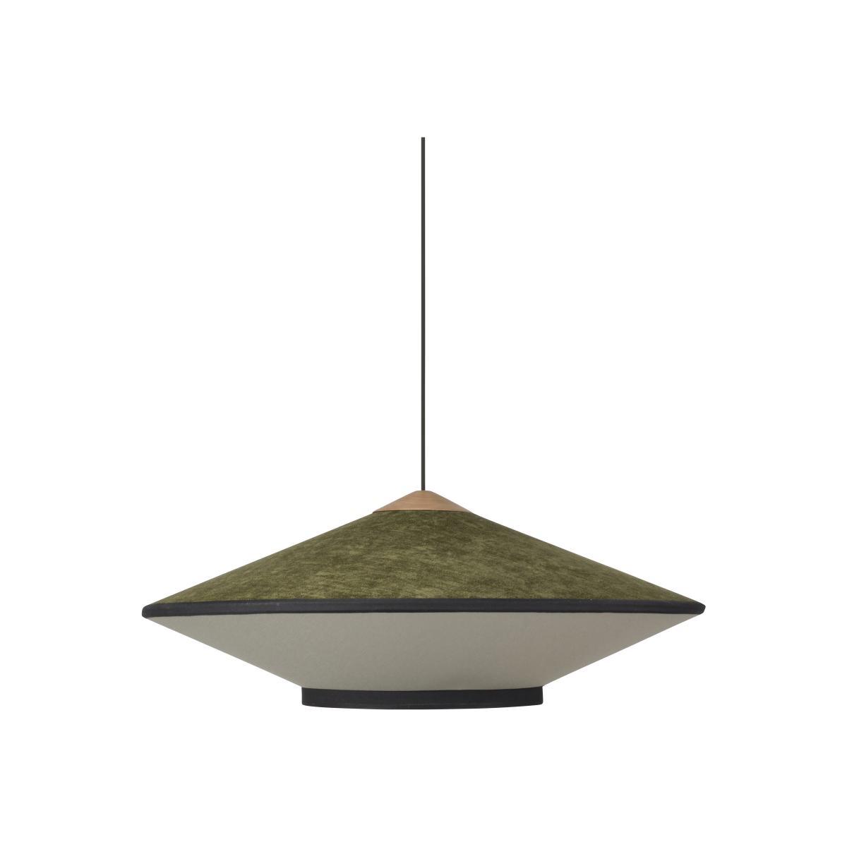A refined, glamorous feel for this twin-material pendant, available in vibrant colour combinations. Looking like cymbals, its sleek, Japanese design possesses great expressive force. The upper part of the lampshade is covered with a luxurious velvet with a silky, warm touch. The bottom of the lampshade is made of fabric. It is Cymbal’s details that give it so much charm: the outline of the lampshade is highlighted by its elegant black fabric braid, giving it a couture feel. These black stripes emphasise the shade’s geometric shapes and reveal its volume. Above the lampshade, a piece of natural wood brings real sophistication to the whole thing. A superb pallet of intense colours gives this pendant real character and personality. Cymbal brings a chic, cosy touch to your home.