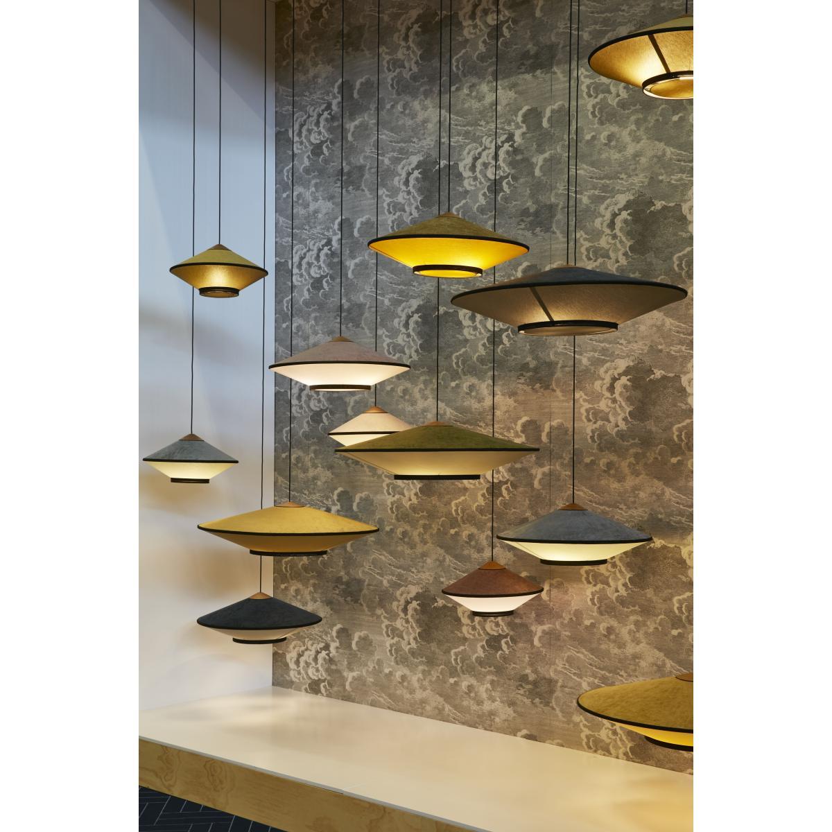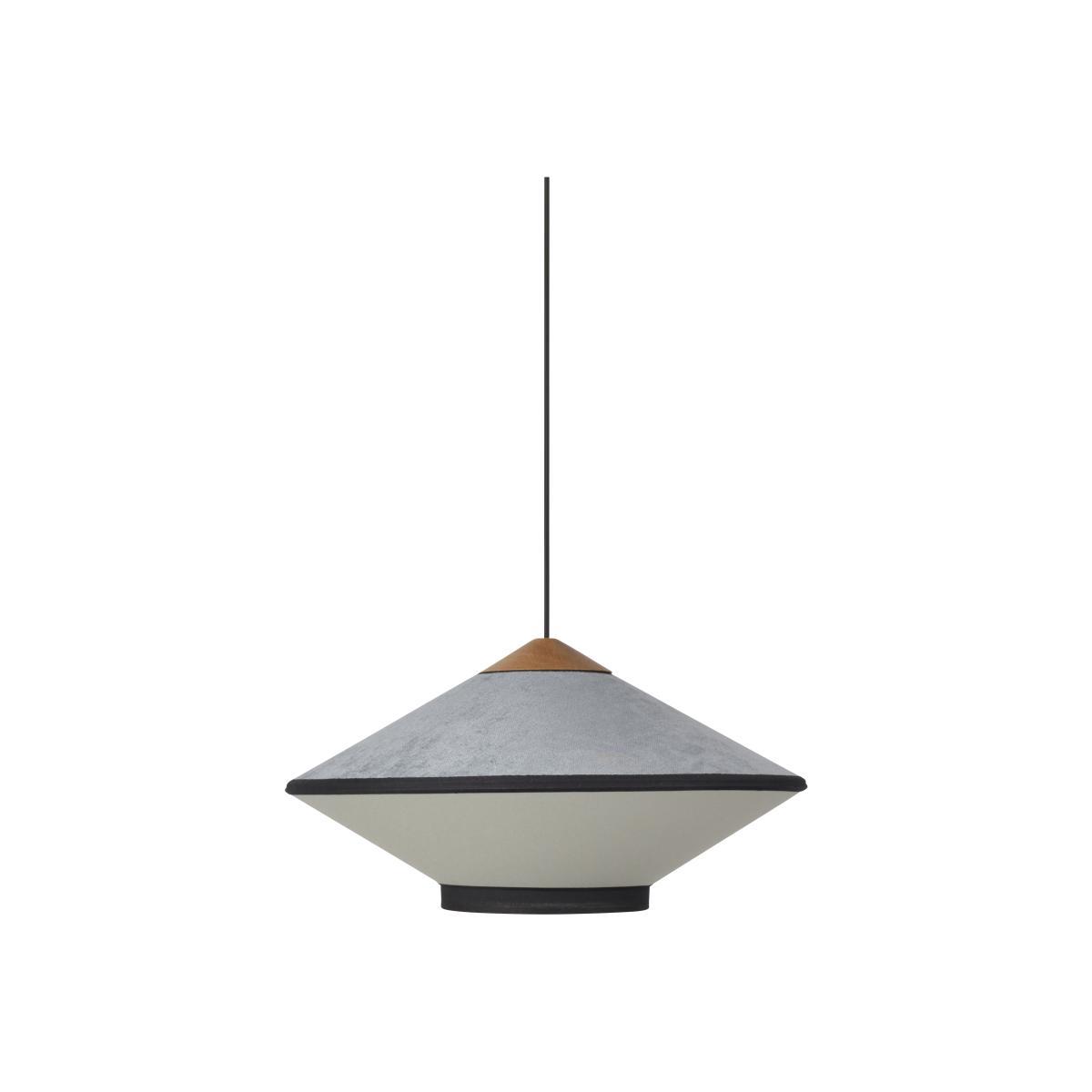 A refined, glamorous feel for this twin-material pendant, available in vibrant colour combinations. Looking like cymbals, its sleek, Japanese design possesses great expressive force. The upper part of the lampshade is covered with a luxurious velvet with a silky, warm touch. The bottom of the lampshade is made of fabric. It is Cymbal’s details that give it so much charm: the outline of the lampshade is highlighted by its elegant black fabric braid, giving it a couture feel. These black stripes emphasise the shade’s geometric shapes and reveal its volume. Above the lampshade, a piece of natural wood brings real sophistication to the whole thing. A superb pallet of intense colours gives this pendant real character and personality. Cymbal brings a chic, cosy touch to your home.