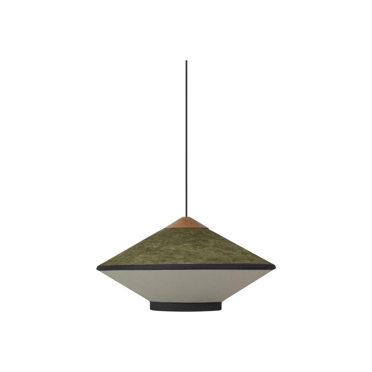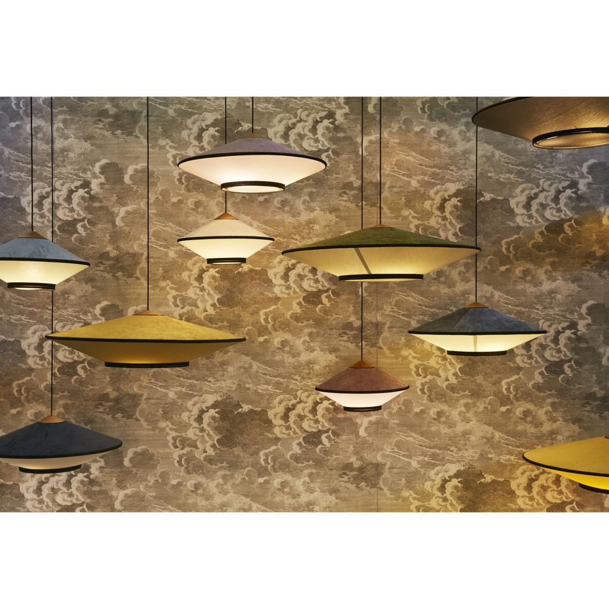 A refined, glamorous feel for this twin-material pendant, available in vibrant colour combinations. Looking like cymbals, its sleek, Japanese design possesses great expressive force. The upper part of the lampshade is covered with a luxurious velvet with a silky, warm touch. The bottom of the lampshade is made of fabric. It is Cymbal’s details that give it so much charm: the outline of the lampshade is highlighted by its elegant black fabric braid, giving it a couture feel. These black stripes emphasise the shade’s geometric shapes and reveal its volume. Above the lampshade, a piece of natural wood brings real sophistication to the whole thing. A superb pallet of intense colours gives this pendant real character and personality. Cymbal brings a chic, cosy touch to your home.