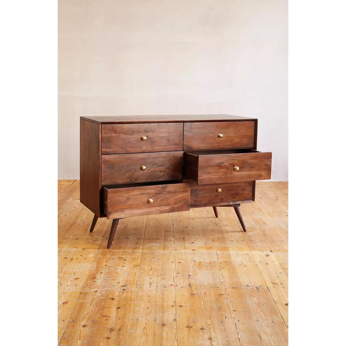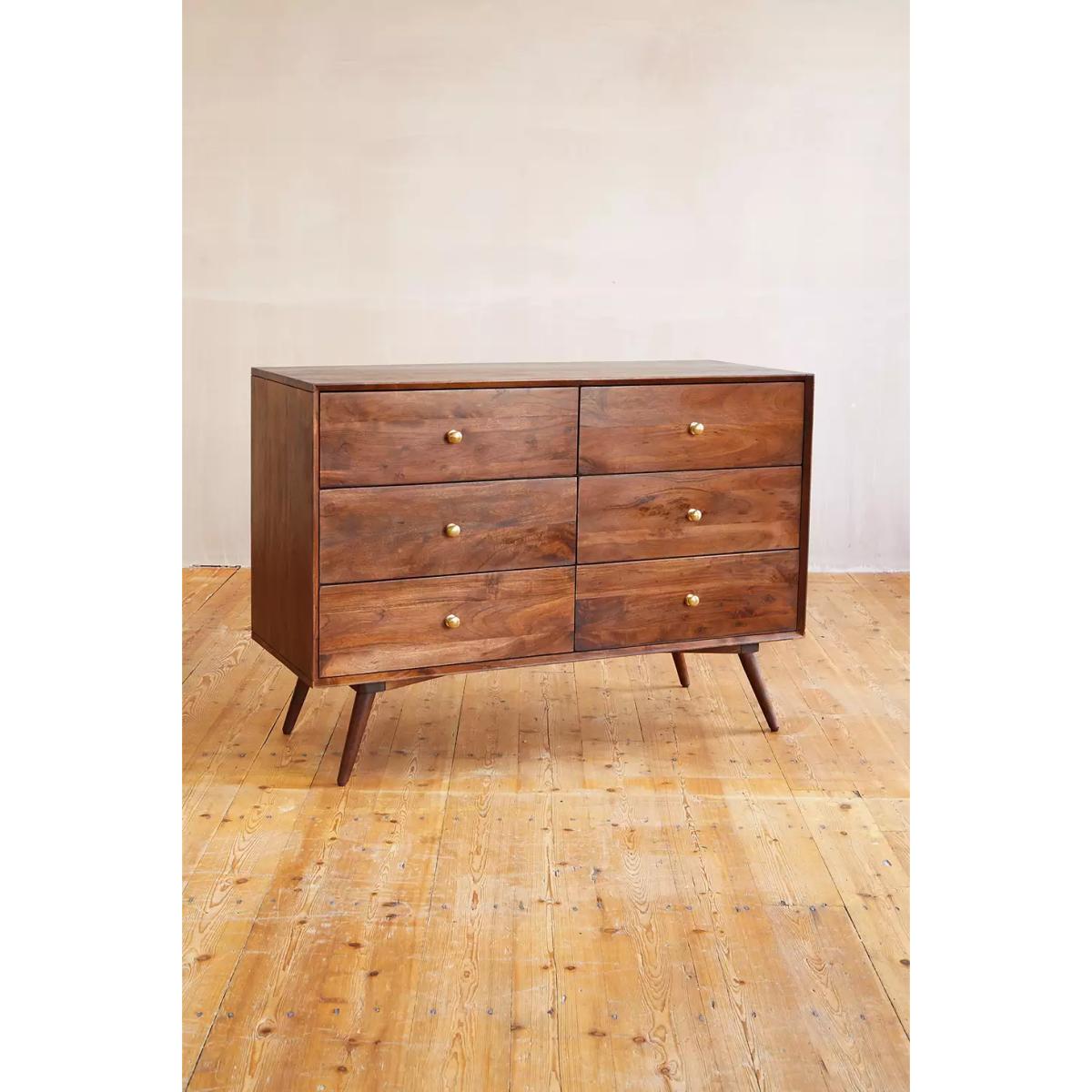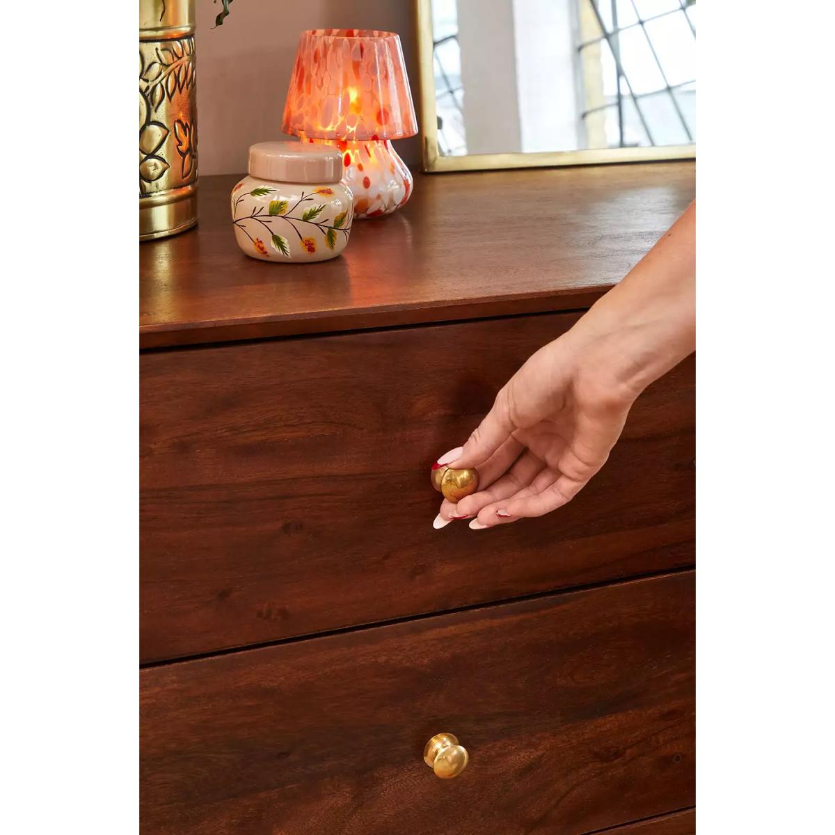 Store your clothes the mid-century way with the Cynthia dresser. Crafted from soft mango wood with an aged patina and brass handles. Sturdy rectangular dresser with six equal sized pull-out drawers and four angled legs creating a sturdy base. *Online return only. This item cannot be returned instore. Please note furniture items currently cannot be shipped to Northern Ireland or The Republic of Ireland. Delivery of large furniture items may take 1-2 weeks and are therefore not eligible for Next Day Delivery.* Instructions.pdf) and hardware included \- Mango wood \- Wipe clean **Size** \- Dimensions: 117cm x 45cm x 80cm \- Shipping container: 127cm x 55cm x 78cm