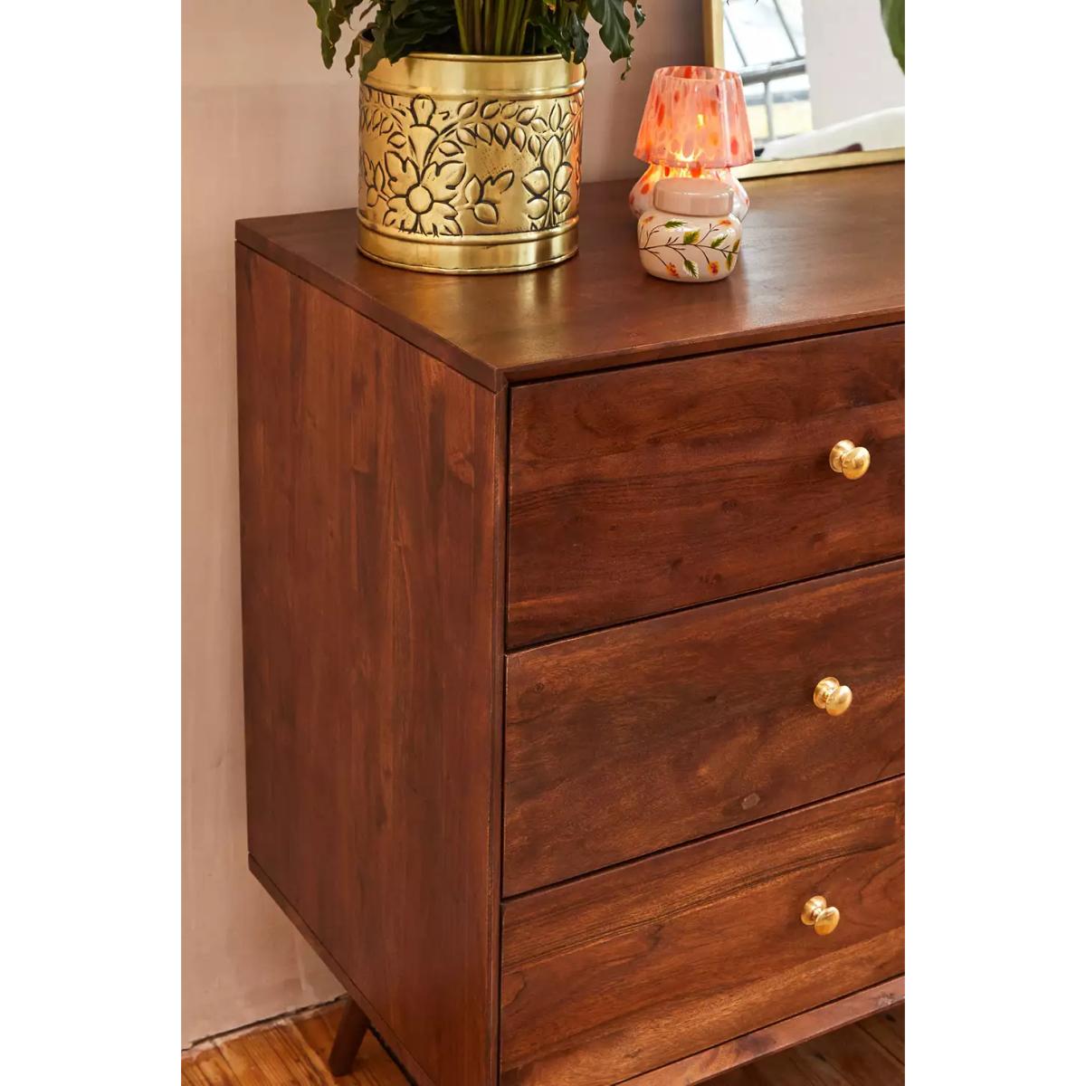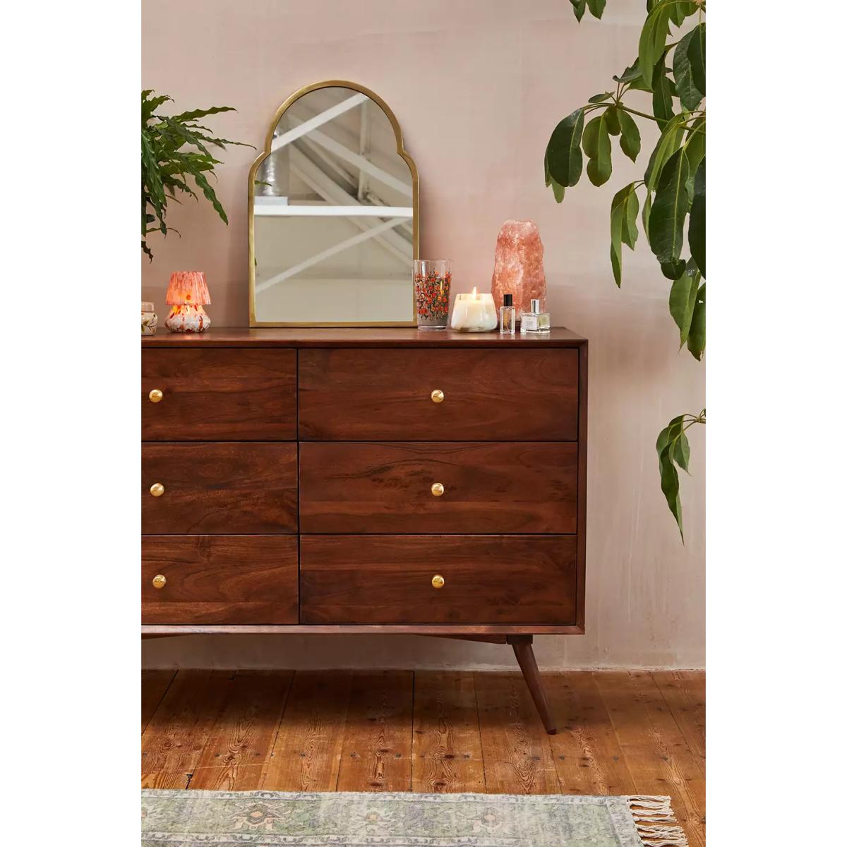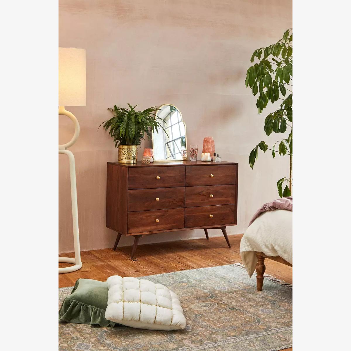 Store your clothes the mid-century way with the Cynthia dresser. Crafted from soft mango wood with an aged patina and brass handles. Sturdy rectangular dresser with six equal sized pull-out drawers and four angled legs creating a sturdy base. *Online return only. This item cannot be returned instore. Please note furniture items currently cannot be shipped to Northern Ireland or The Republic of Ireland. Delivery of large furniture items may take 1-2 weeks and are therefore not eligible for Next Day Delivery.* Instructions.pdf) and hardware included \- Mango wood \- Wipe clean **Size** \- Dimensions: 117cm x 45cm x 80cm \- Shipping container: 127cm x 55cm x 78cm
