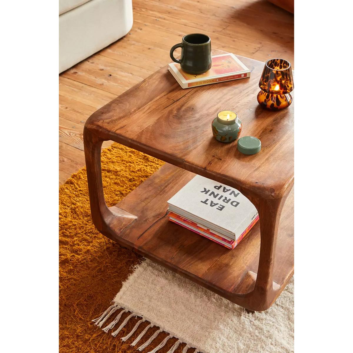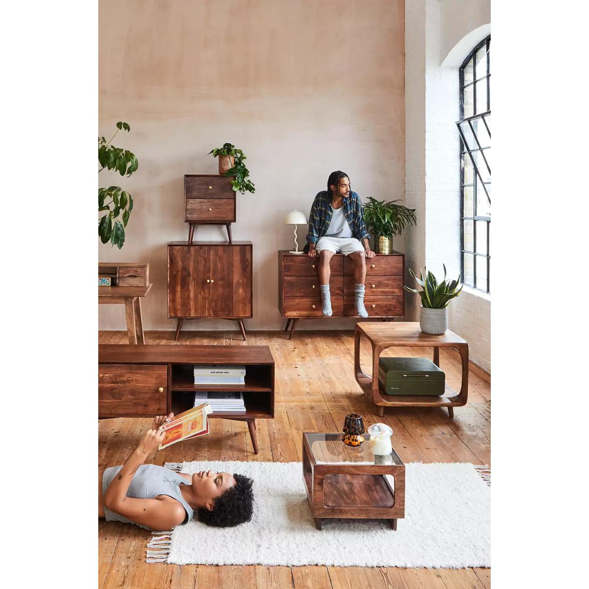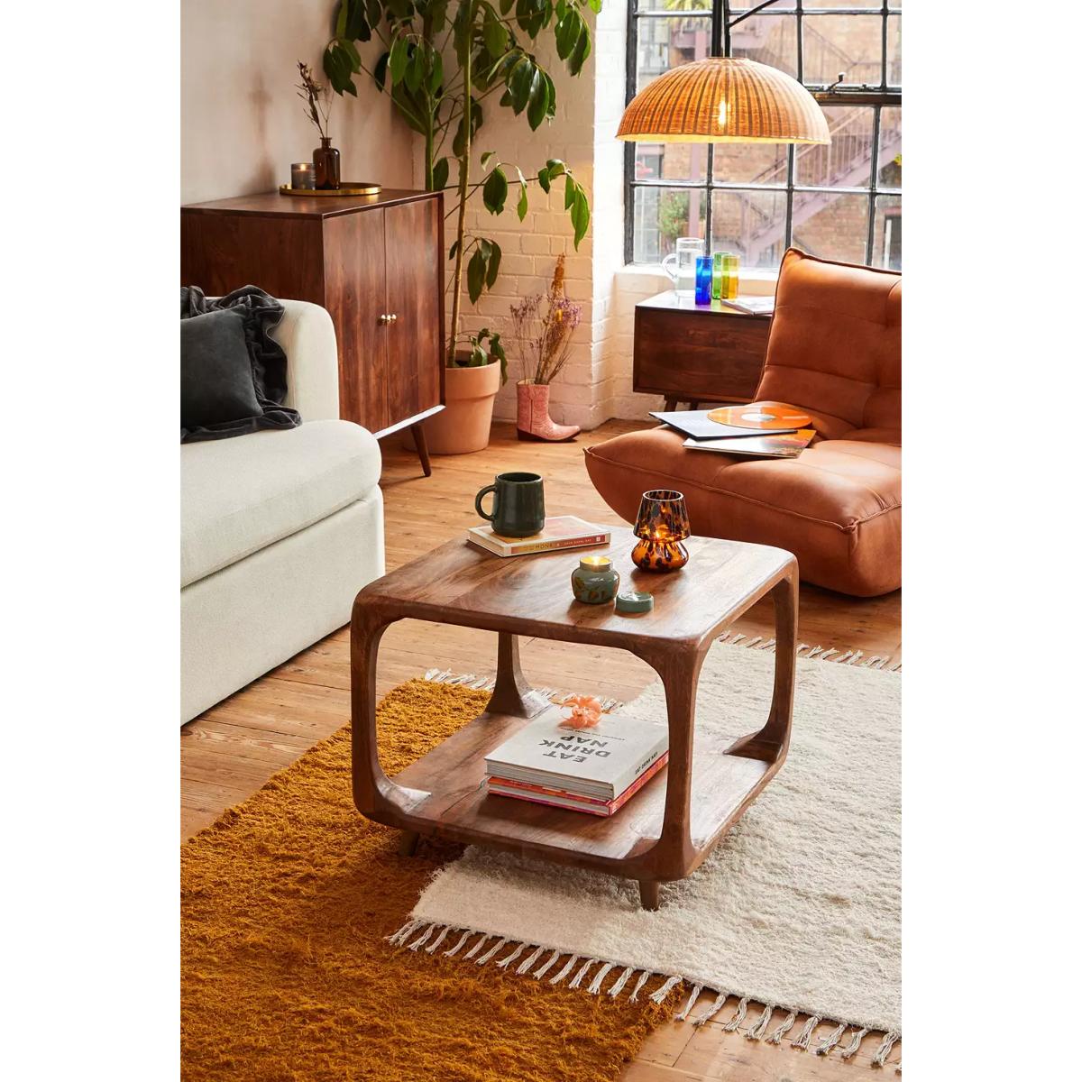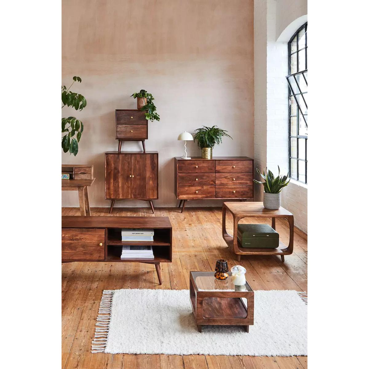 Bring some 1970s energy into your living space with this mid-century Cynthia coffee table. Crafted from soft mango wood with an aged patina finish, complete with rounded edges, a lower magazine shelf and a low, sturdy base with four legs. *Online return only. This item cannot be returned instore. Please note furniture items currently cannot be shipped to Northern Ireland or The Republic of Ireland. Delivery of large furniture items may take 2-3 weeks and are therefore not eligible for Next Day Delivery.* **Content + Care** \- Mango wood \- Wipe clean **Size** \- Dimensions: 60cm x 60cm x 48cm \- Shipping container: 70cm x 70cm x 58cm