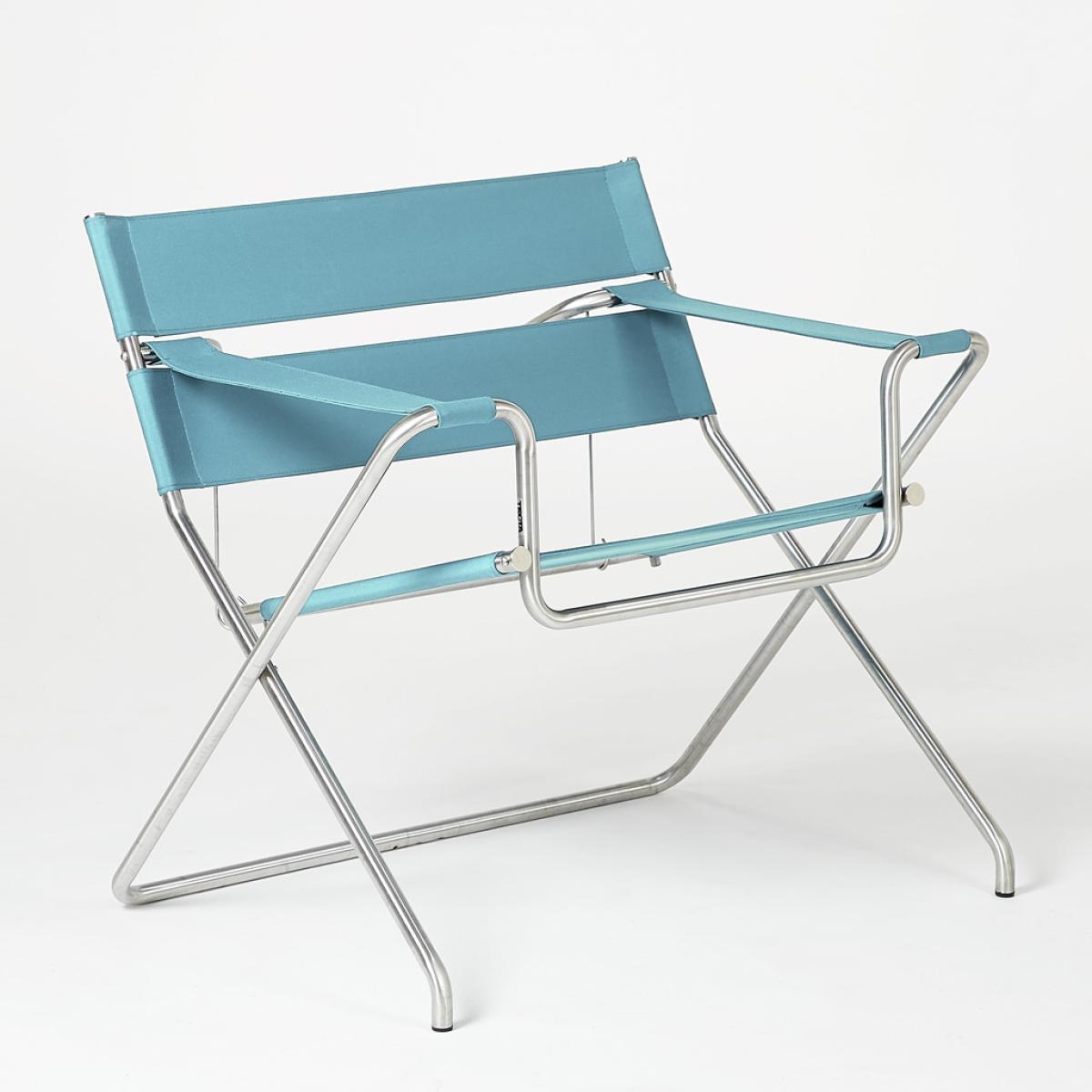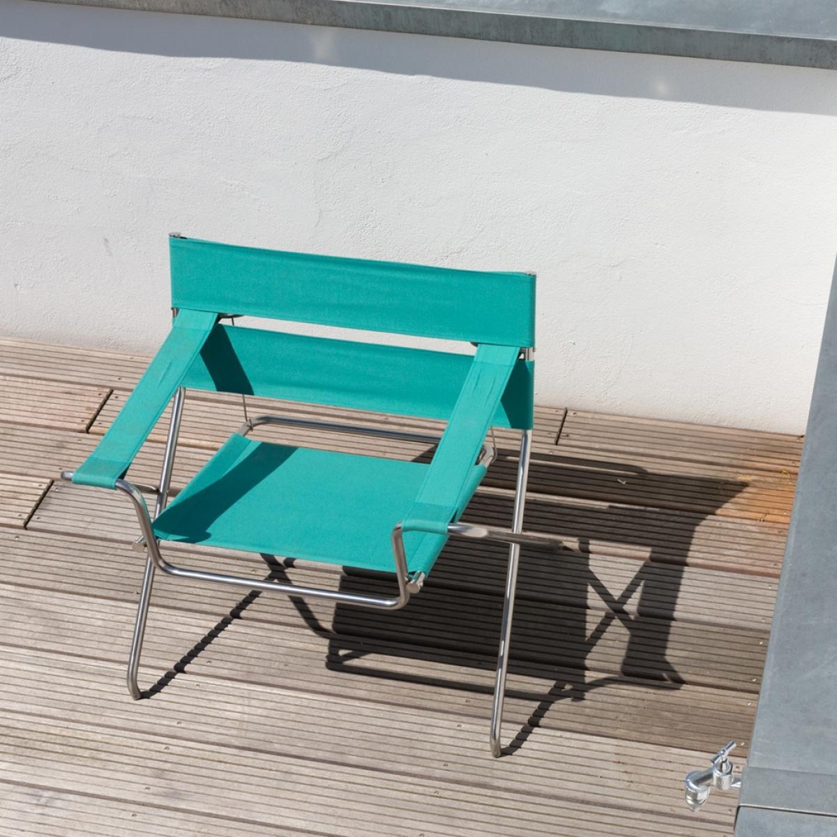 Originally known as the B4 Chair and designed by Marcel Breuer in 1926, the turquoise D4. E Folding Outdoor Chair is crafted today by esteemed manufacturer Tecta and is exclusively available in the UK at The Conran Shop. Showcasing a collapsible tubular brushed stainless steel frame that makes it the perfect addition to compact spaces, the statement chair features webbed upholstery for a comfortable sit. Crafted using a robust polyacrylic fabric in a vibrant turquoise hue, this chair would make a refined addition to any contemporary interior or exterior. Named after Breuer's contemporary, Wassily Kandinsky, and a true design classic, the D4. E Chair features in the permanent collections of many museums, including the Museum of Modern Art in New York. One of the Bauhaus' first students, Hungarian-born Marcel Breuer is widely considered one of the most popular and influential architects and furniture designers of the 20th century. Studying alongside and under design icons and artists such as Wassily Kandinsky, Walter Gropius, Paul Klee and Josef Albers, Breuer went on to become a figurehead of the modernist movement. Please note: Whilst this chair is suited to outdoor use it is not recommended that it be kept outside permanently.