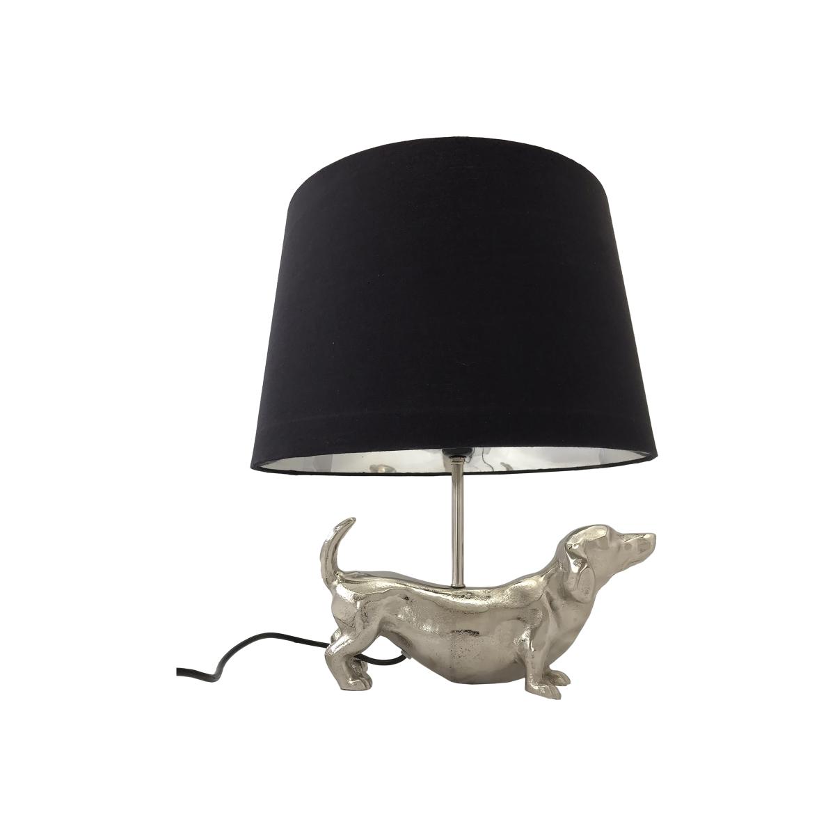 This delightful dachshund dog table lamp brings home character and charm. Perfect for a side table or console table, it’s handcrafted from metal and comes complete with a black linen shade. Why you'll love it. Charming dachshund table lamp is the perfect pick for any dog lover. Quirky yet elegant. Made from metal with a silver finish. Black linen shade included. Shade’s silvery metallic lining creates a lovely ambient glow. Handcrafted. This table lamp is part of the Furniture Village accessories collection. What you need to know. Base is made of aluminium. Linen shade with a metallic lining. Inline switch. 190 cm cable. Requires 40W E27 bulb, not supplied. Base dimensions. Height: 28 cm (12 in). Depth: 9 cm (4 in). Width: 34 cm (14 in). Shade dimensions. Height: 25 cm (10 in). Depth: 40 cm (16 in). Width: 40 cm (16 in).