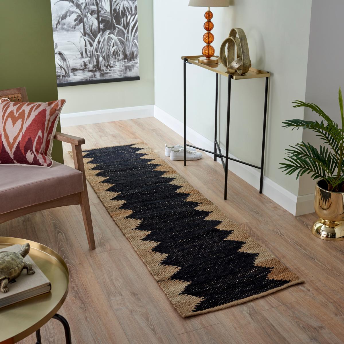I love this black and natural jute runner for its versatility and understated style. It works particularly well in contemporary and minimalist interiors, adding texture without overwhelming the space. It's a practical choice for busy hallways or entryways, as its durable material can handle foot traffic well. Styling tips include pairing it with neutral flooring and statement accessories, like a bold lamp or plant, to create a balanced look. Its classic colour combination also means it suits both modern and more eclectic schemes, making it a reliable yet stylish addition to many homes.