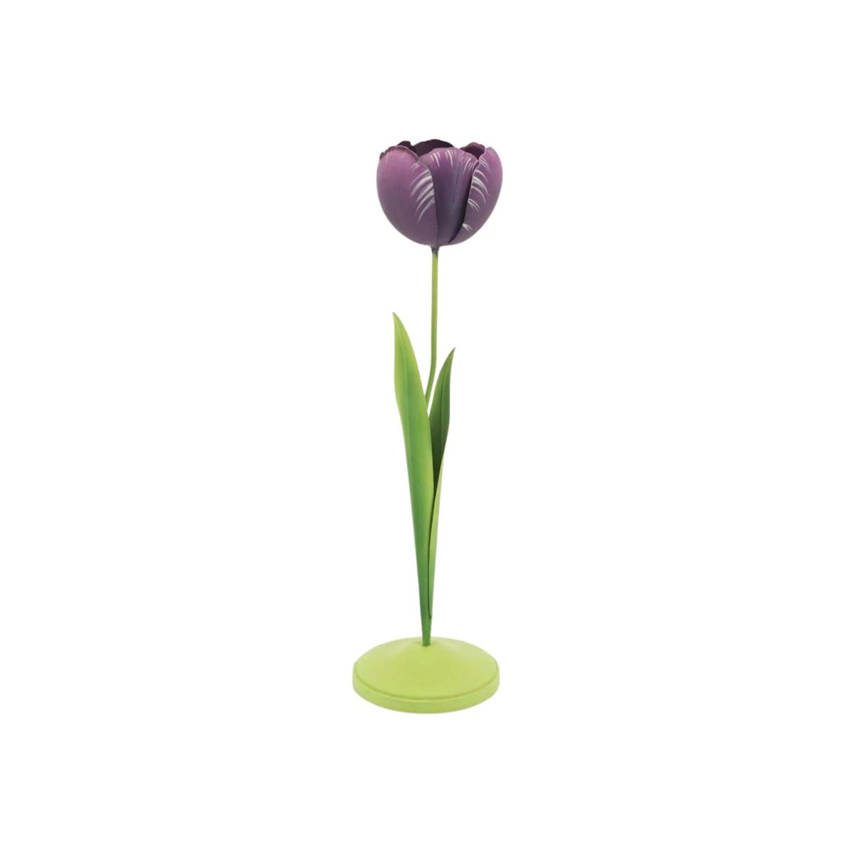 This elegant purple tole tulip-shaped candleholder adds a touch of botanical beauty to your decor. Its lifelike bloom and vibrant green stem sit atop a lime-green base, creating a striking contrast perfect for holding taper candles. Use it to bring a pop of spring color to your dining table, mantel, or as a unique accent piece in any room.