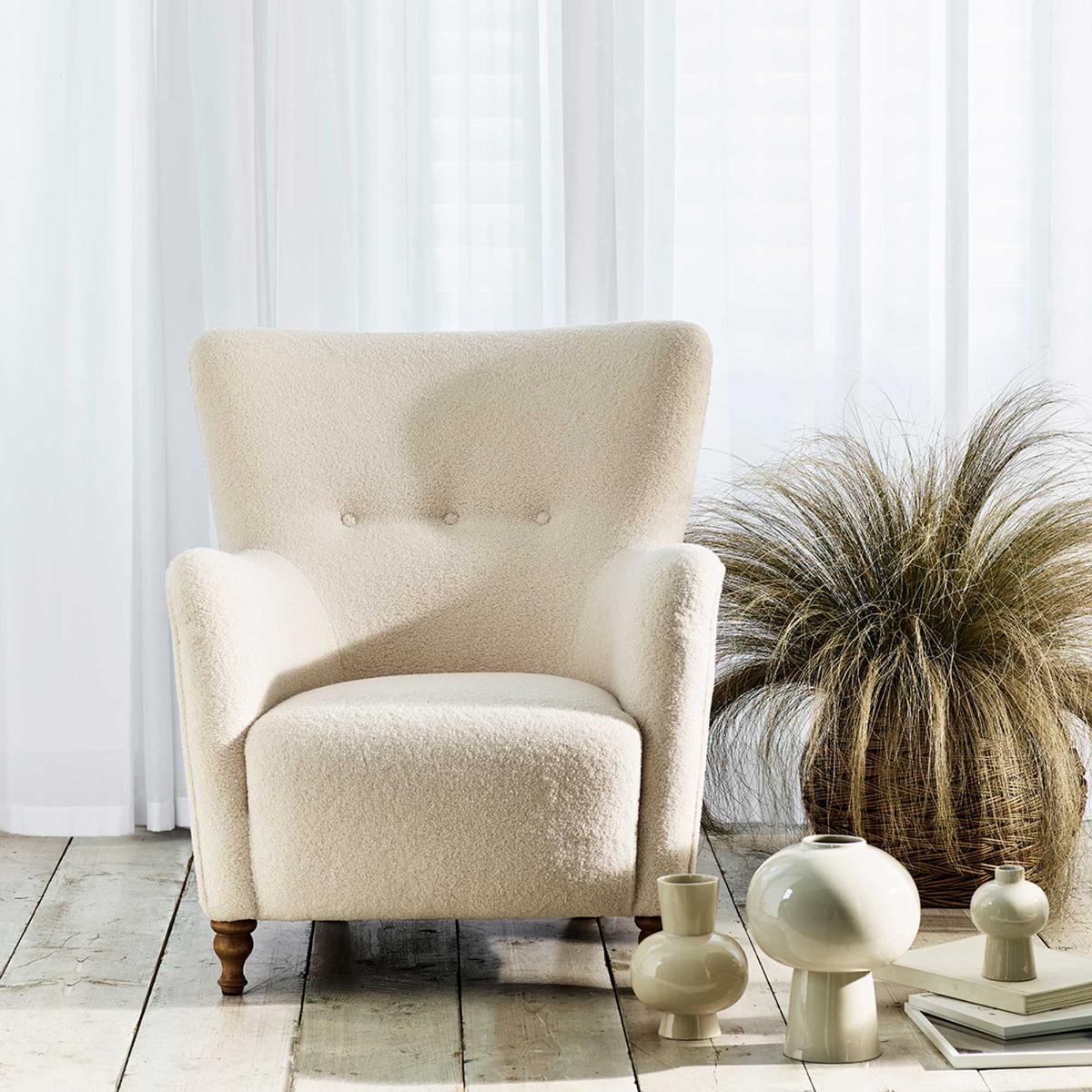 I’m a big fan of the Daisy chair for its simple silhouette and soft boucle-style upholstery - it feels both contemporary and comfortably classic. The neutral colour makes it a versatile pick, so it slips easily into Scandi-inspired living rooms, country cottages or even pared-back modern schemes. For styling, pair it with a slim-legged side table and a small, low-pile rug to keep the look light. A contrasting lumbar cushion in a tactile fabric (think linen or velvet) will add depth, while a folded wool throw casually draped over one arm creates a relaxed, lived-in feel. Place it by a window or next to a floor lamp to set up a cosy reading corner without overwhelming the room.